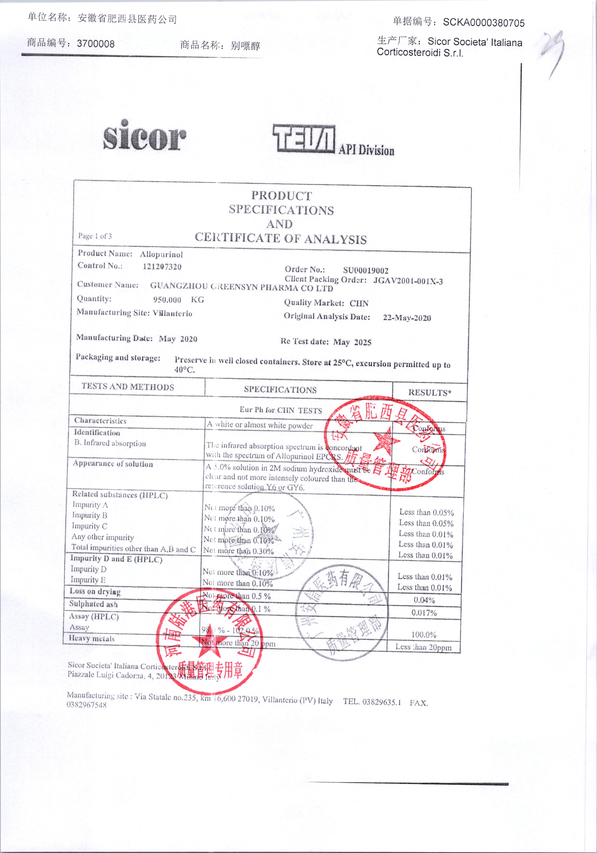 | 別嘌醇 | 25kg | 121207120/3 | 查看詳情 |