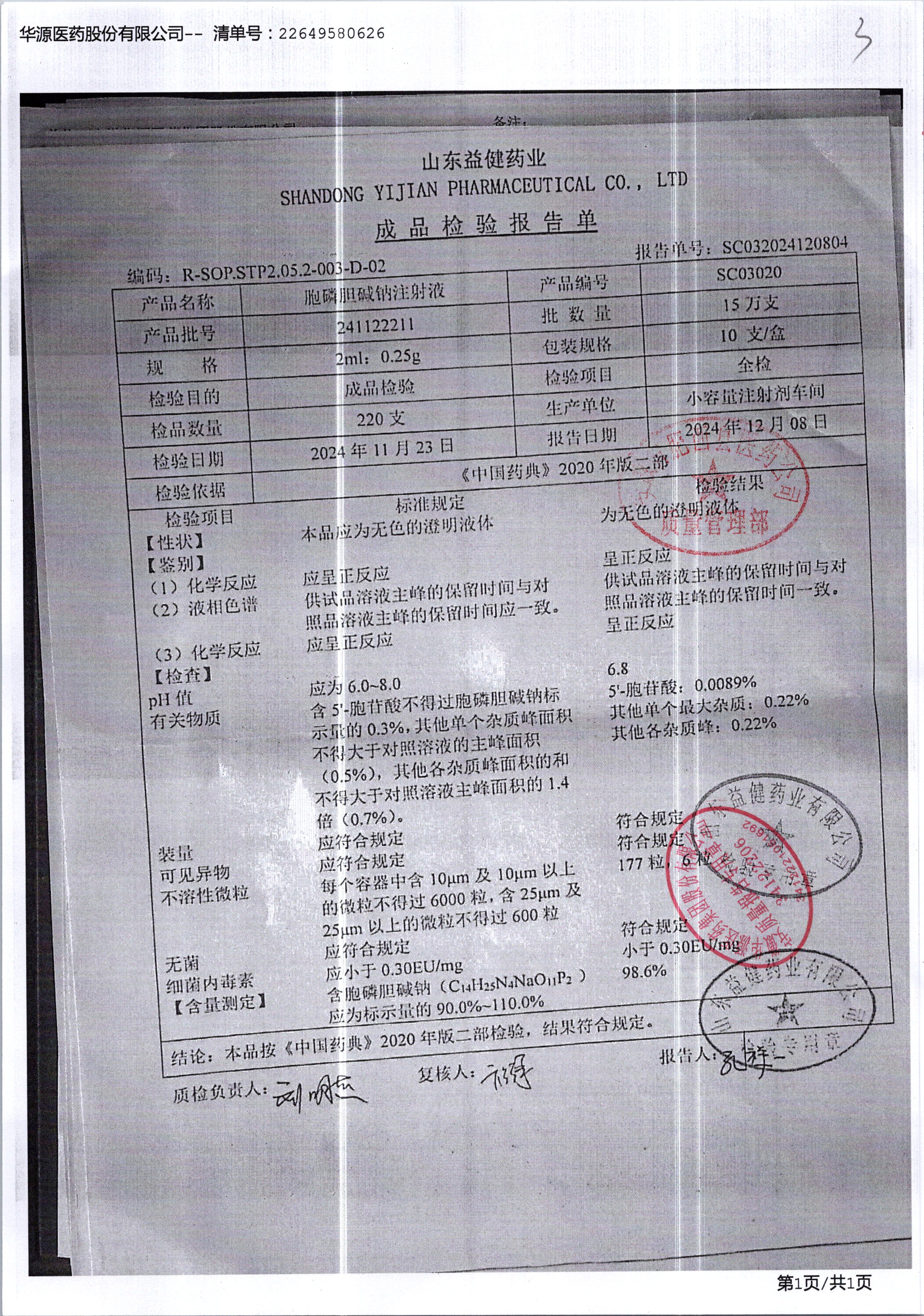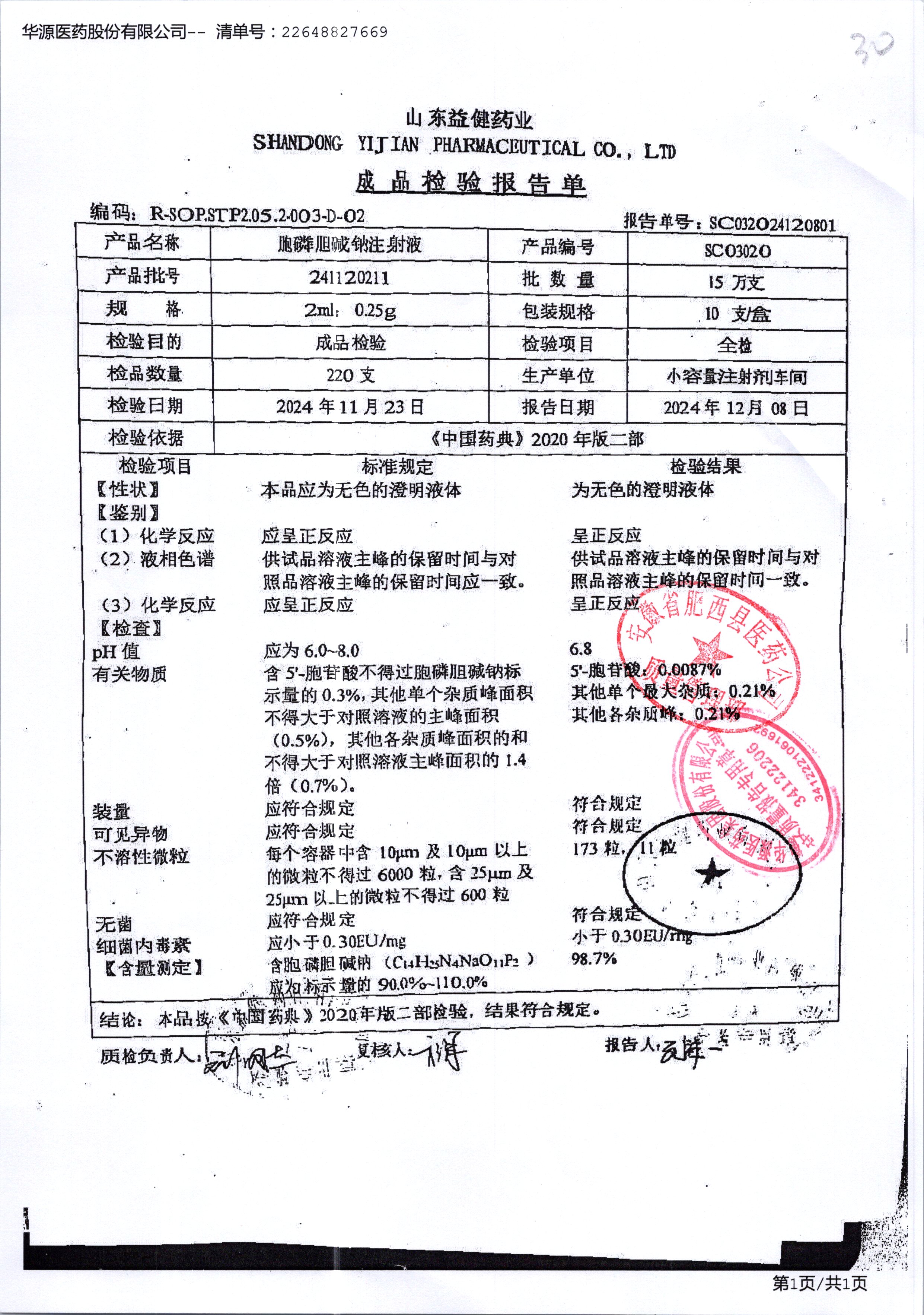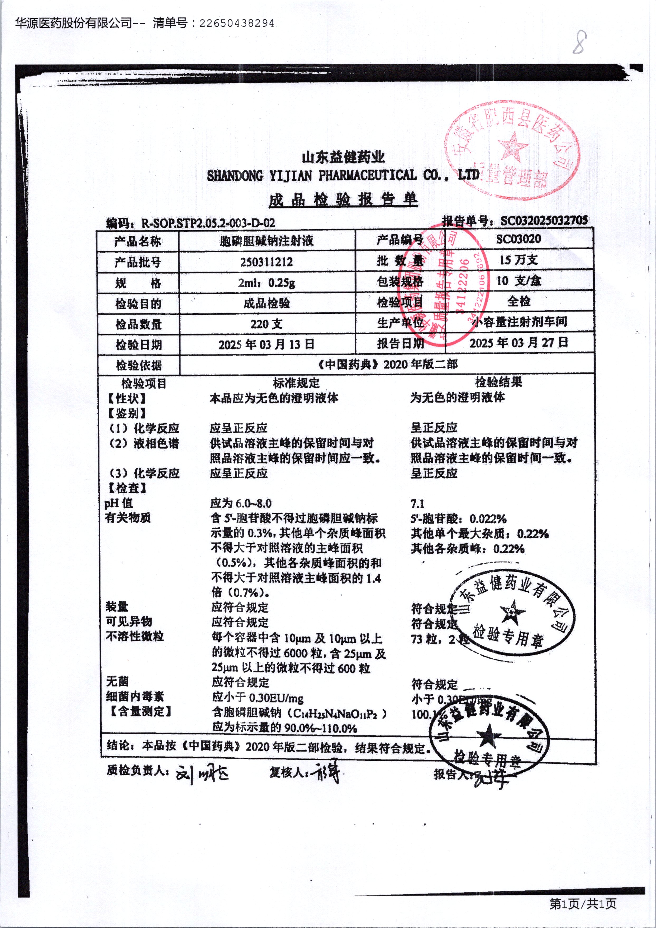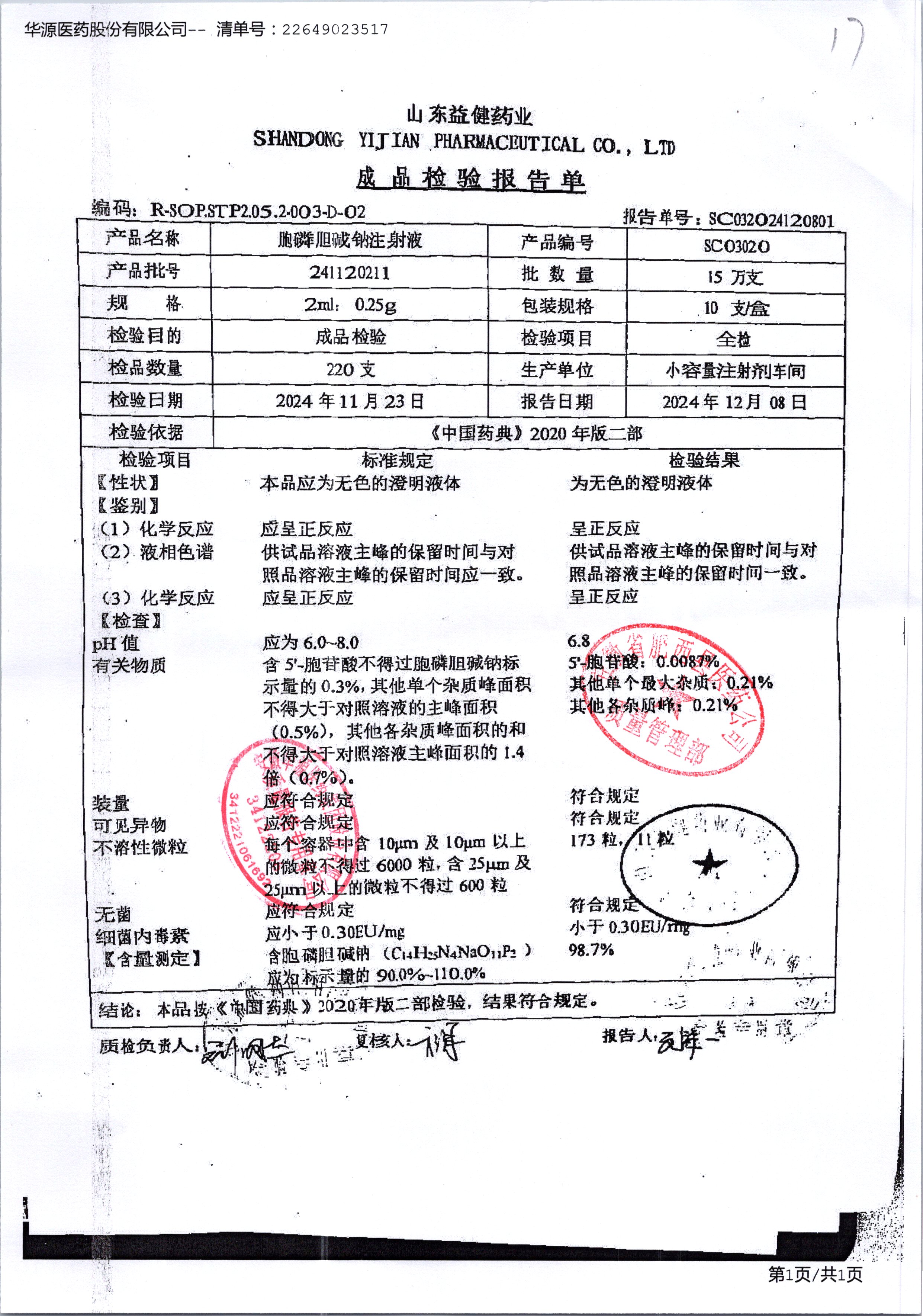 | 胞磷膽堿鈉注射液 | 2ml:0.25g | 241122211 | 查看詳情 |
