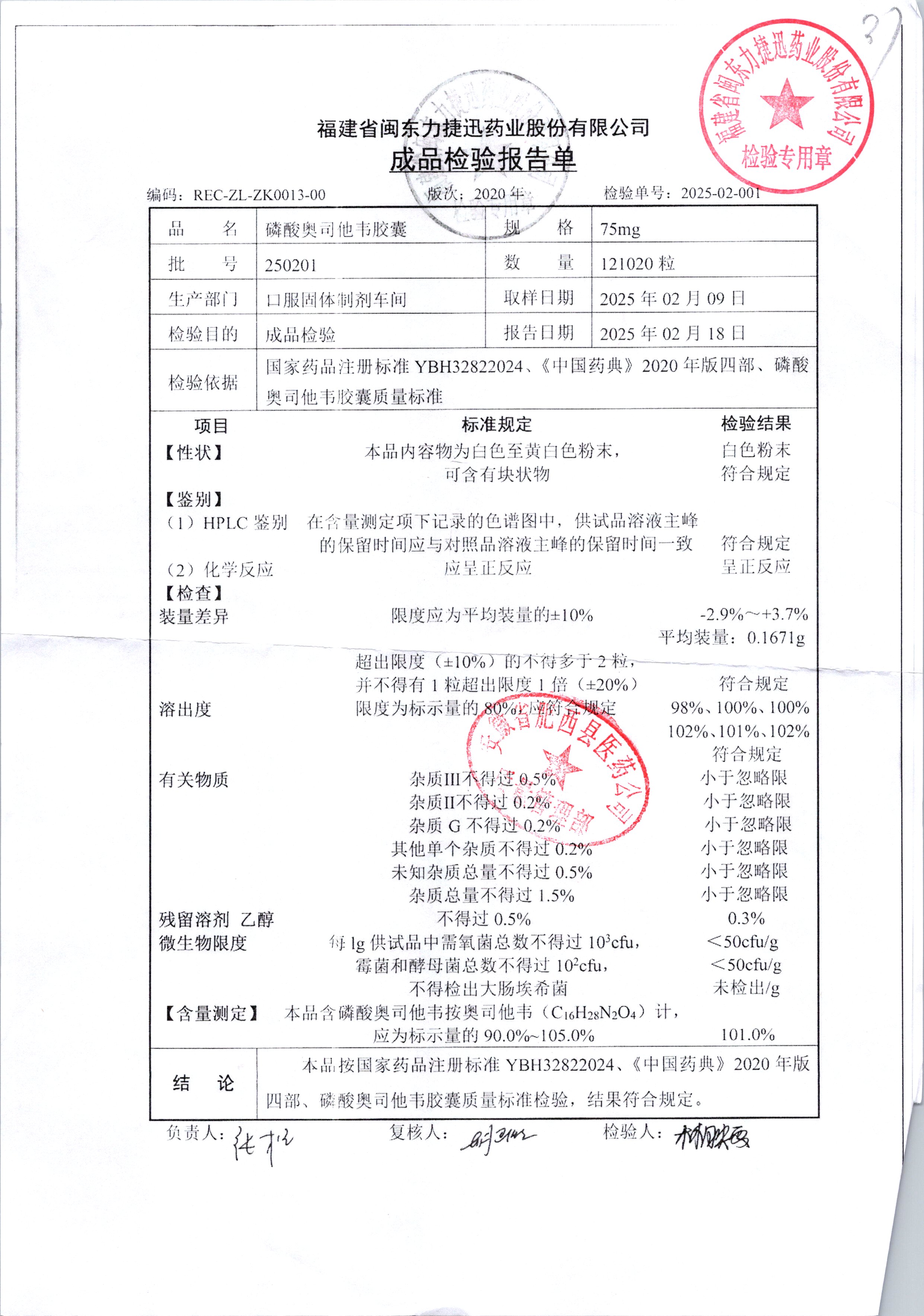 磷酸奧司他韋膠囊 75mg 250201 查看詳情