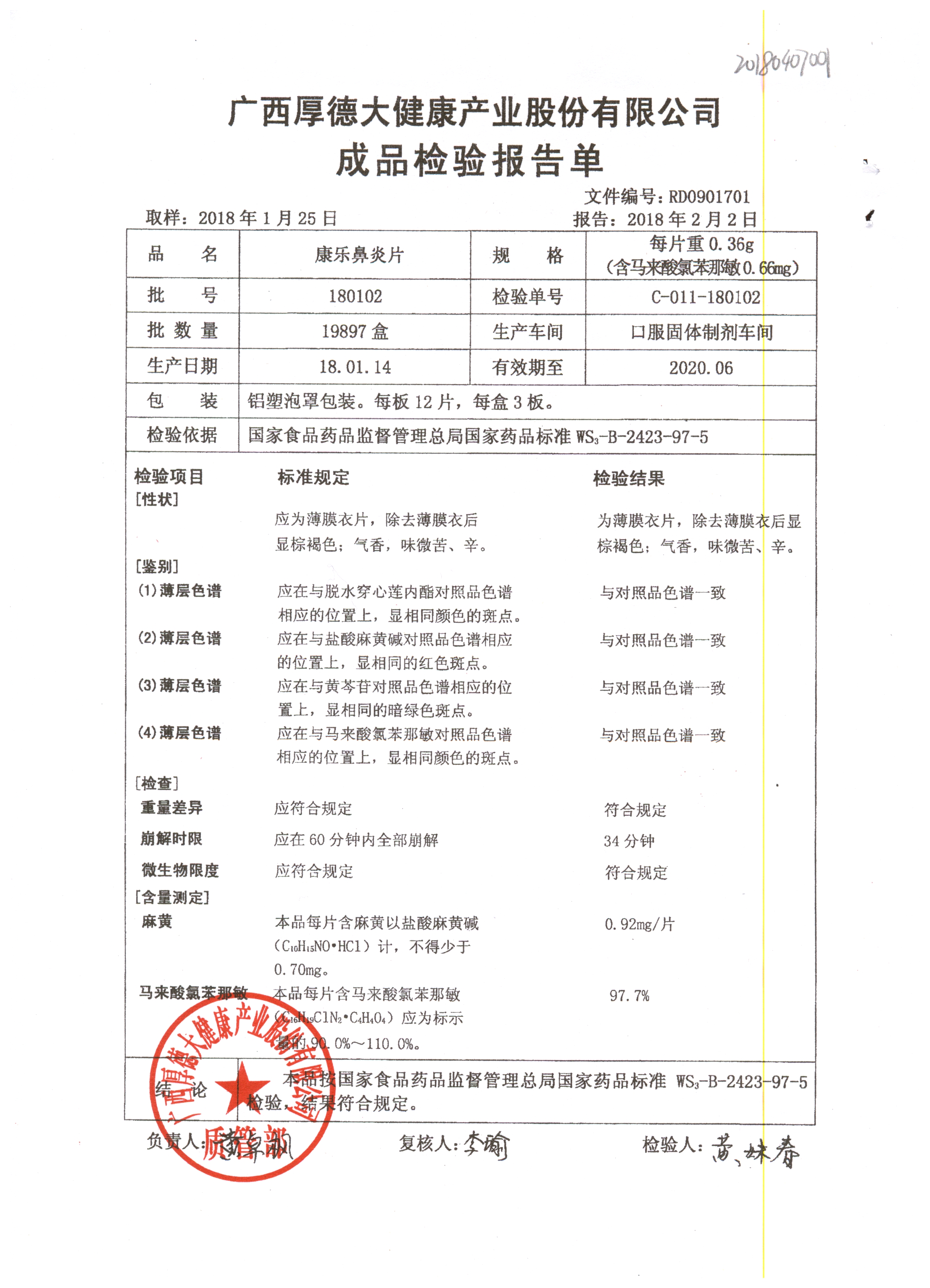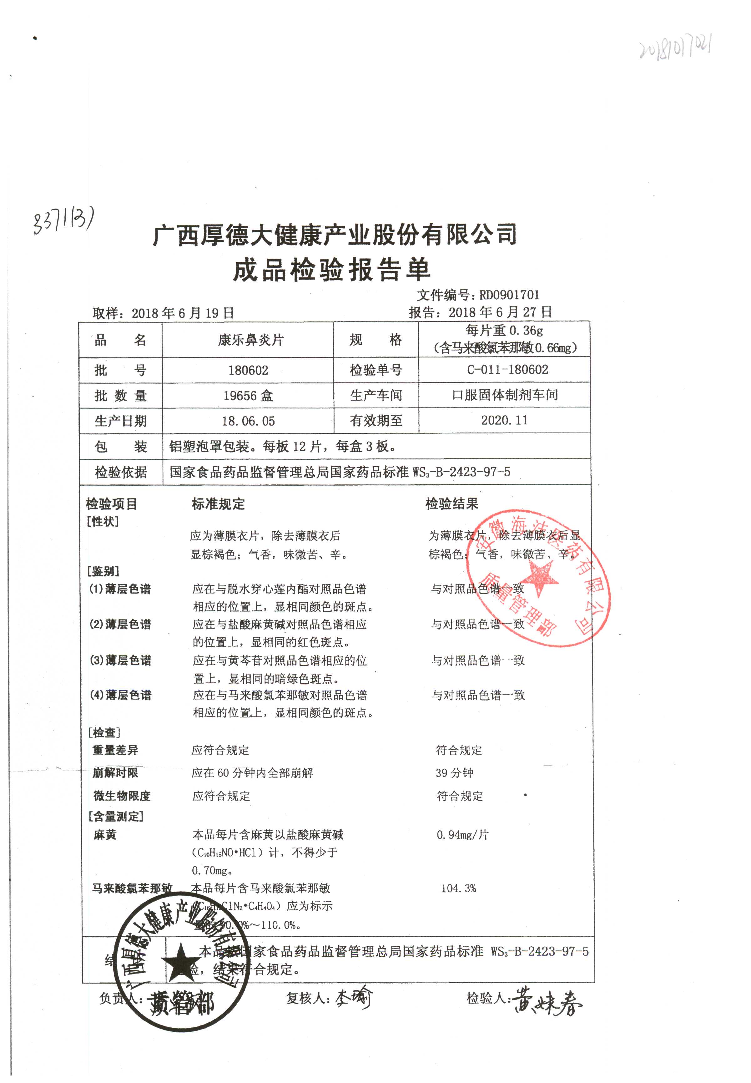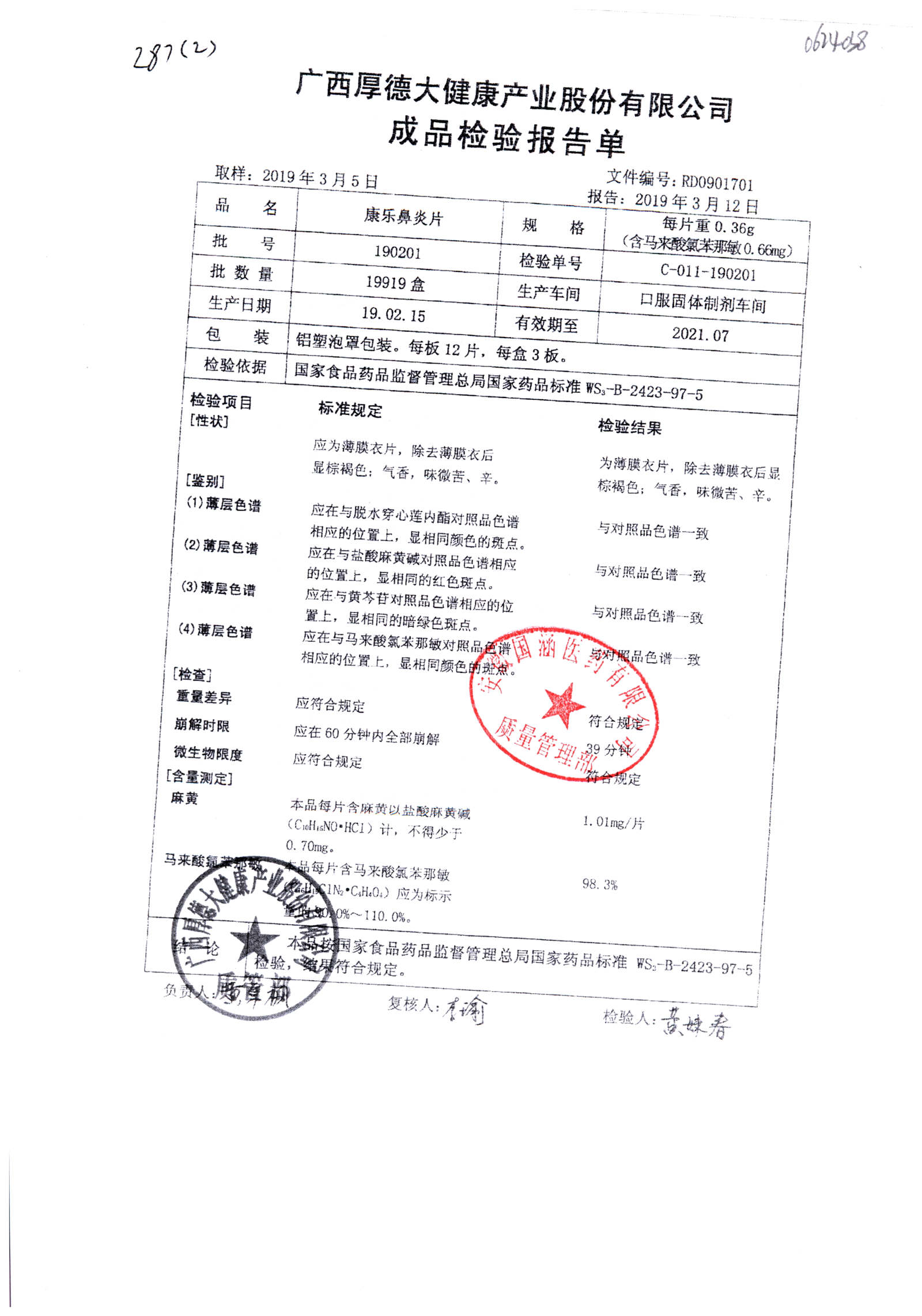 | 康樂鼻炎片 | 0.36g*36粒 | 190802 | 查看詳情 |