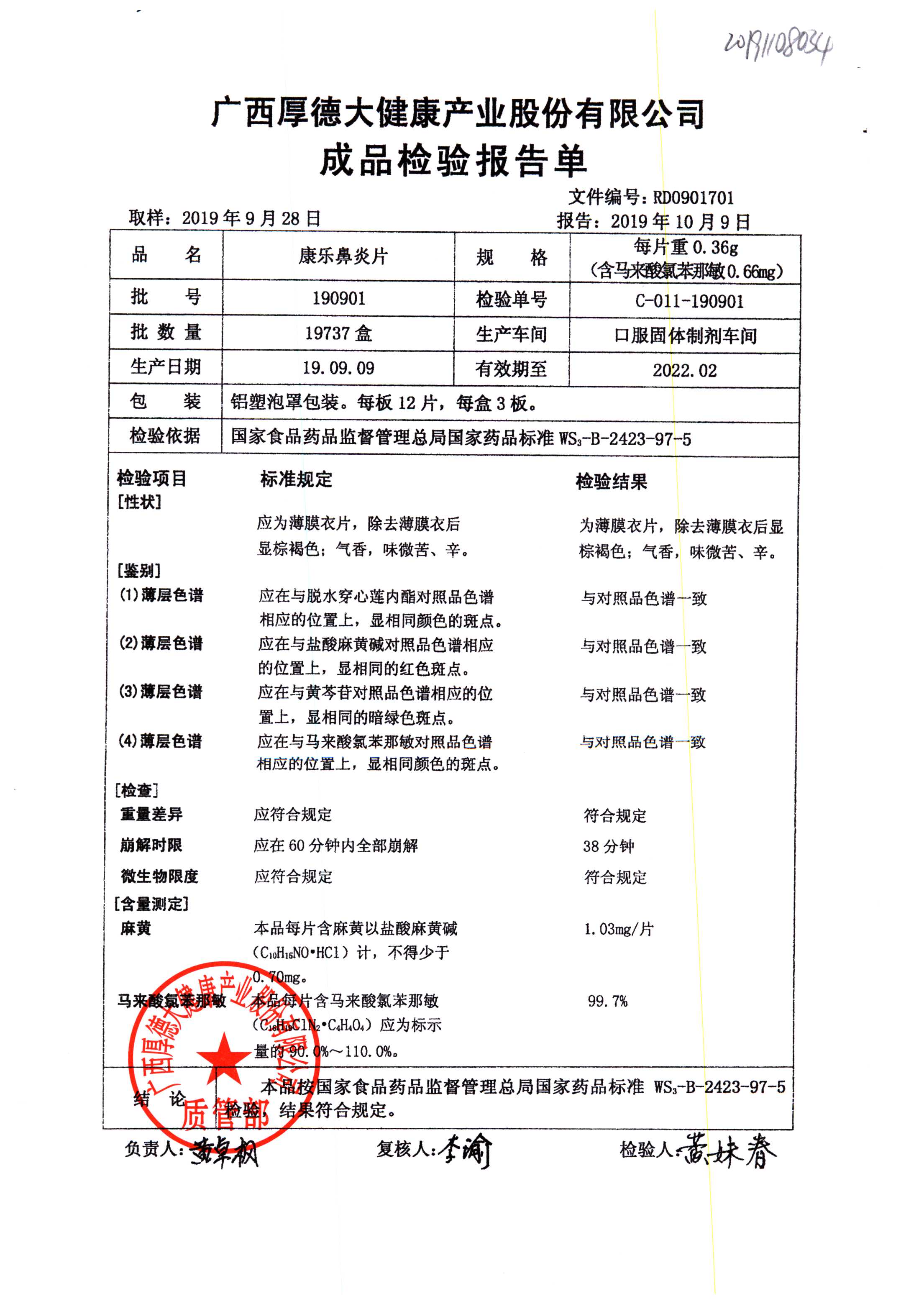 | 康樂鼻炎片 | 0.36g*36粒 | 190901 | 查看詳情 |