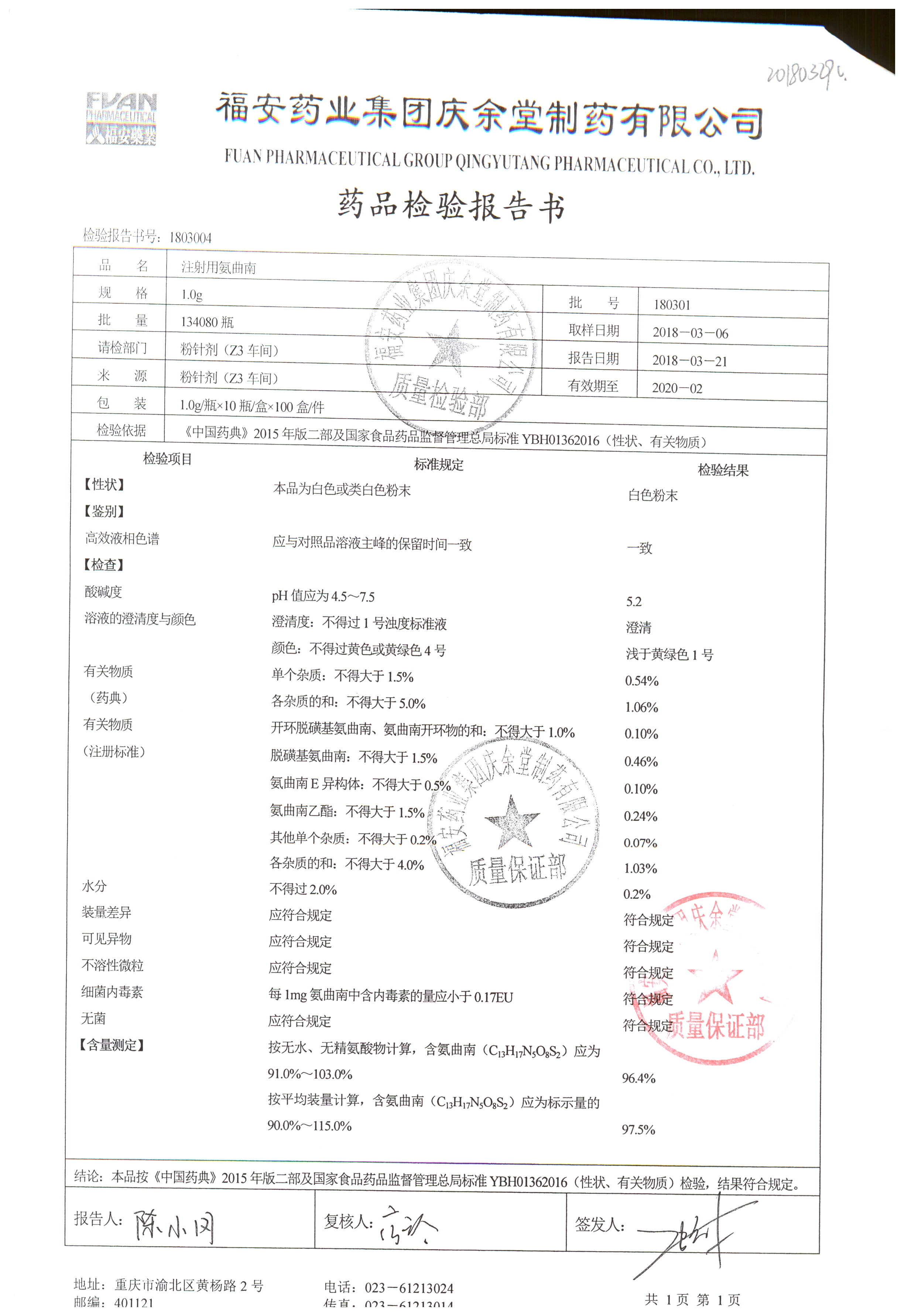 | 注射用氨曲南 | 1.0g | 180305 | 查看詳情 |
