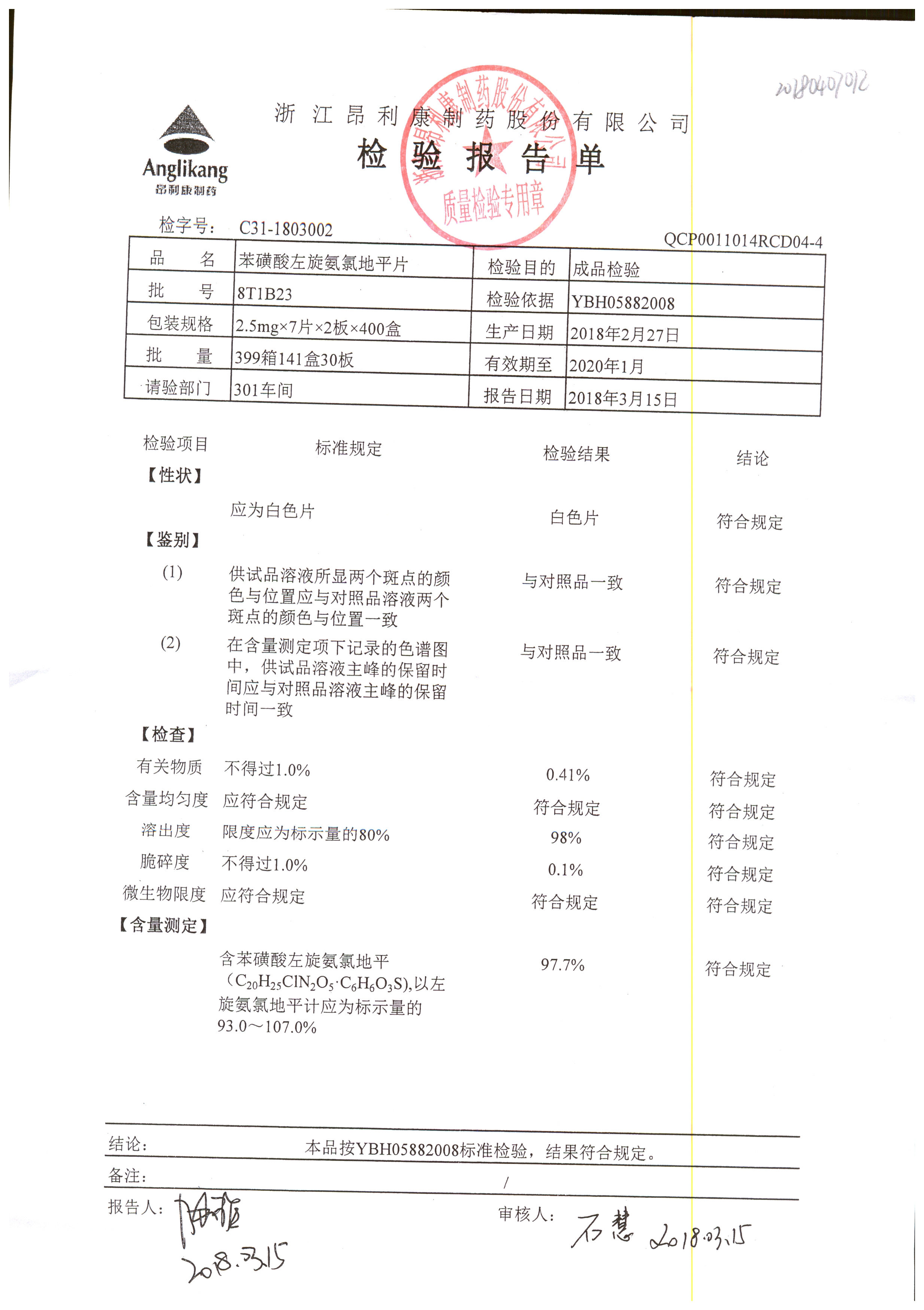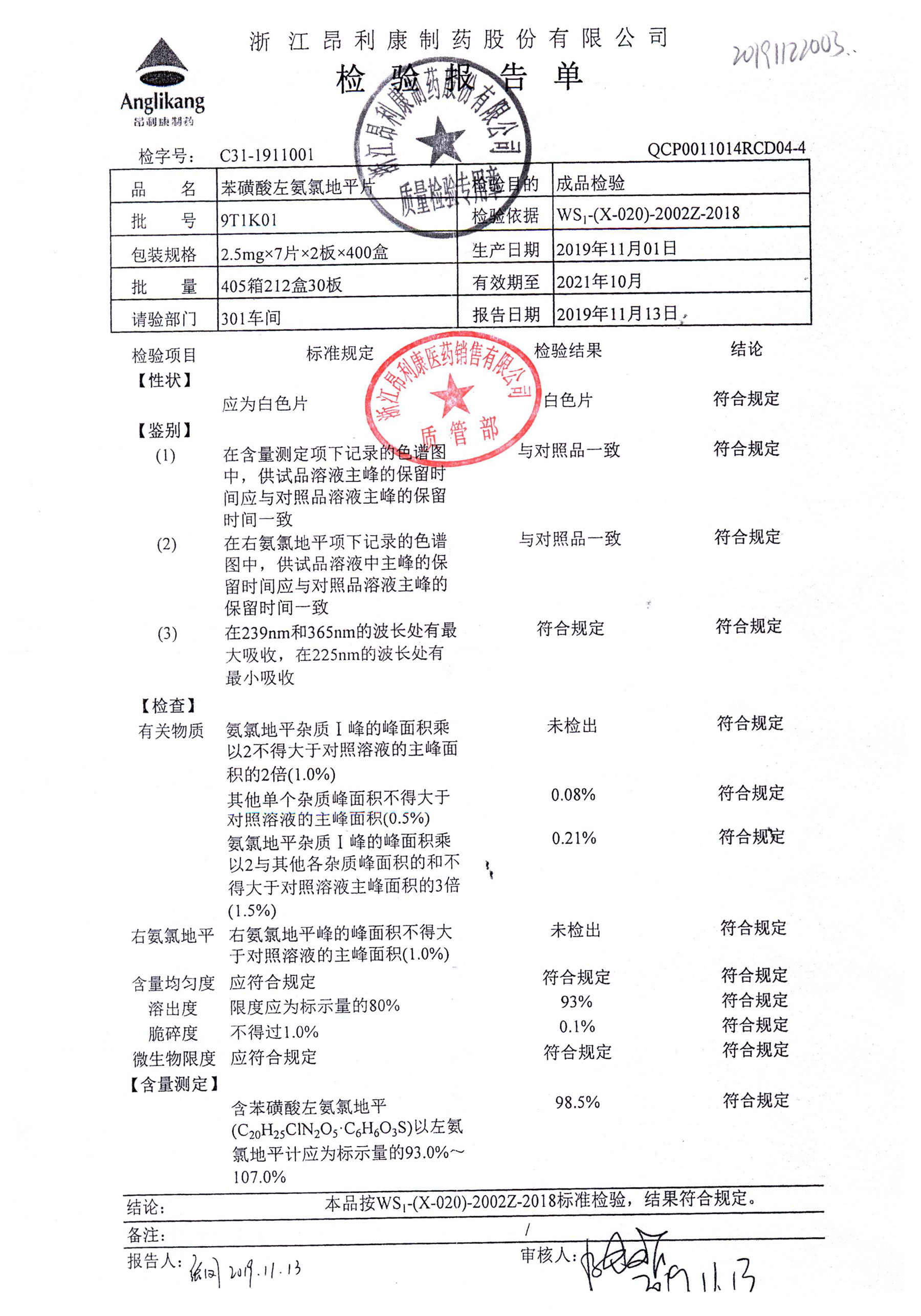 | 苯磺酸左旋氨氯地平片 | 2.5mg*14片 | 8T1L50 | 查看詳情 |