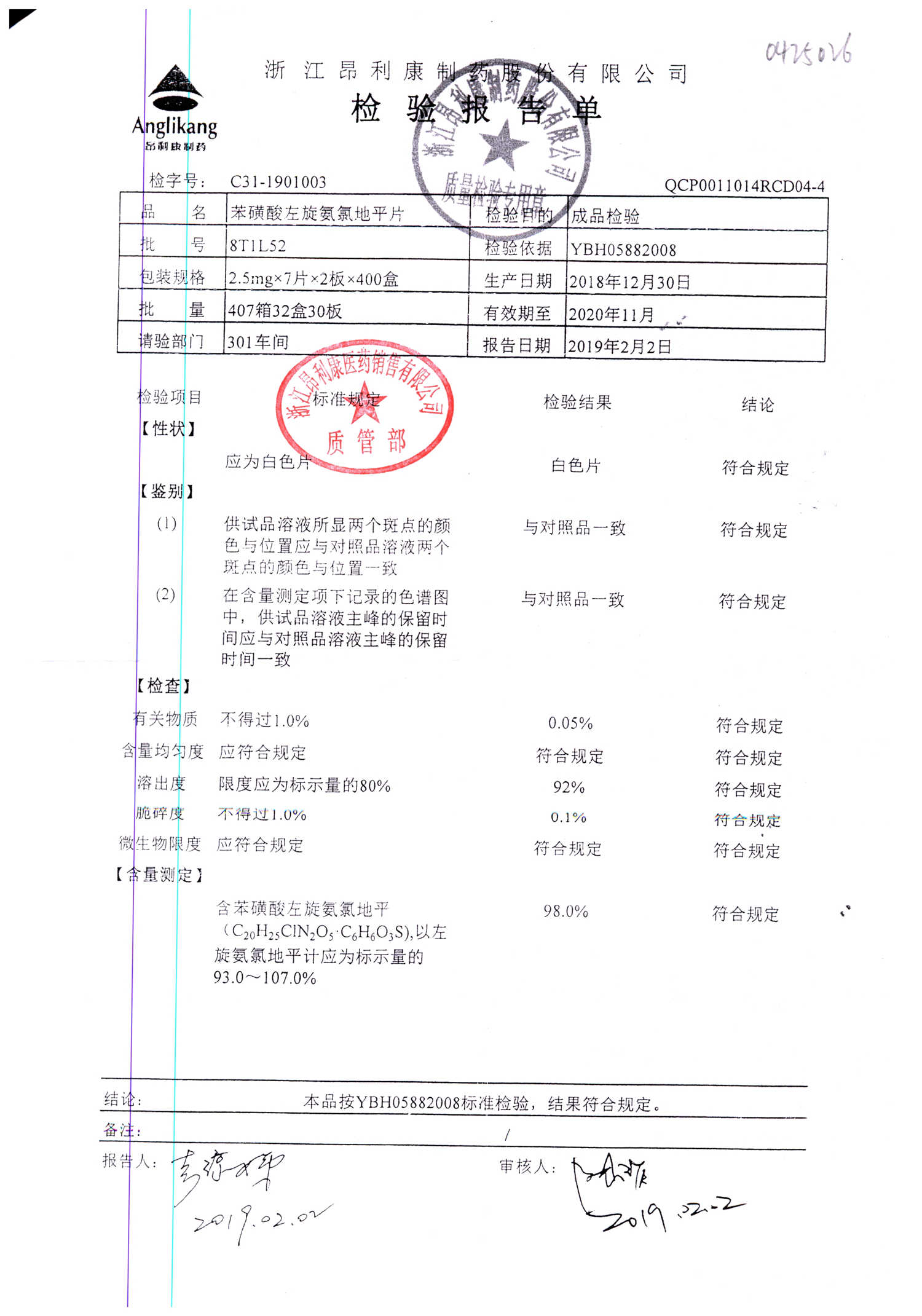 | 苯磺酸左旋氨氯地平片 | 2.5mg*14片 | 8T1B23 | 查看詳情 |