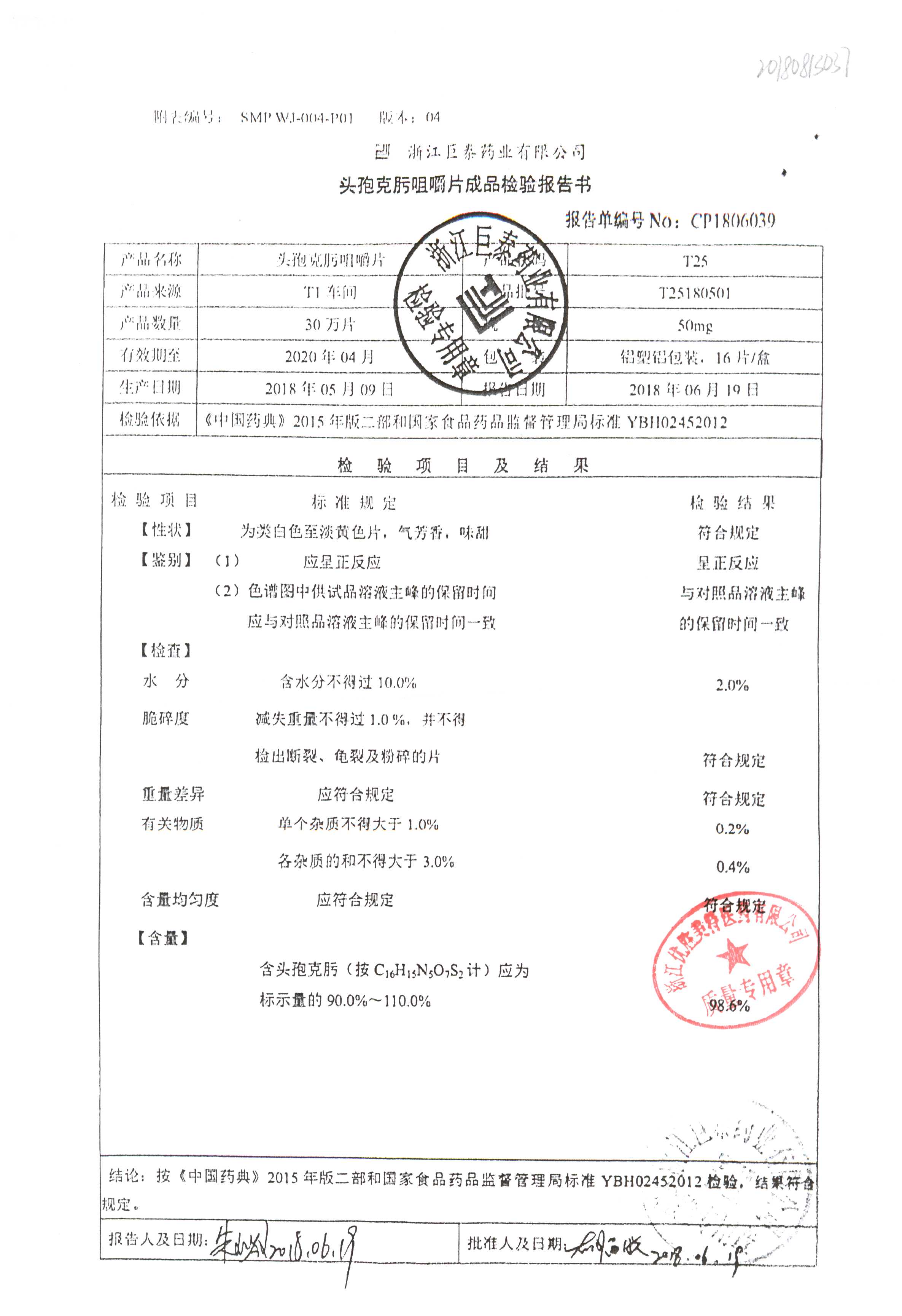 | 頭孢克肟咀嚼片 | 50mg*16s | T25201114 | 查看詳情 |