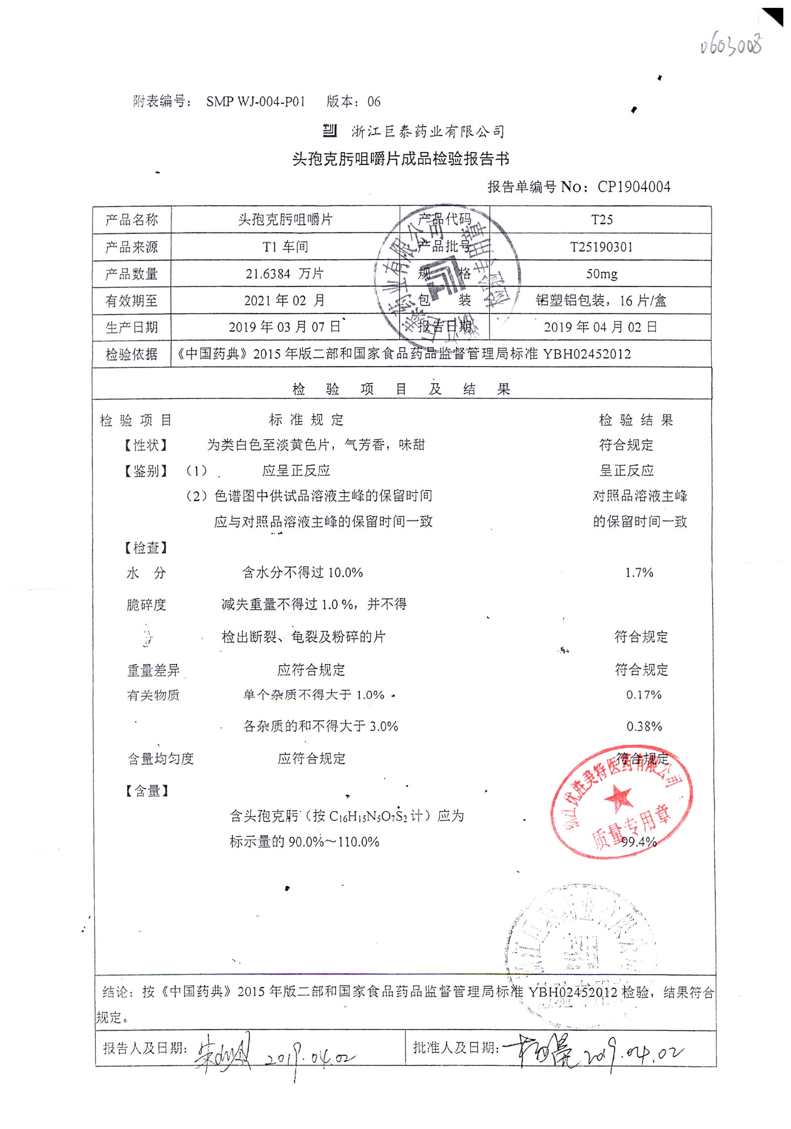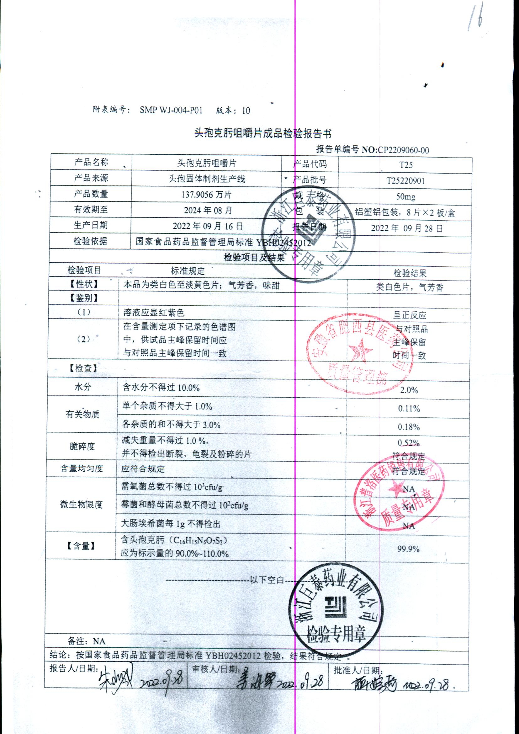 | 頭孢克肟咀嚼片 | 50mg*16s | T25220201/1 | 查看詳情 |