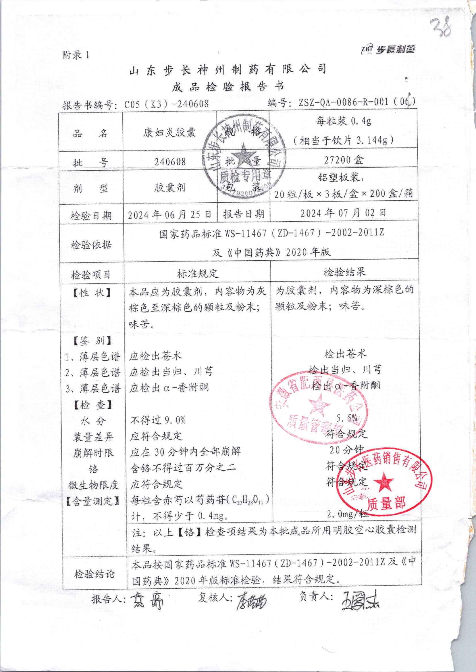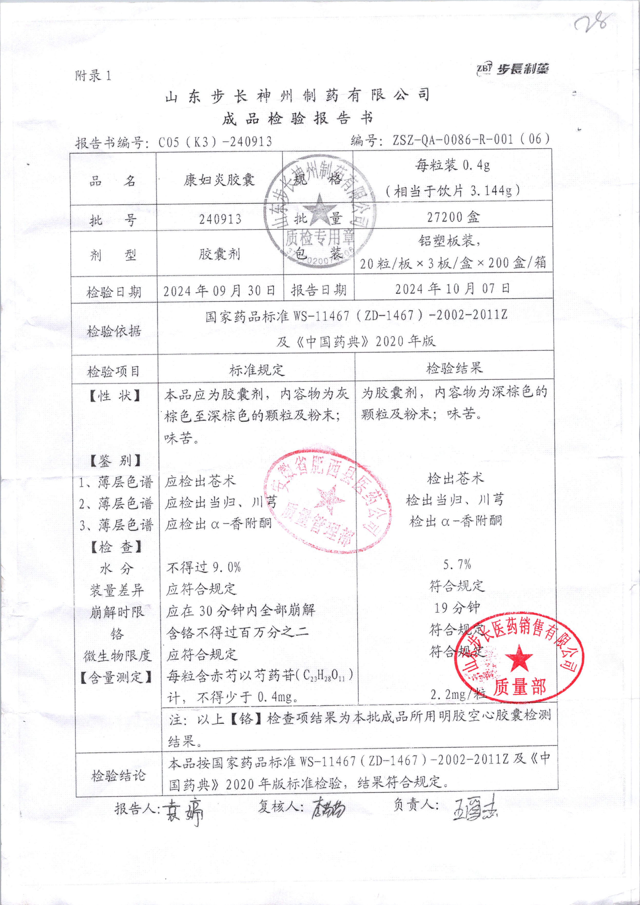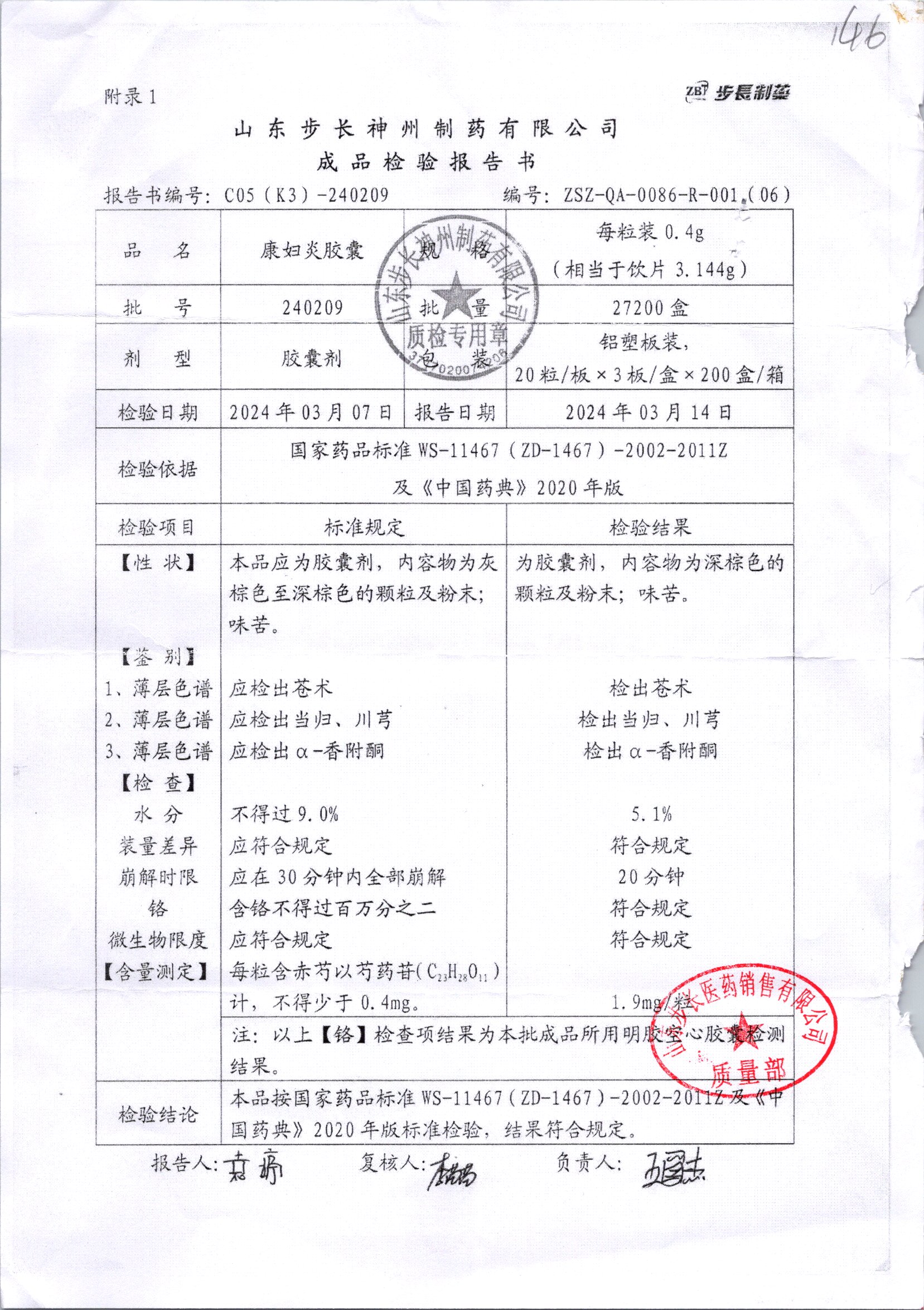 | 康婦炎膠囊 | 0.4g*60粒 | 240608 | 查看詳情 |