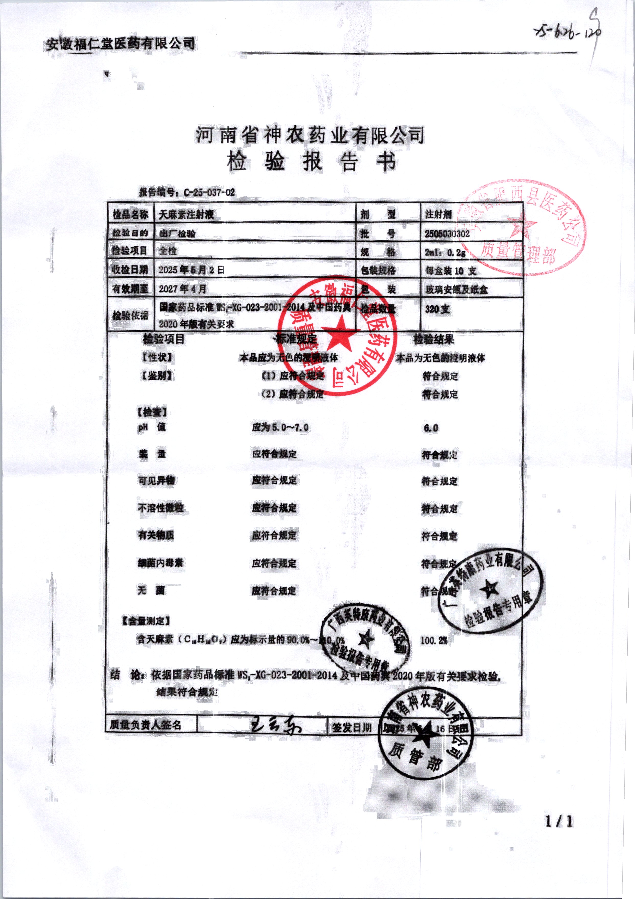 天麻素注射液 2ml:0.2g 2508050309 查看詳情