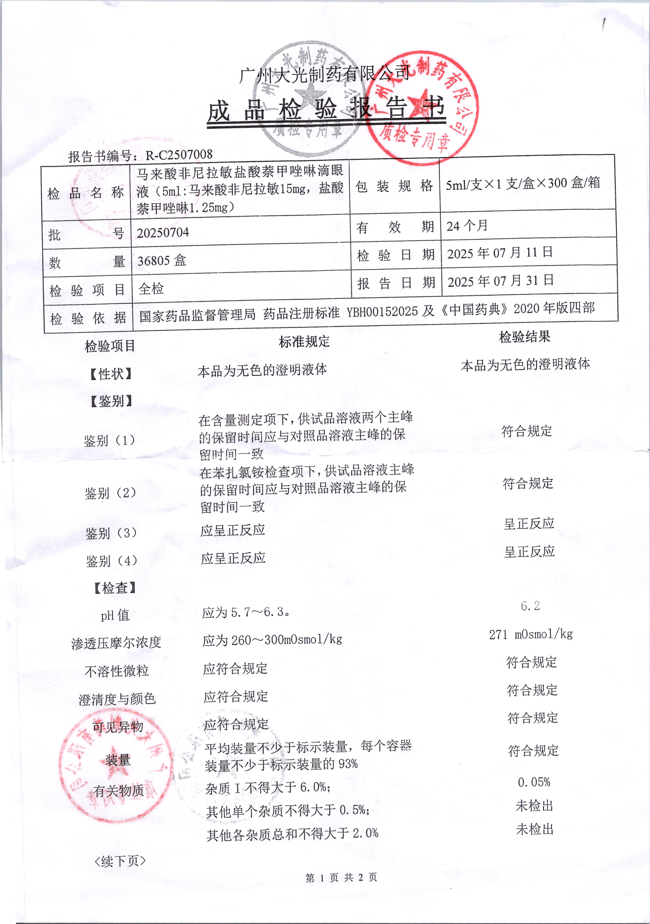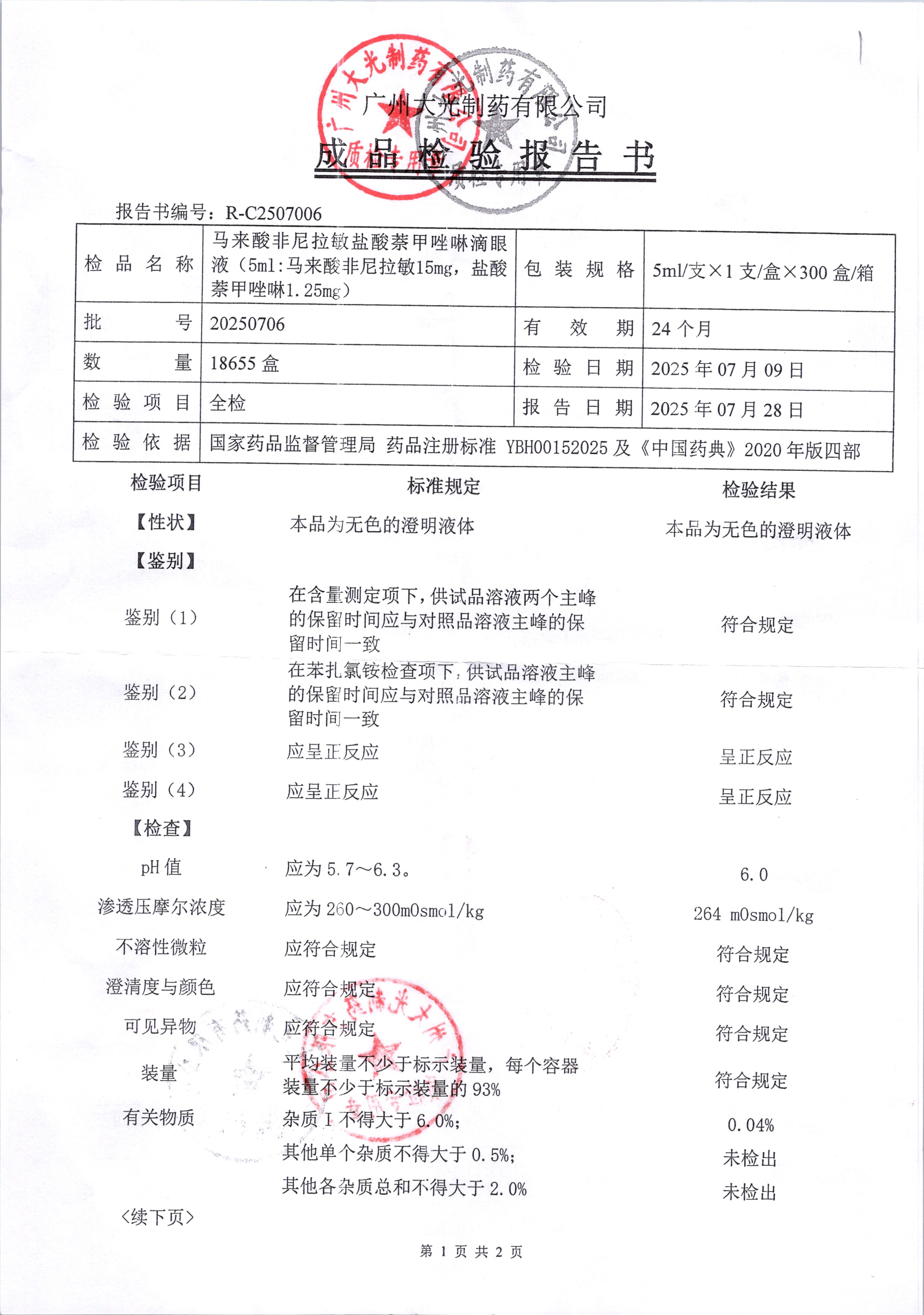 | 馬來酸非尼拉敏鹽酸萘甲唑啉滴眼液 | 5ml | 20250706 | 查看詳情 |
