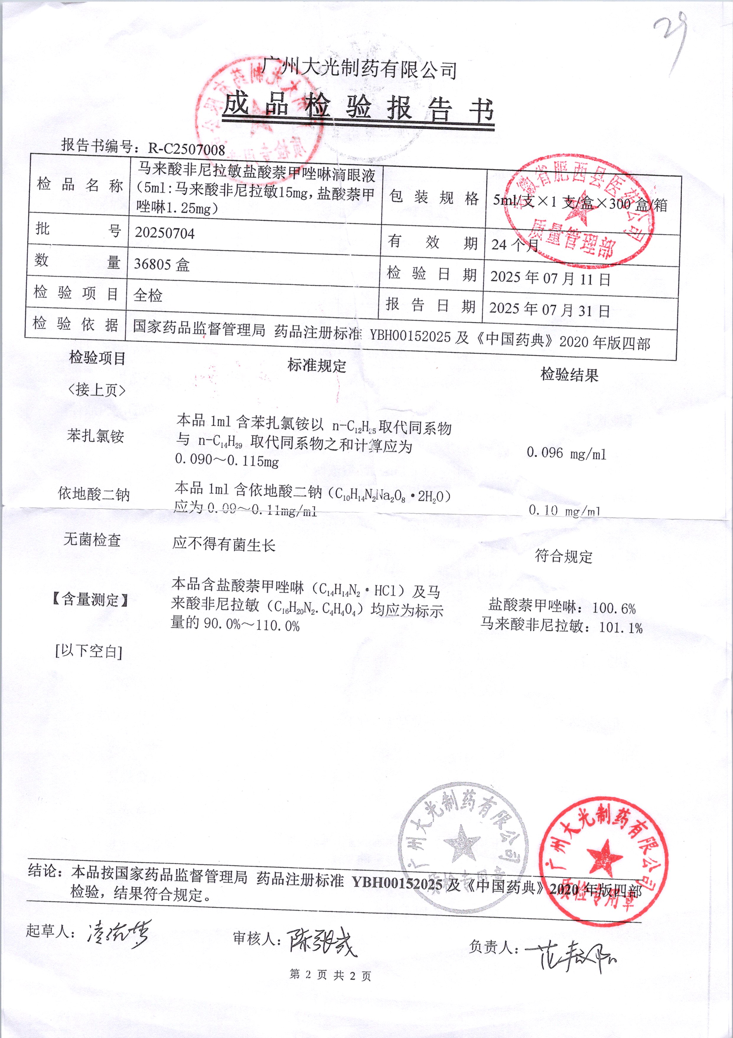 | 馬來酸非尼拉敏鹽酸萘甲唑啉滴眼液 | 5ml | 20250704/2 | 查看詳情 |