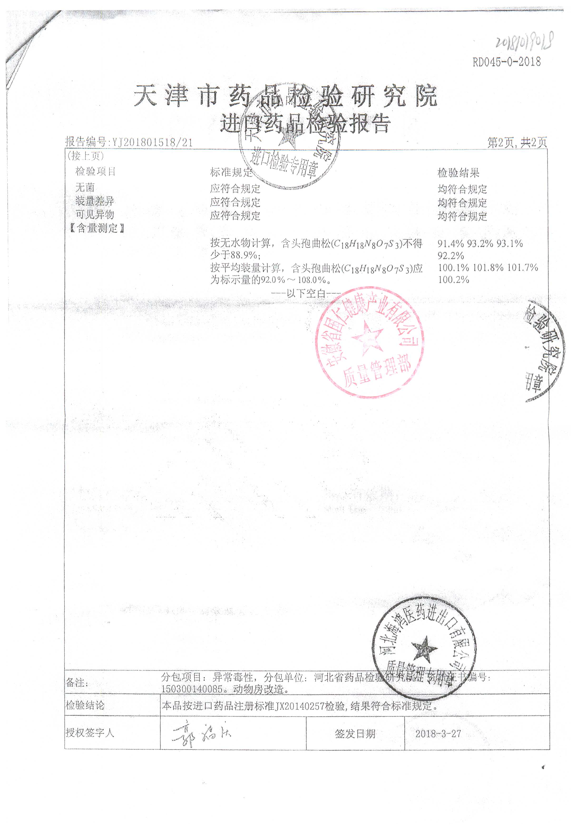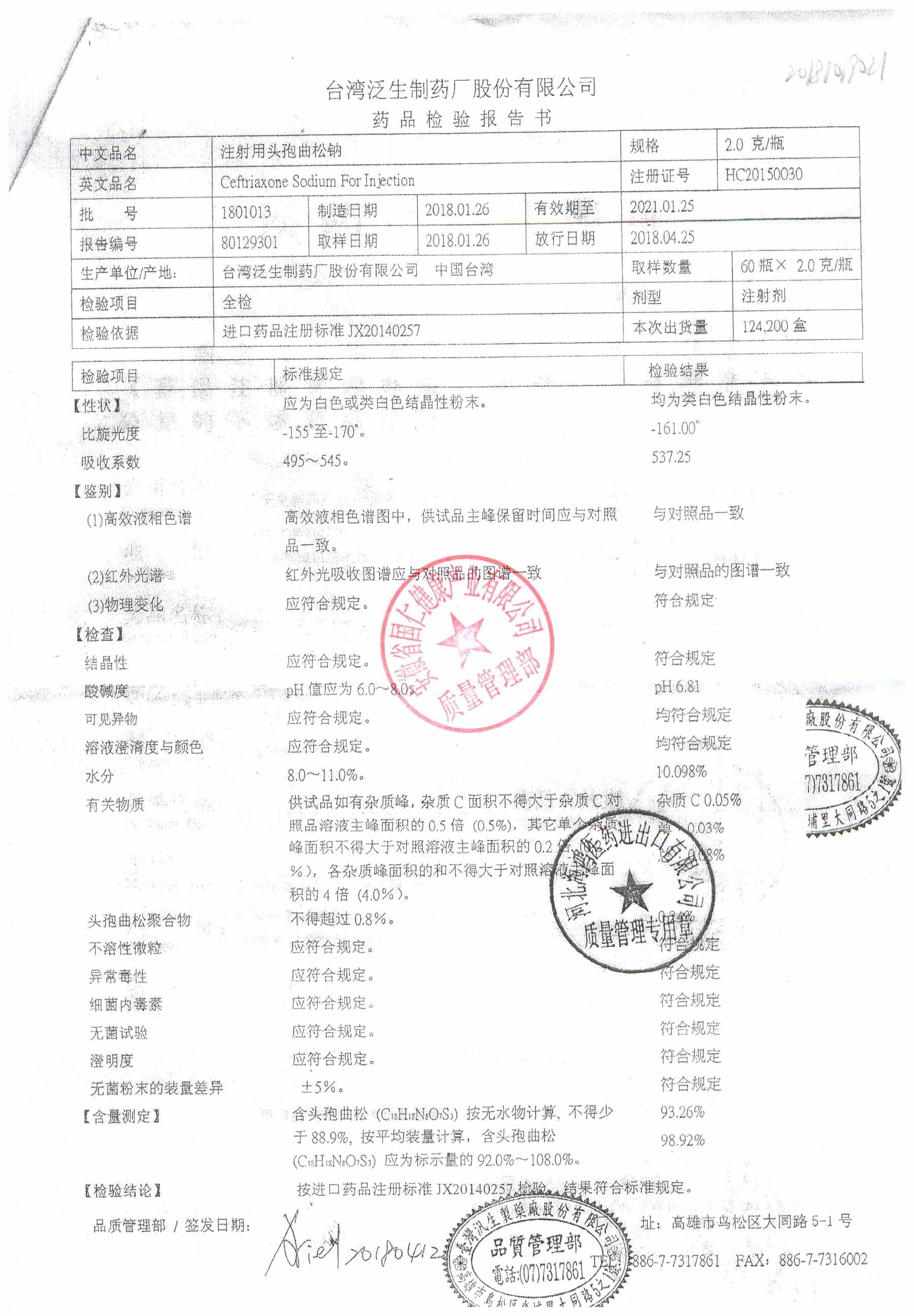 | 注射用頭孢曲松鈉 | 2.0g | 1801013(3/3) | 查看詳情 |
