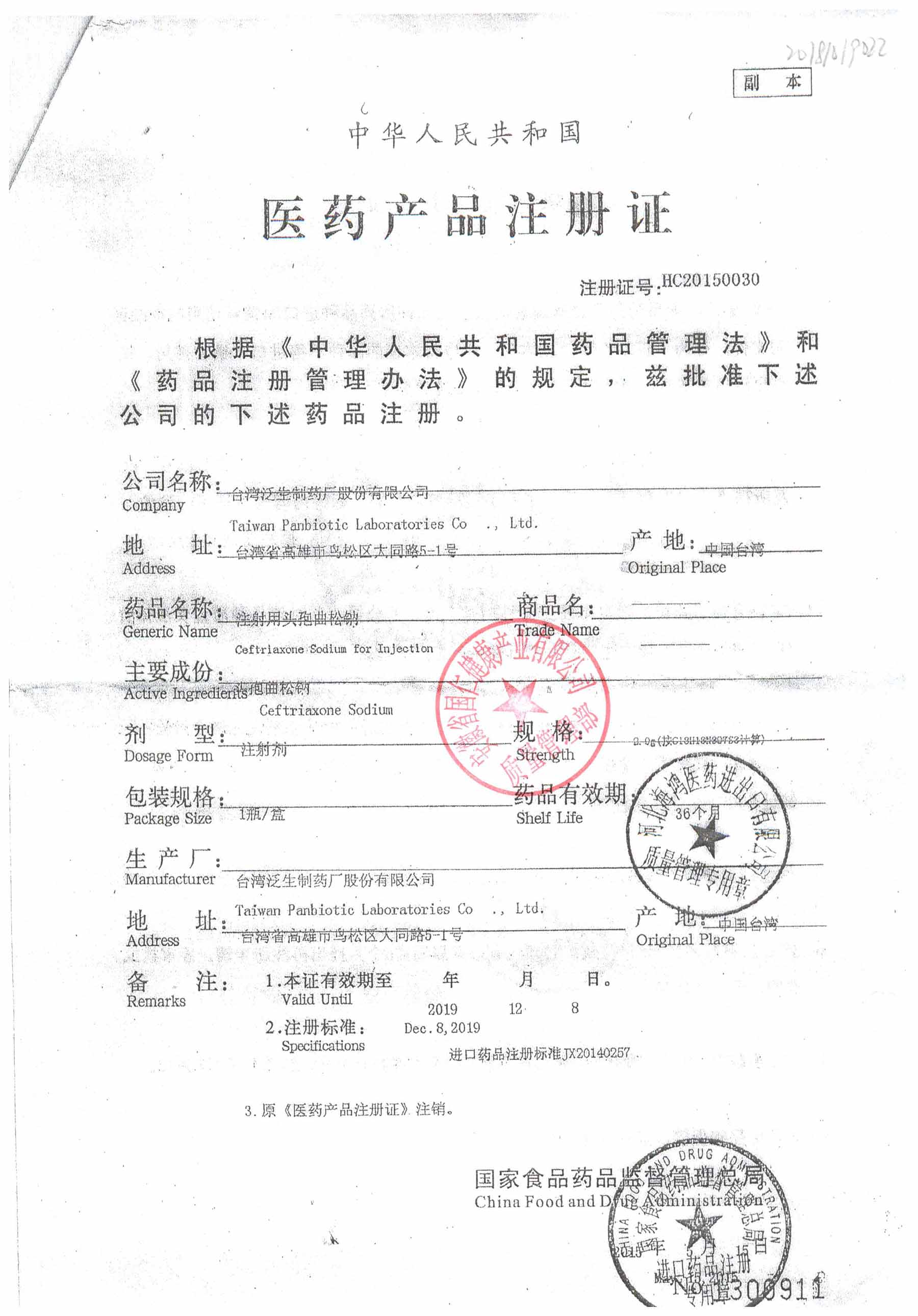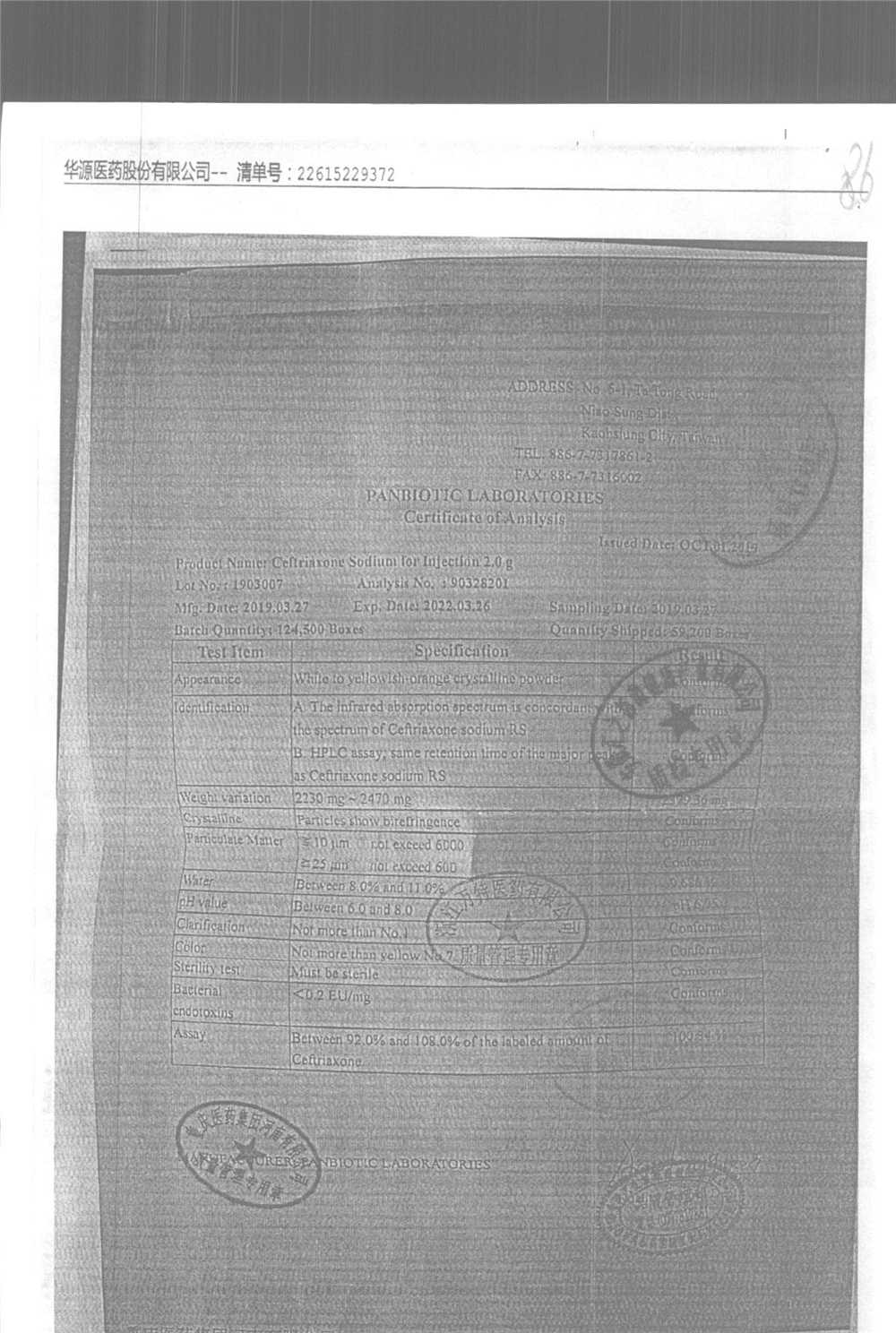| 注射用頭孢曲松鈉 | 2.0g | 1903007(5/5) | 查看詳情 |