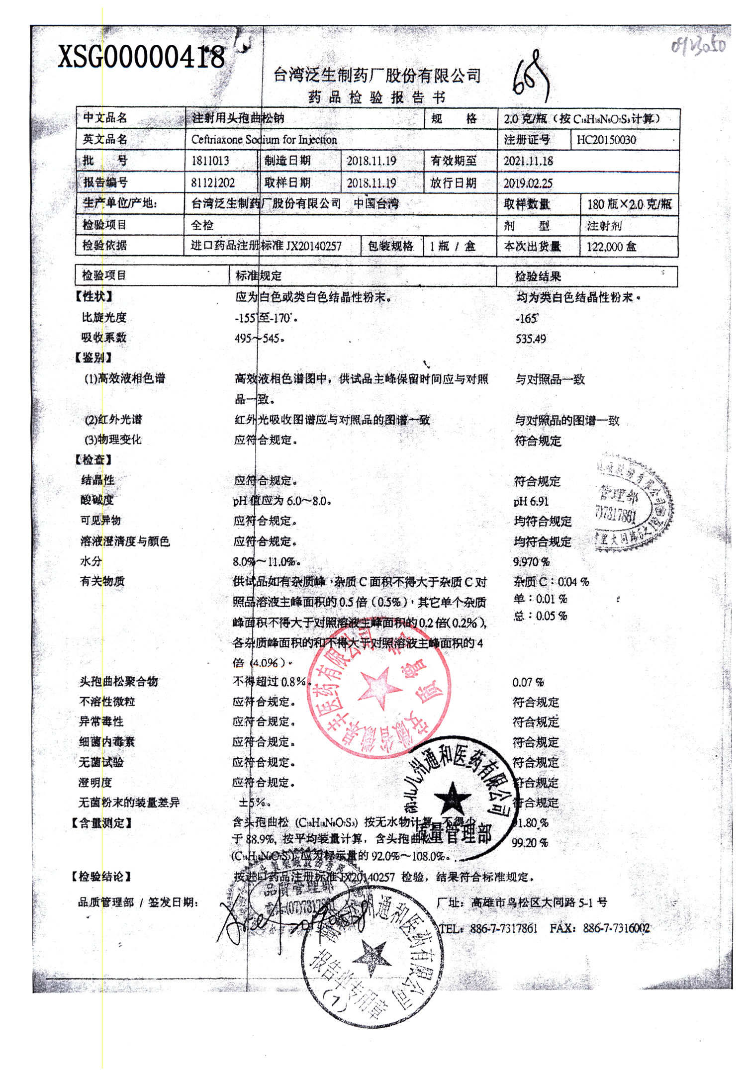 | 注射用頭孢曲松鈉 | 2.0g | 2004002(4/6) | 查看詳情 |