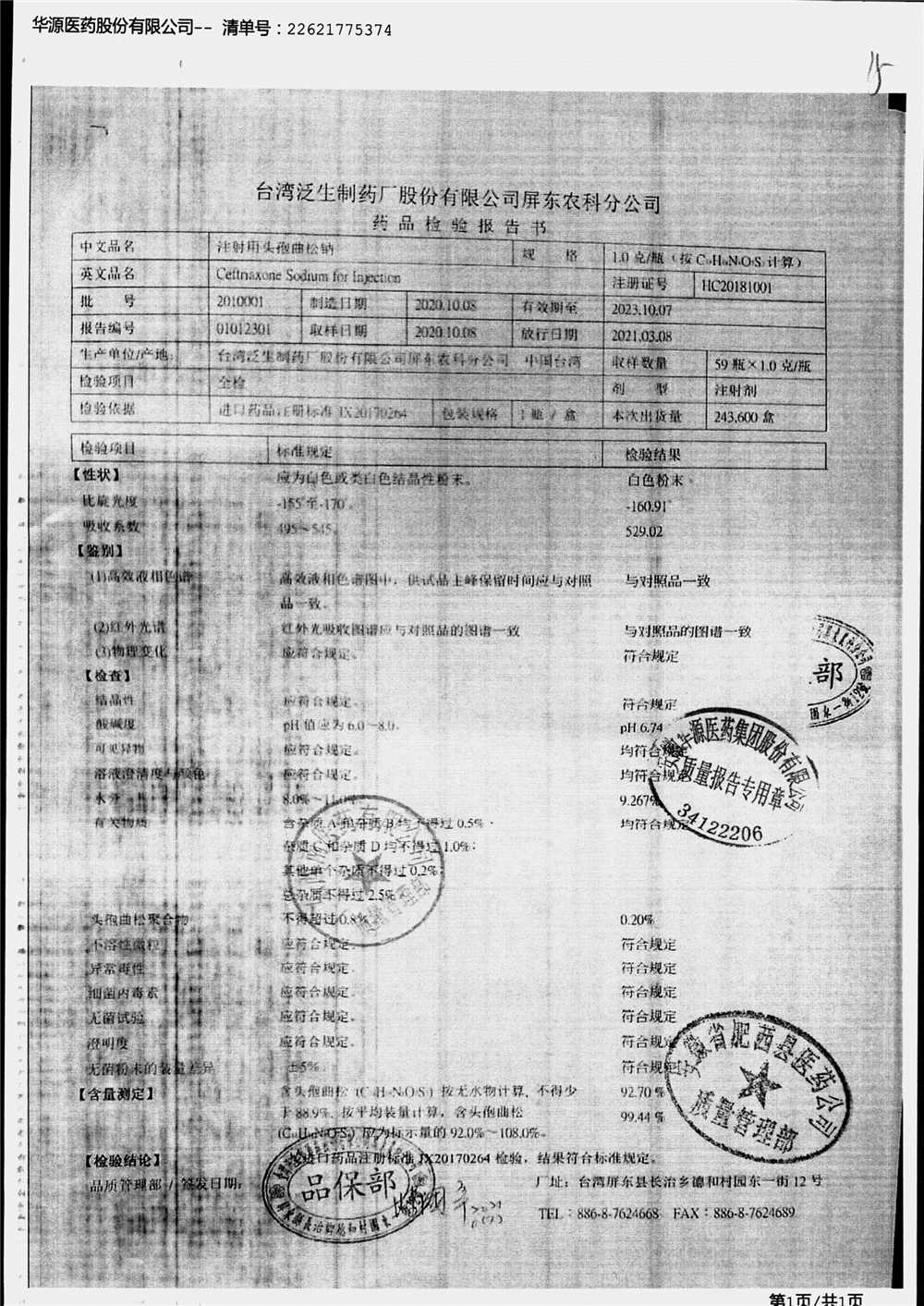 | 注射用頭孢曲松鈉 | 2.0g | 1903007(3/5) | 查看詳情 |