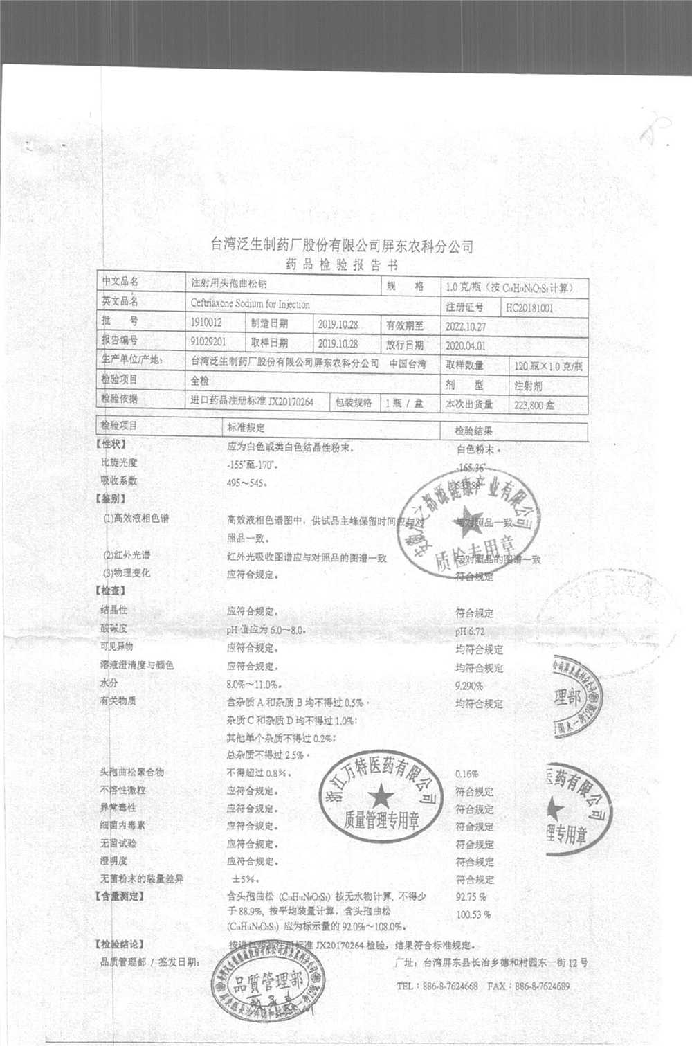 | 注射用頭孢曲松鈉 | 2.0g | 1903007(2/5) | 查看詳情 |