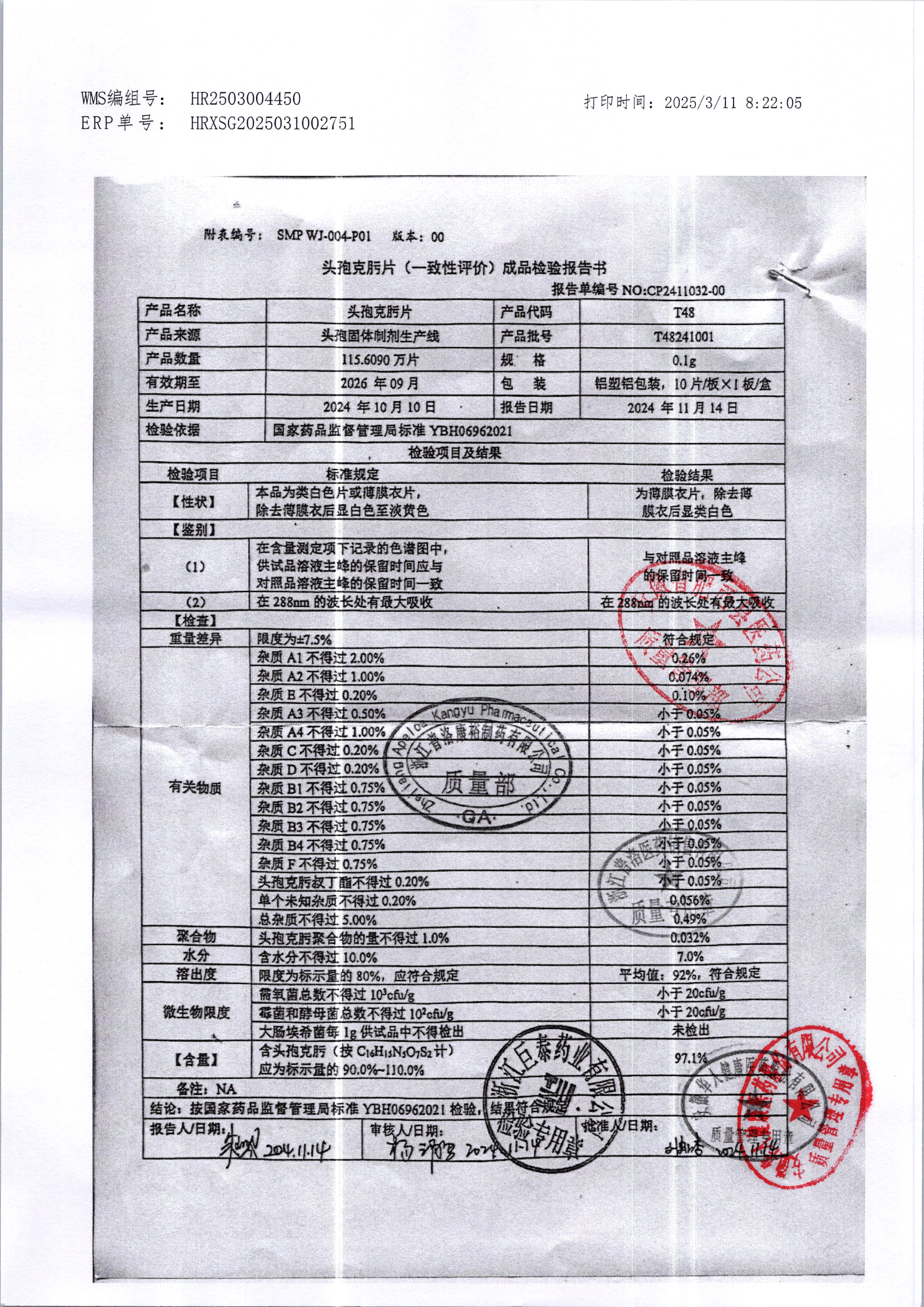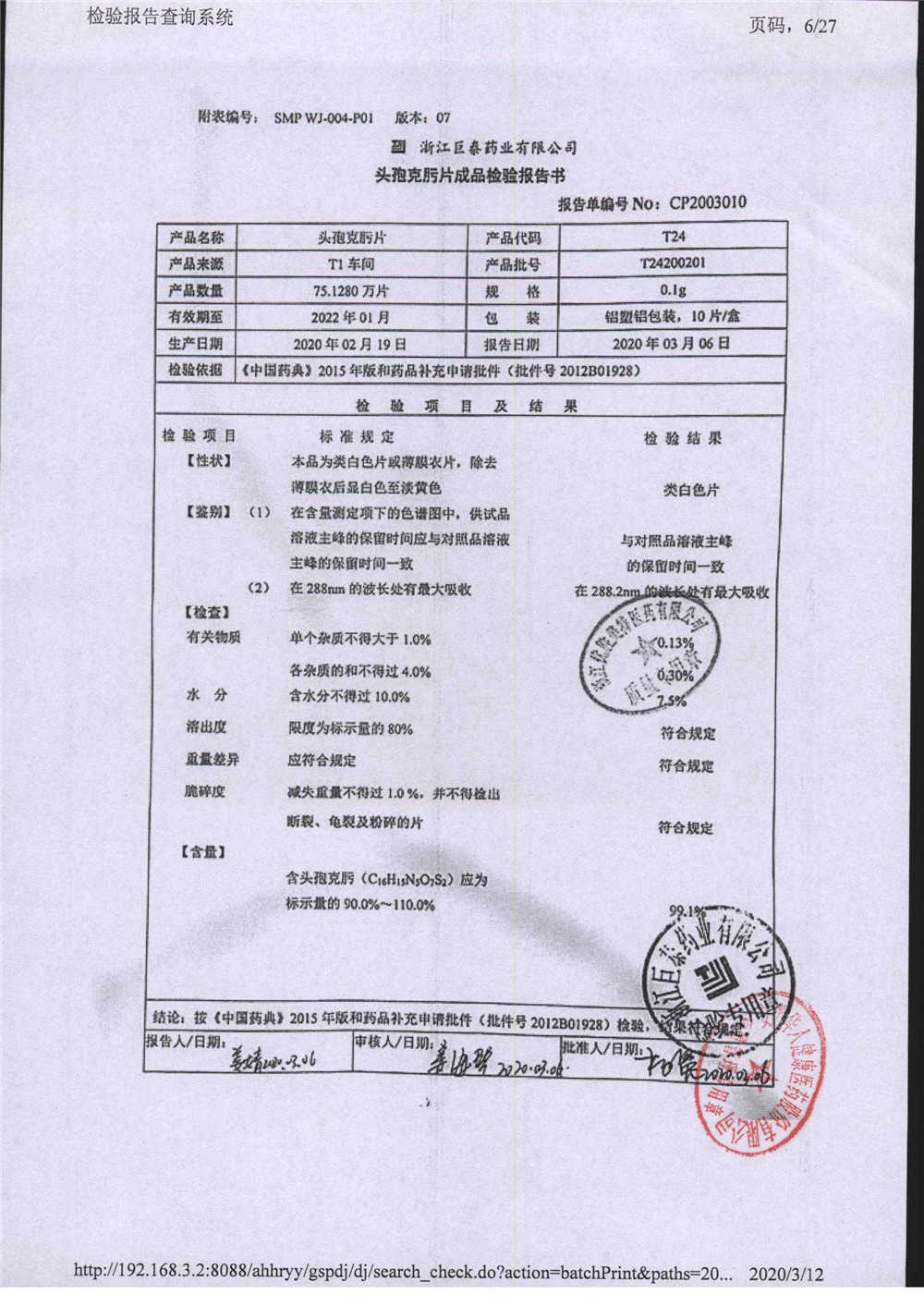 | 頭孢克肟片 | 0.1g*10s | T24200201 | 查看詳情 |