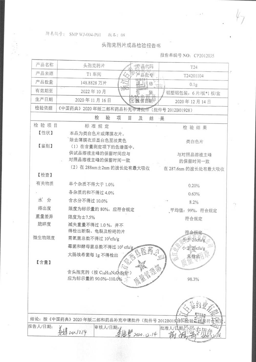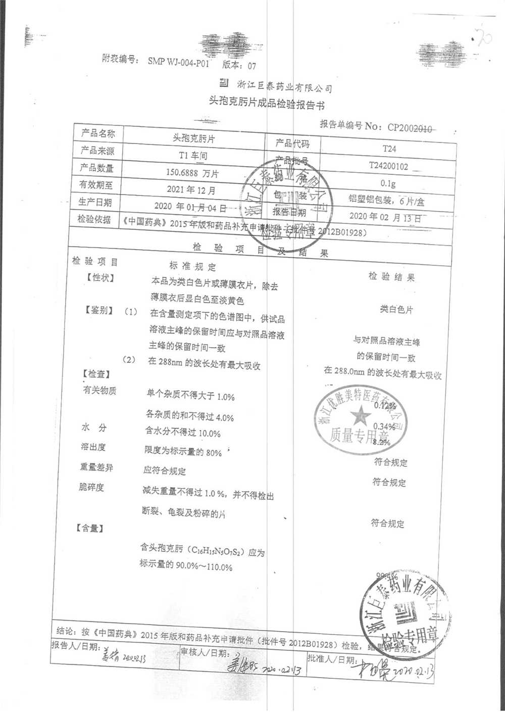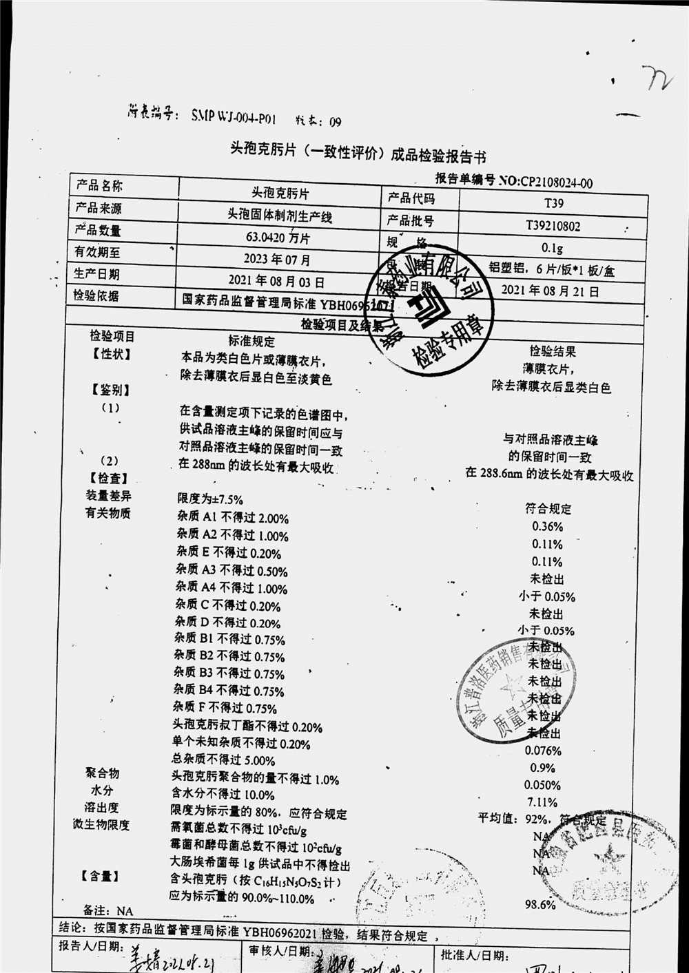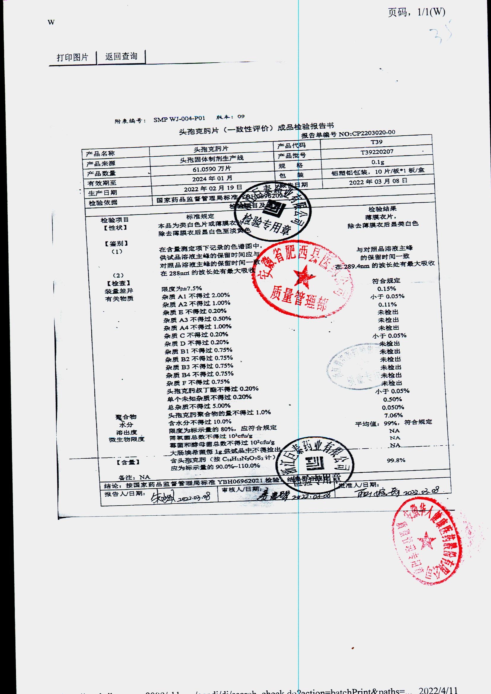 | 頭孢克肟片 | 0.1g*10s | T24210501 | 查看詳情 |