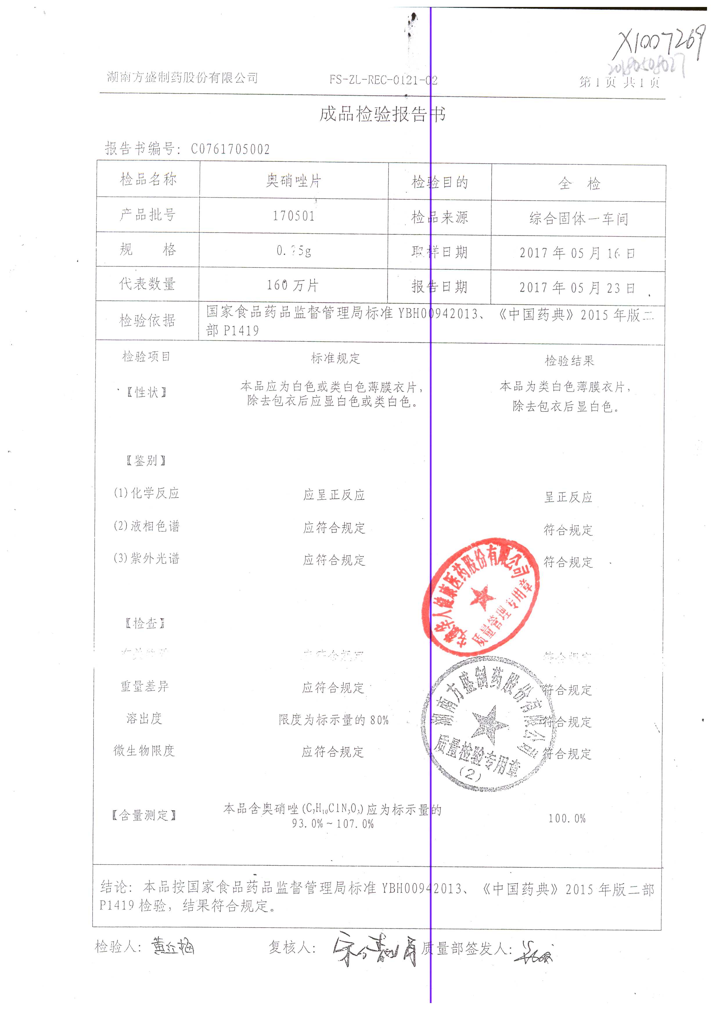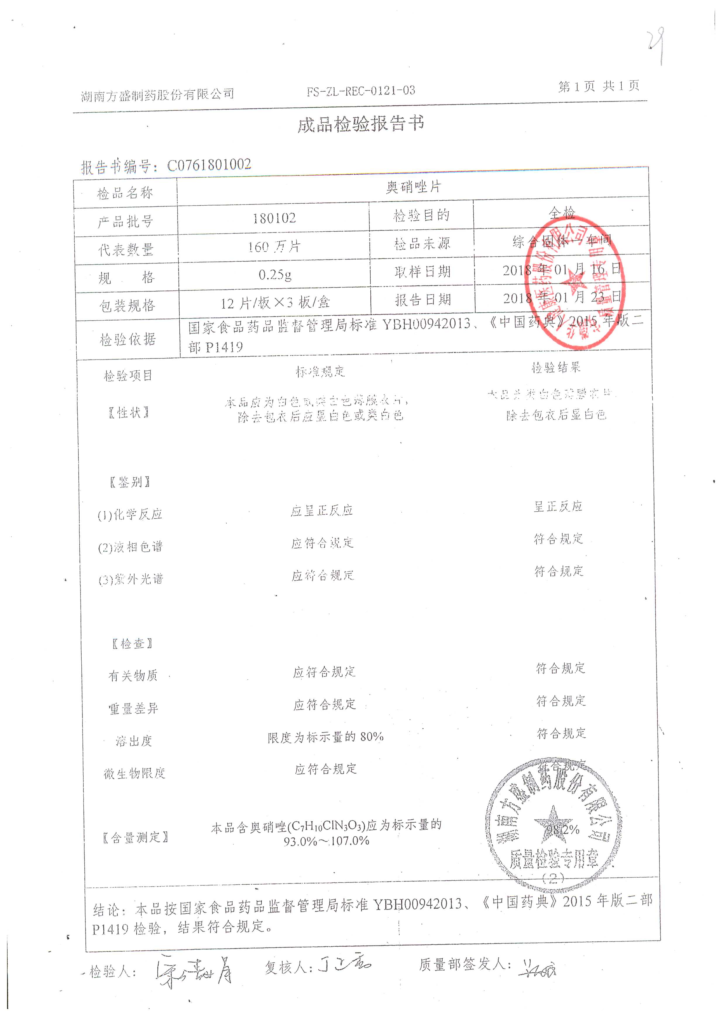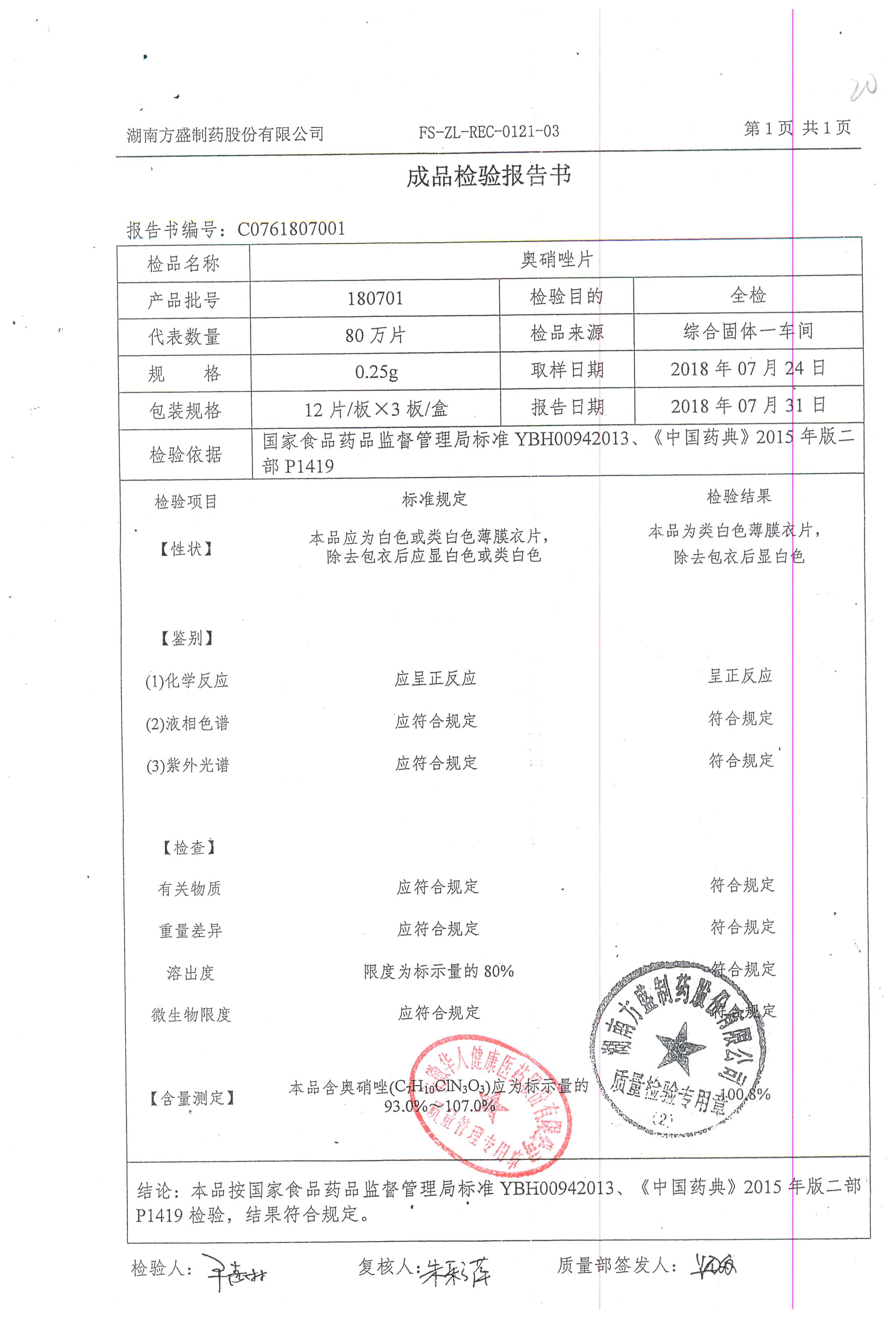 | 奧硝唑片 | 0.25g-36s | 180701 | 查看詳情 |