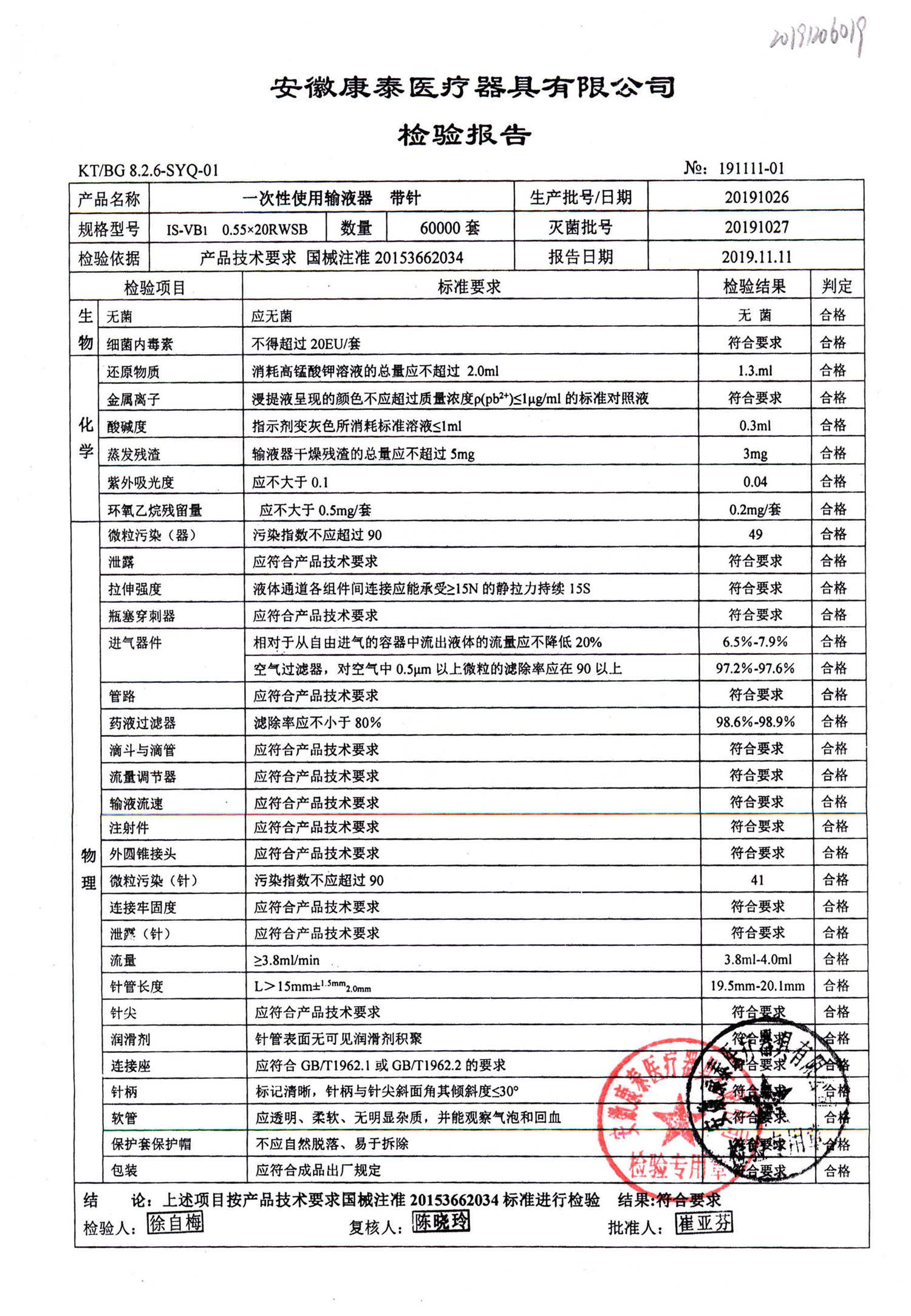 | 一次性使用輸液器 帶針 | 0.55*20RWSB | 20191026 | 查看詳情 |