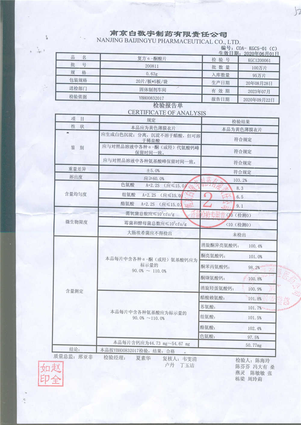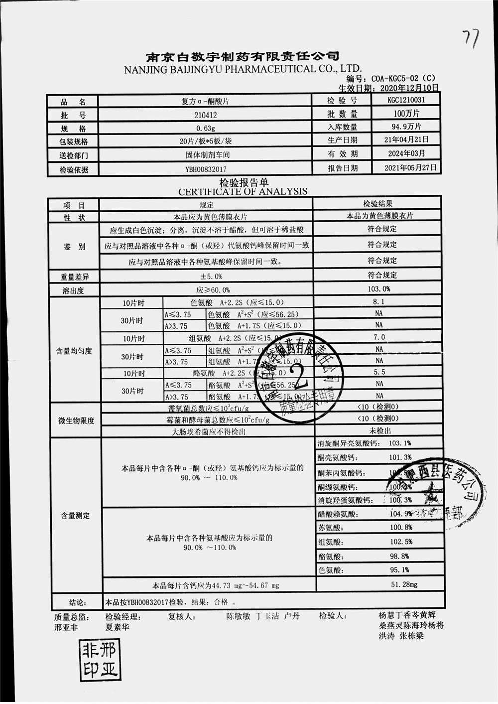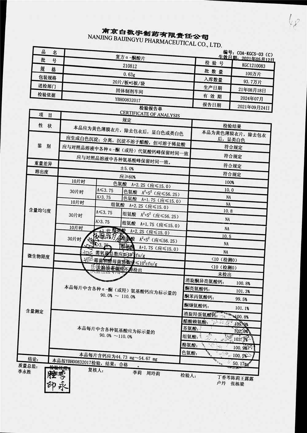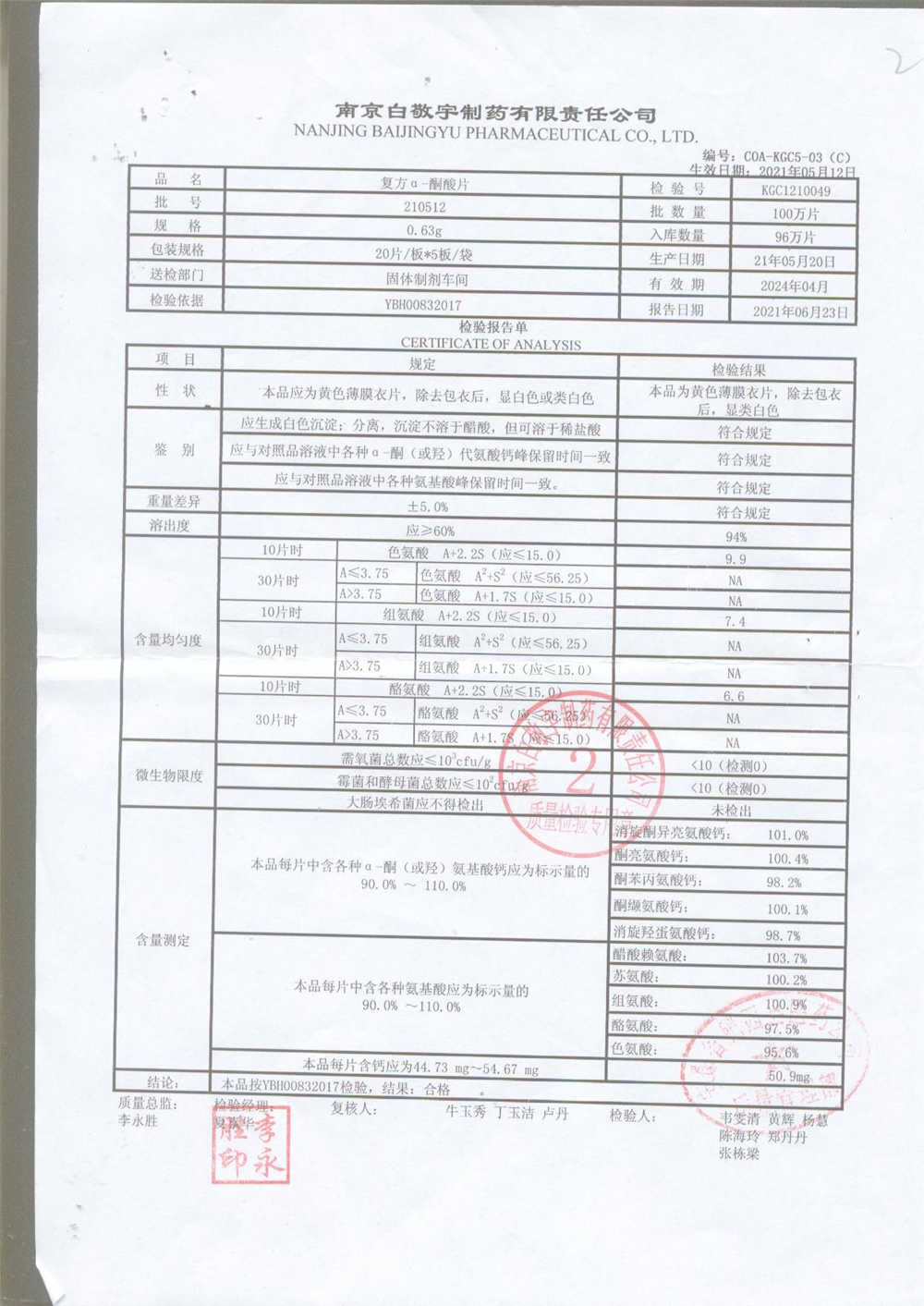 | 復方a-酮酸片 | 0.63g*20s*5板 | 210408 | 查看詳情 |