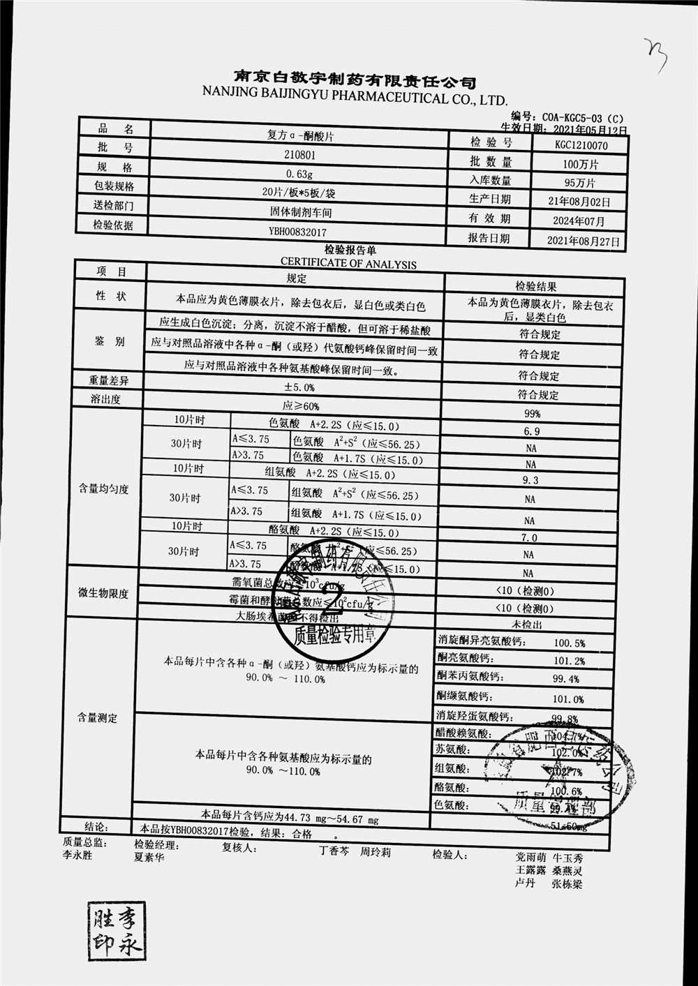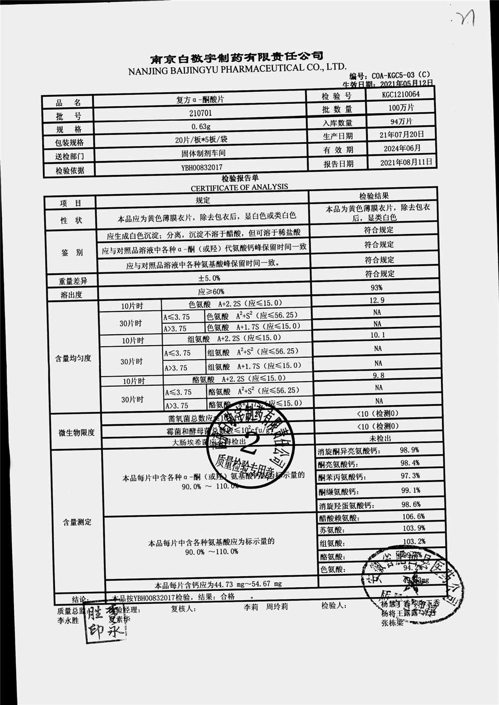 | 復方a-酮酸片 | 0.63g*20s*5板 | 210801 | 查看詳情 |