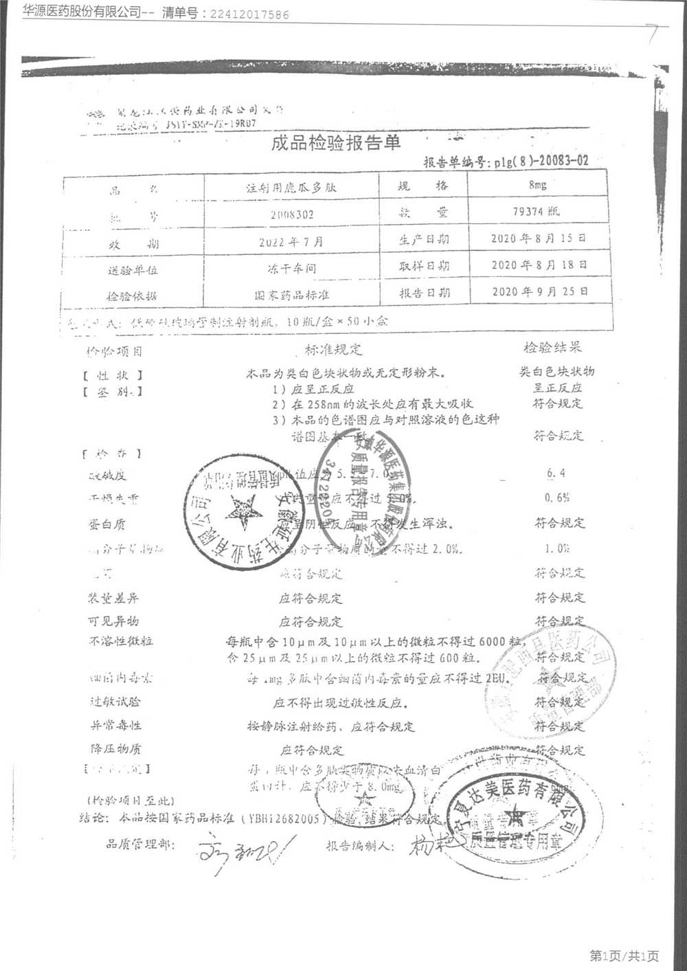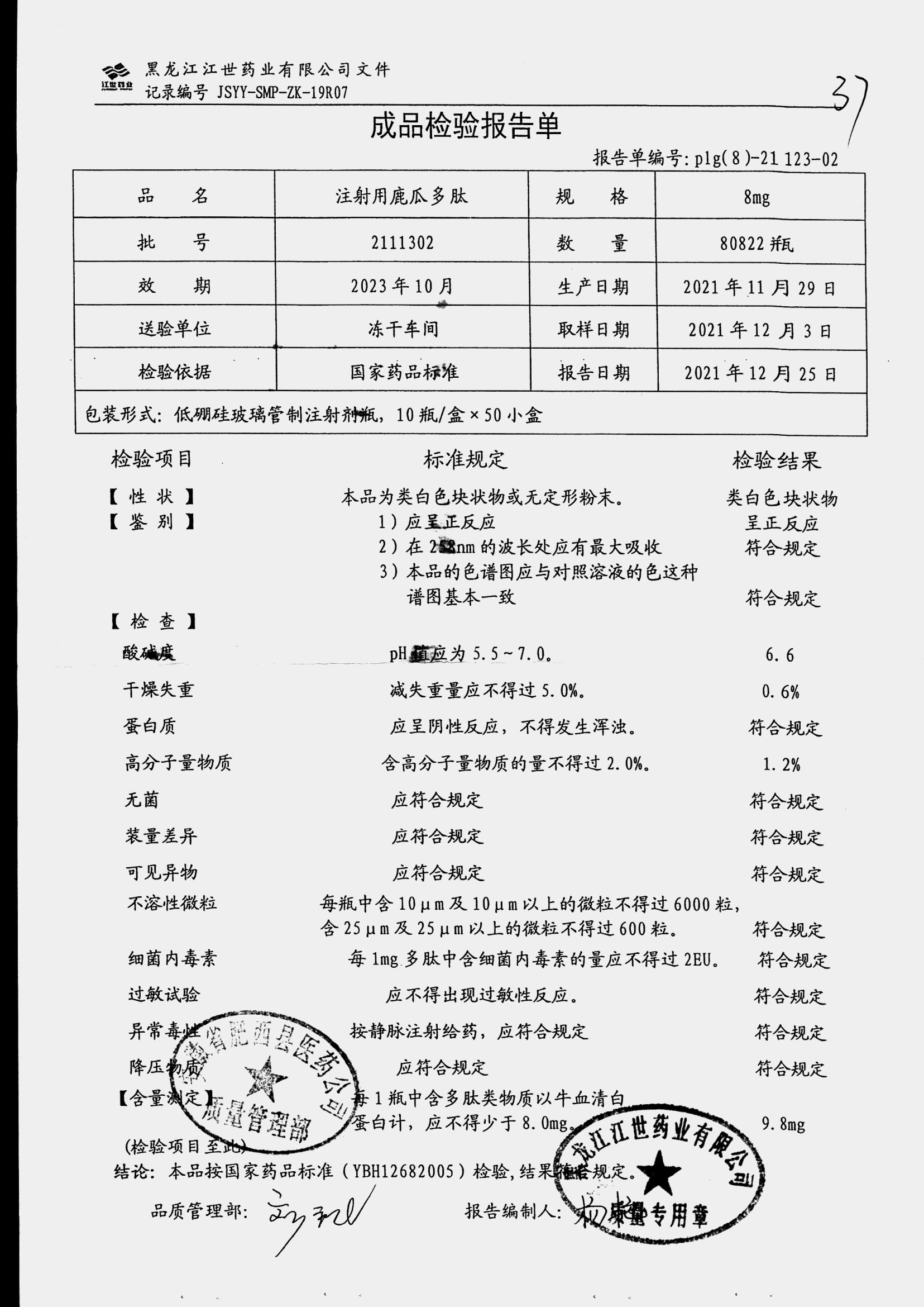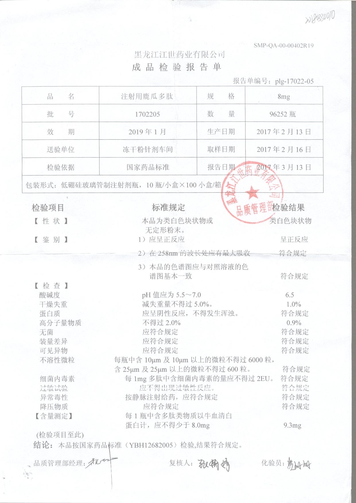 | 注射用鹿瓜多肽 | 8mg | 2111302-2 | 查看詳情 |
