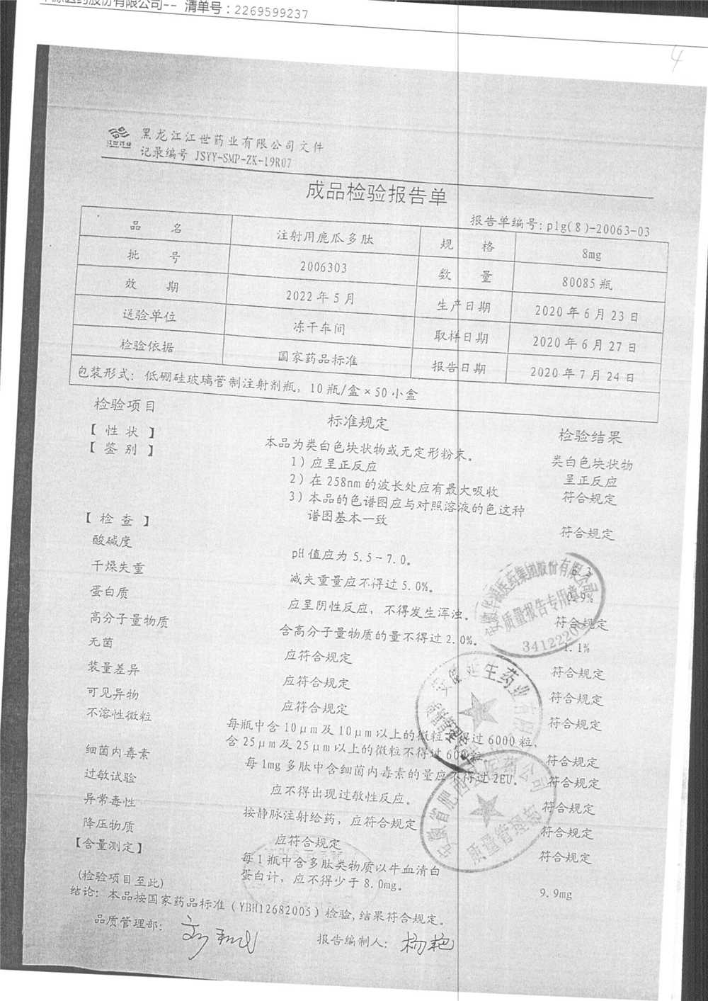 | 注射用鹿瓜多肽 | 8mg | 2111302-3 | 查看詳情 |