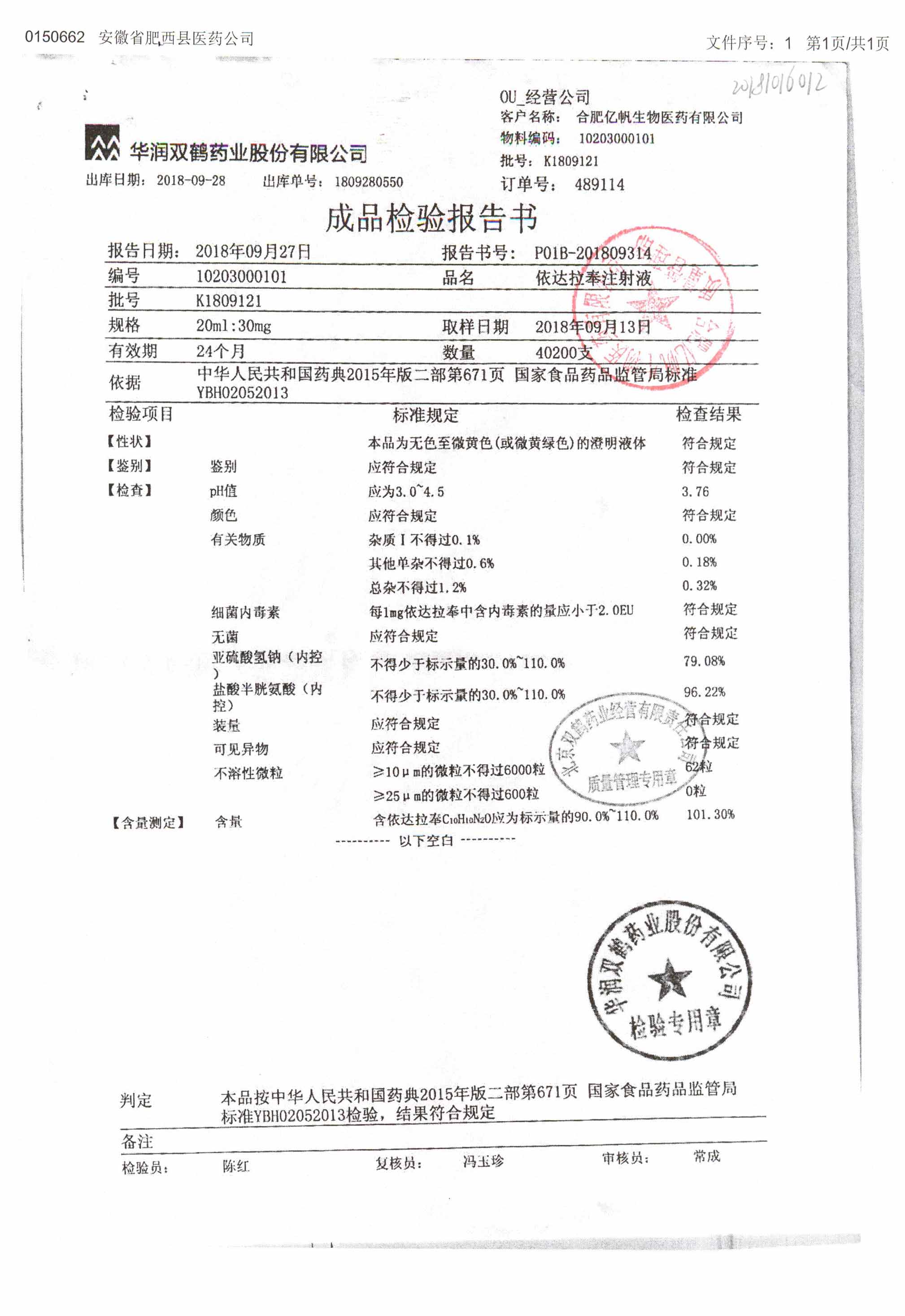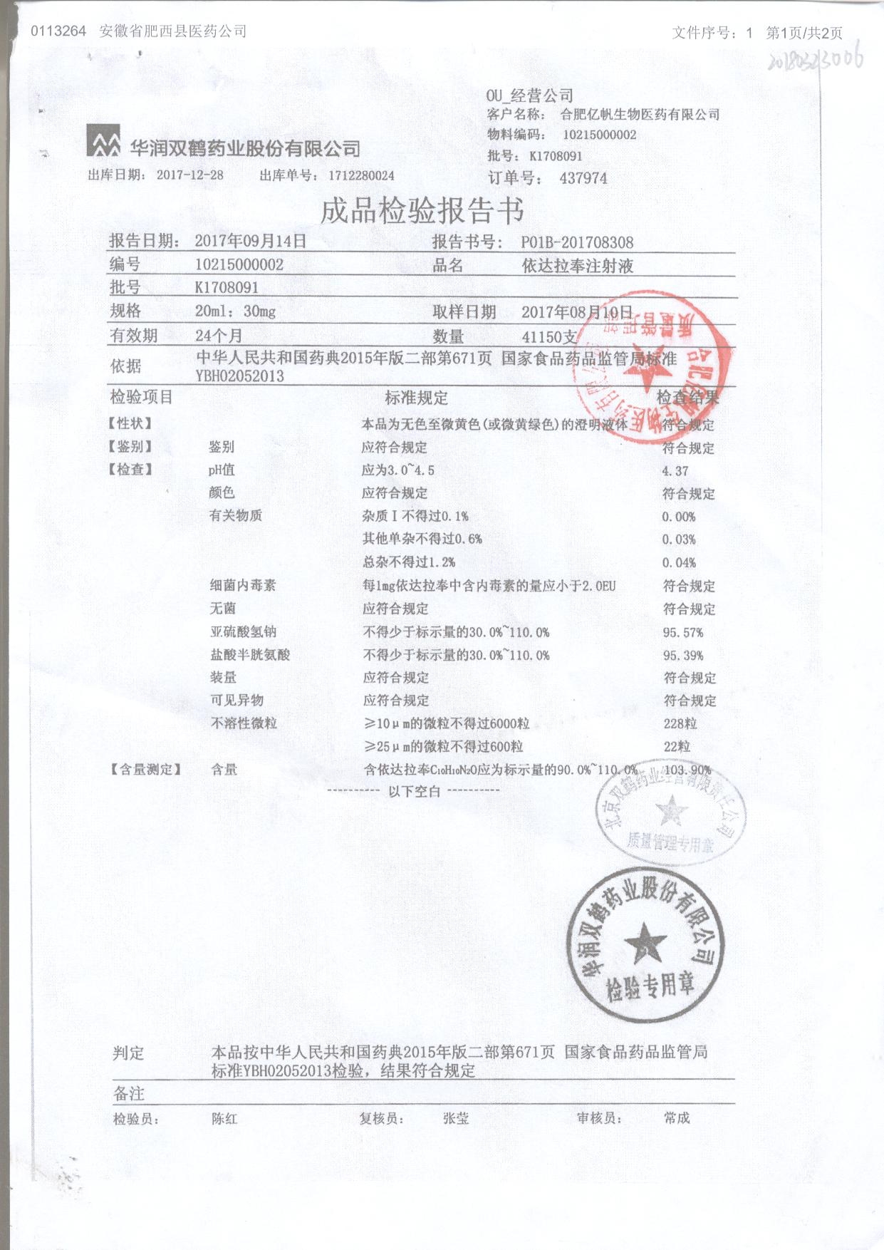依達拉奉注射液 20ml:30mg K1708091 查看詳情
