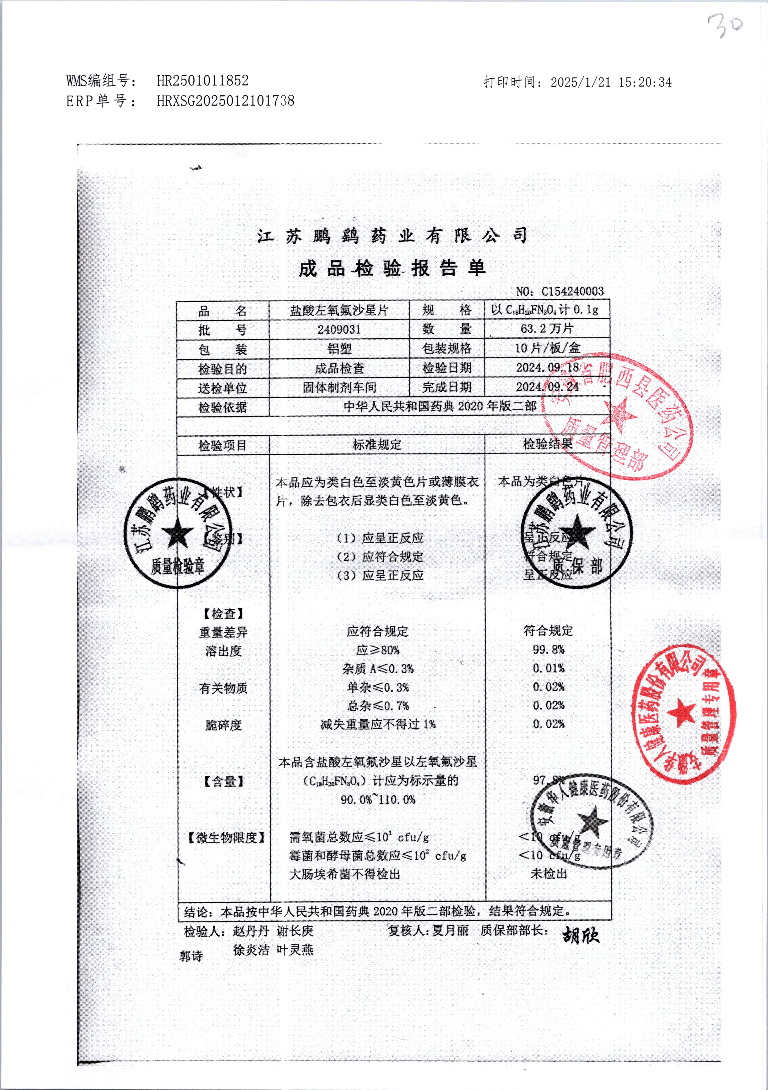 | 鹽酸左氧氟沙星片 | 16s | 2409031 | 查看詳情 |