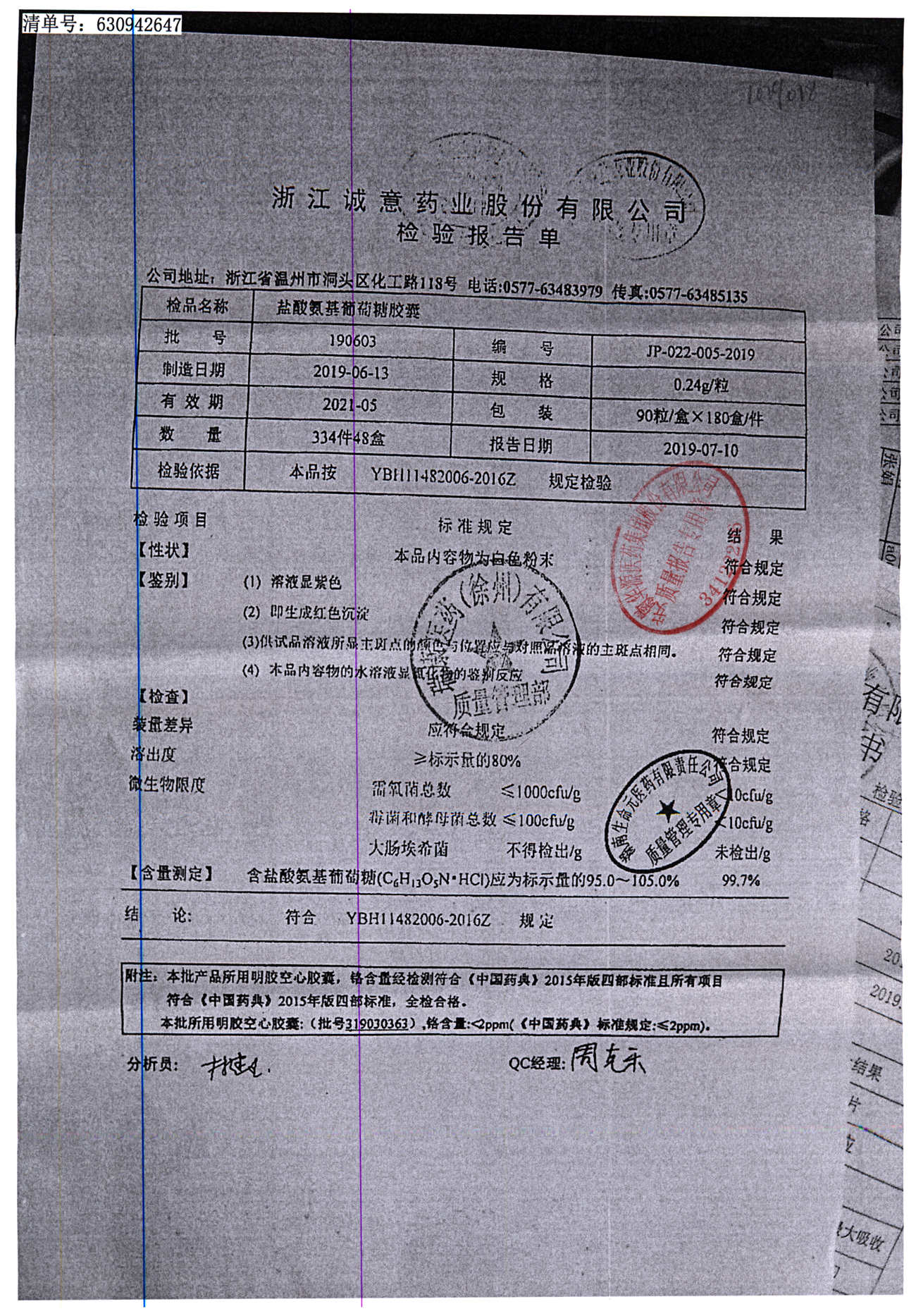 | 鹽酸氨基葡萄糖膠囊 | 0.24g*90s | 190603 | 查看詳情 |