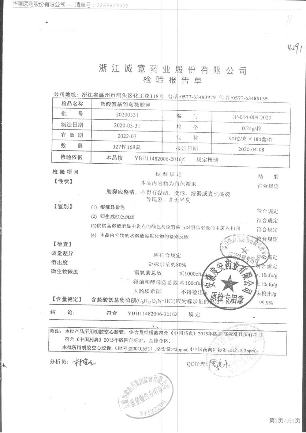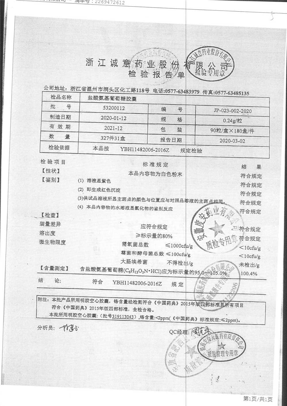| 鹽酸氨基葡萄糖膠囊 | 0.24g*90s | 20200331 | 查看詳情 |
