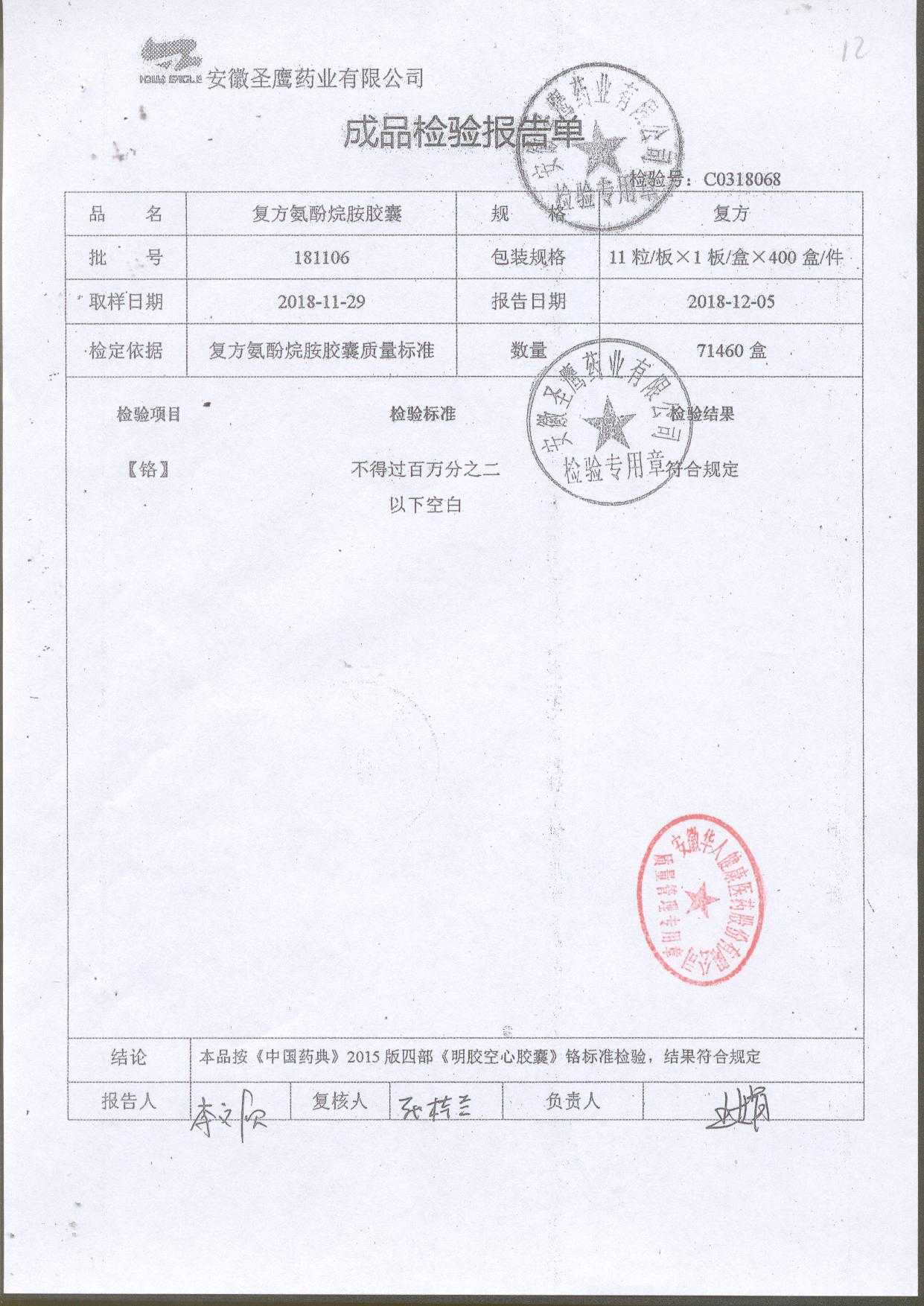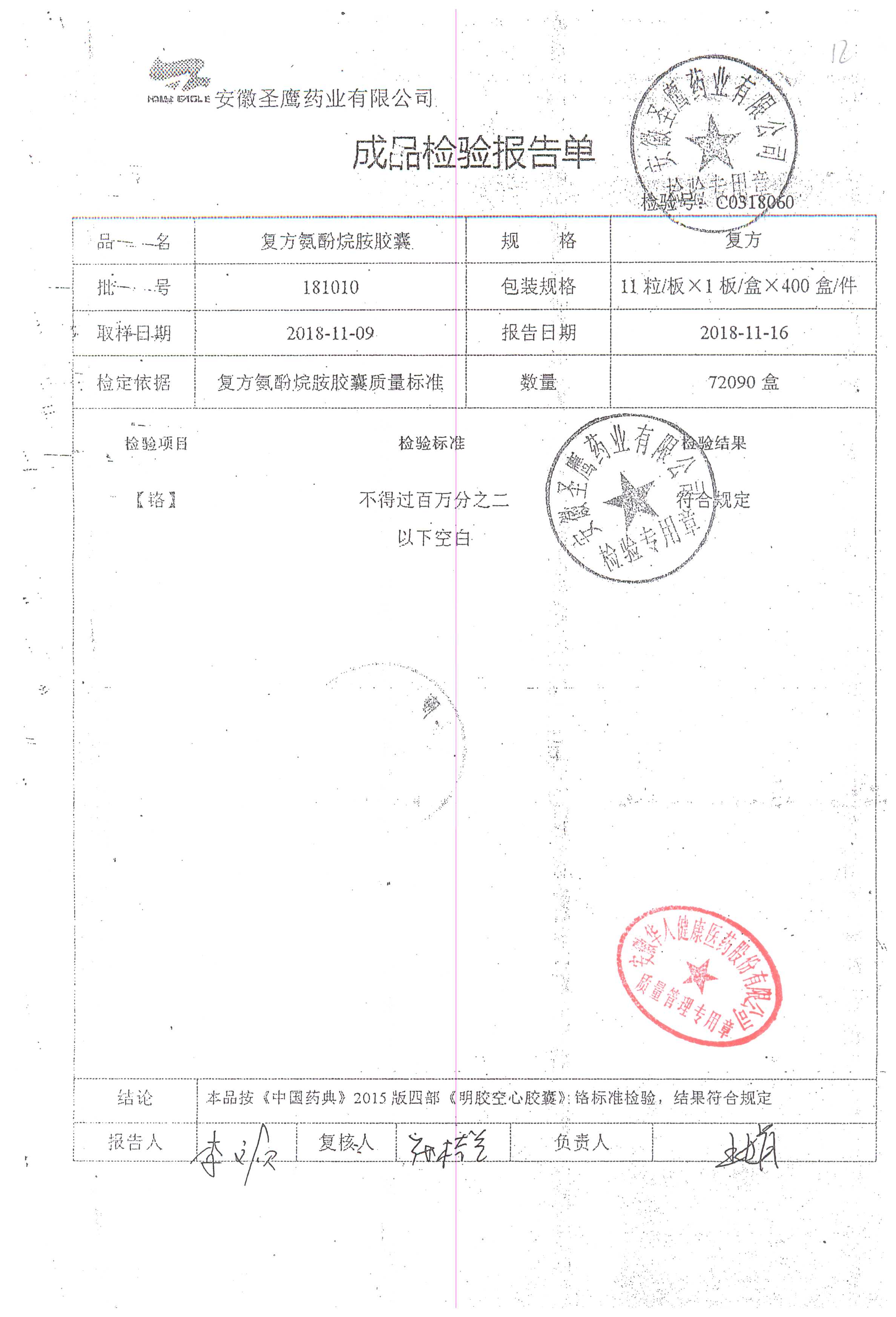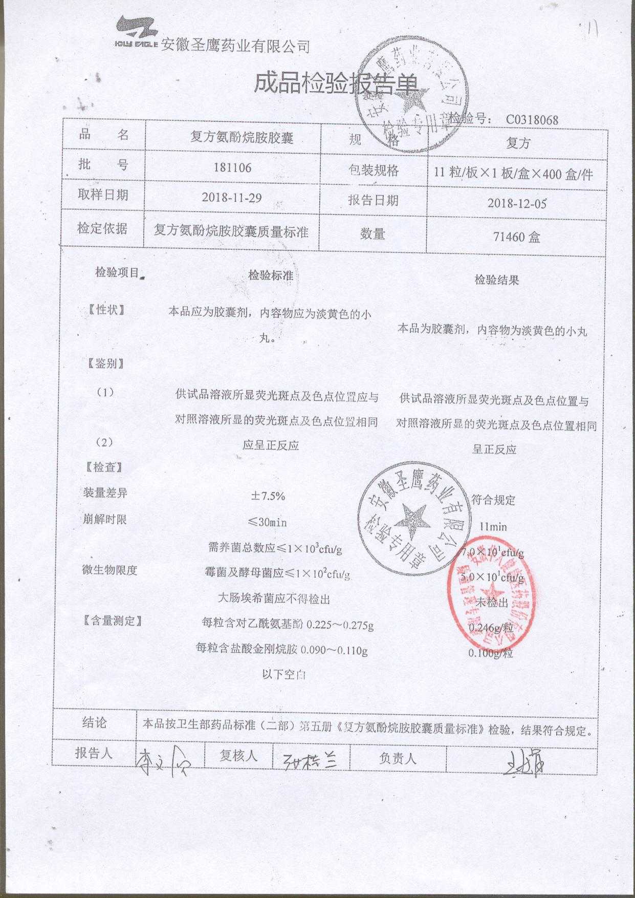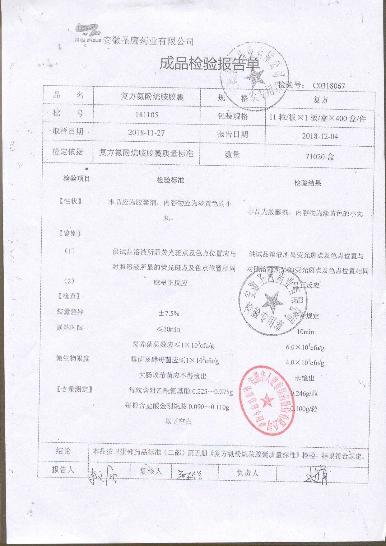 | 復(fù)方氨酚烷胺膠囊 | 11s*1 | 181105(2/2) | 查看詳情 |