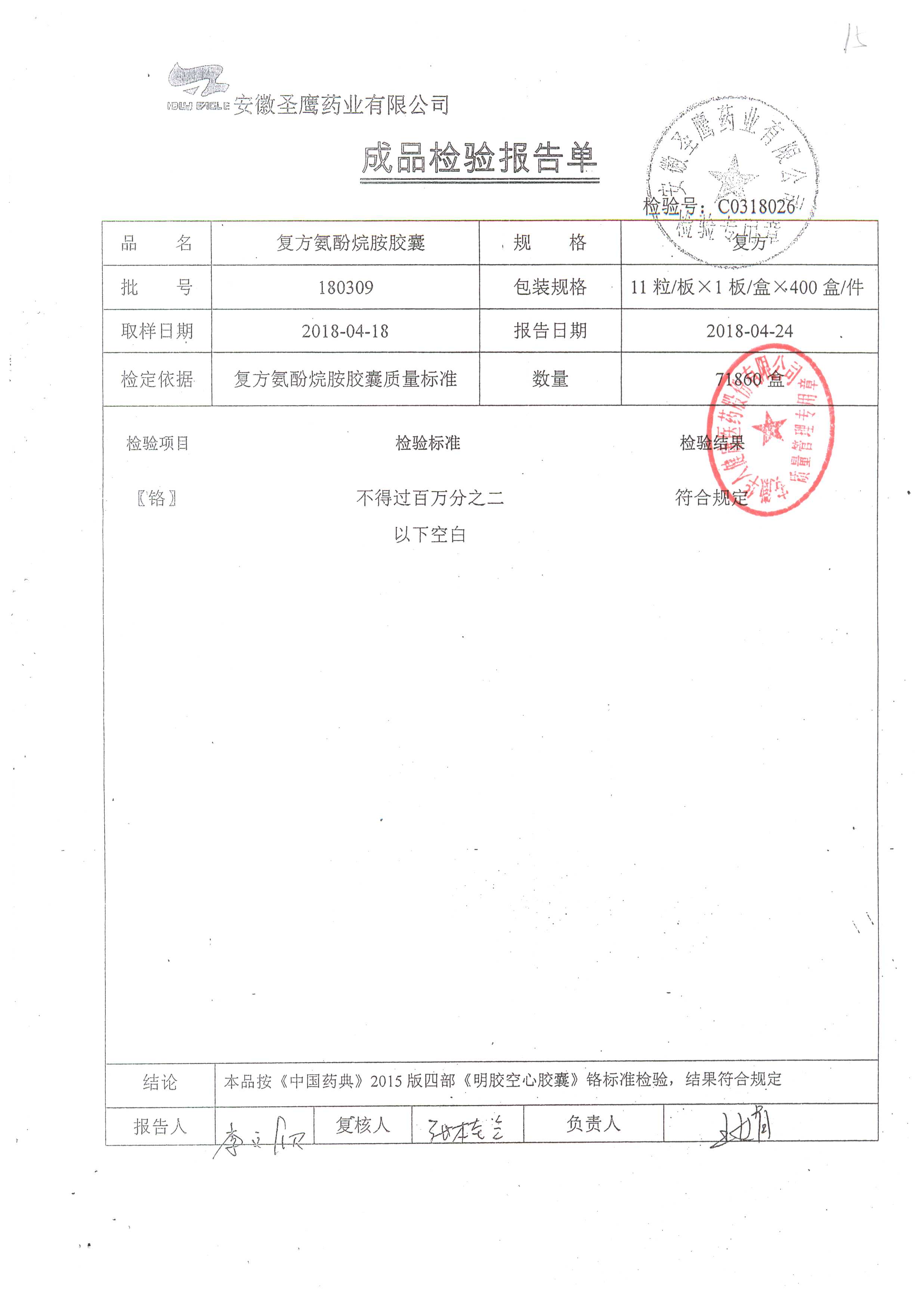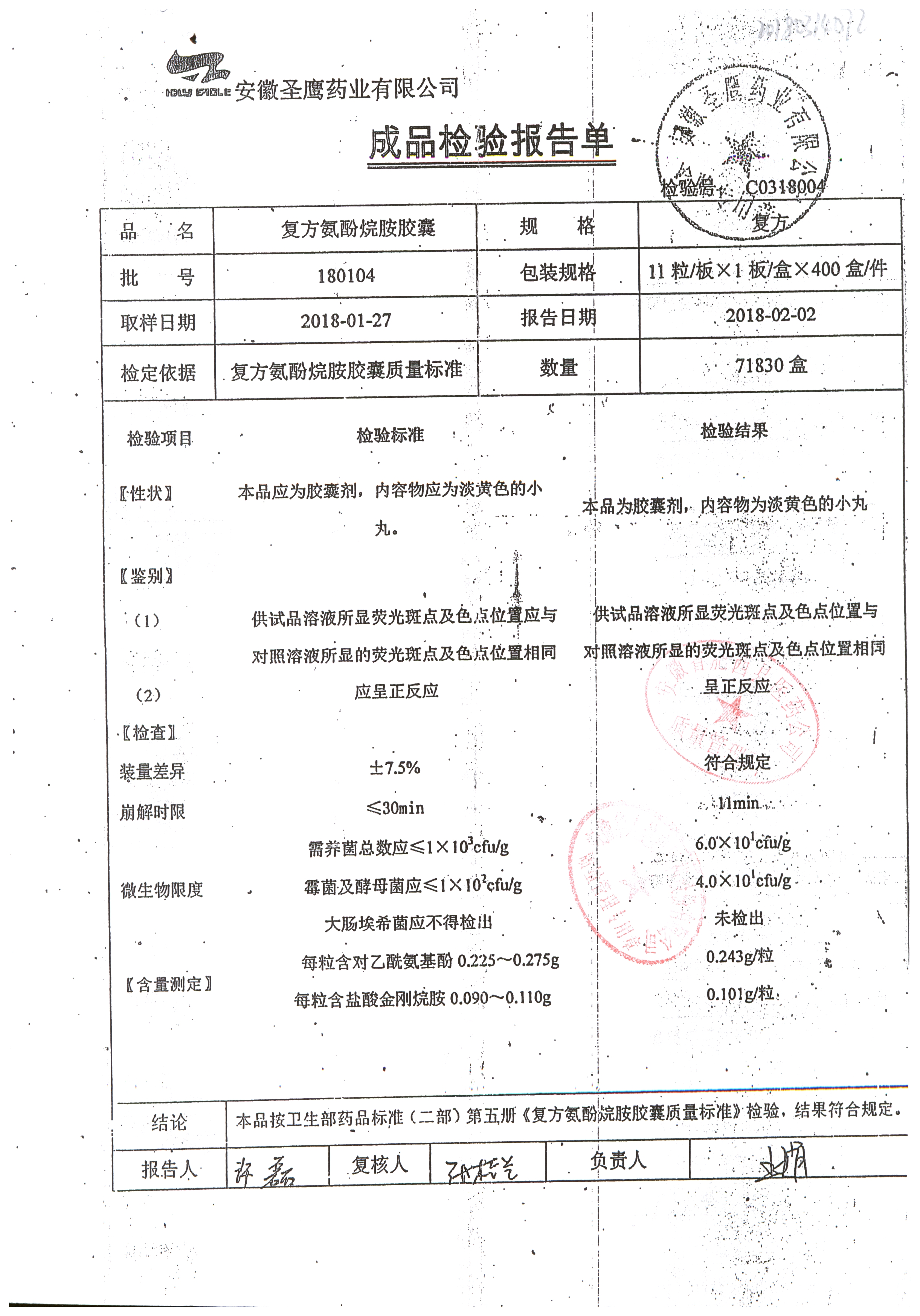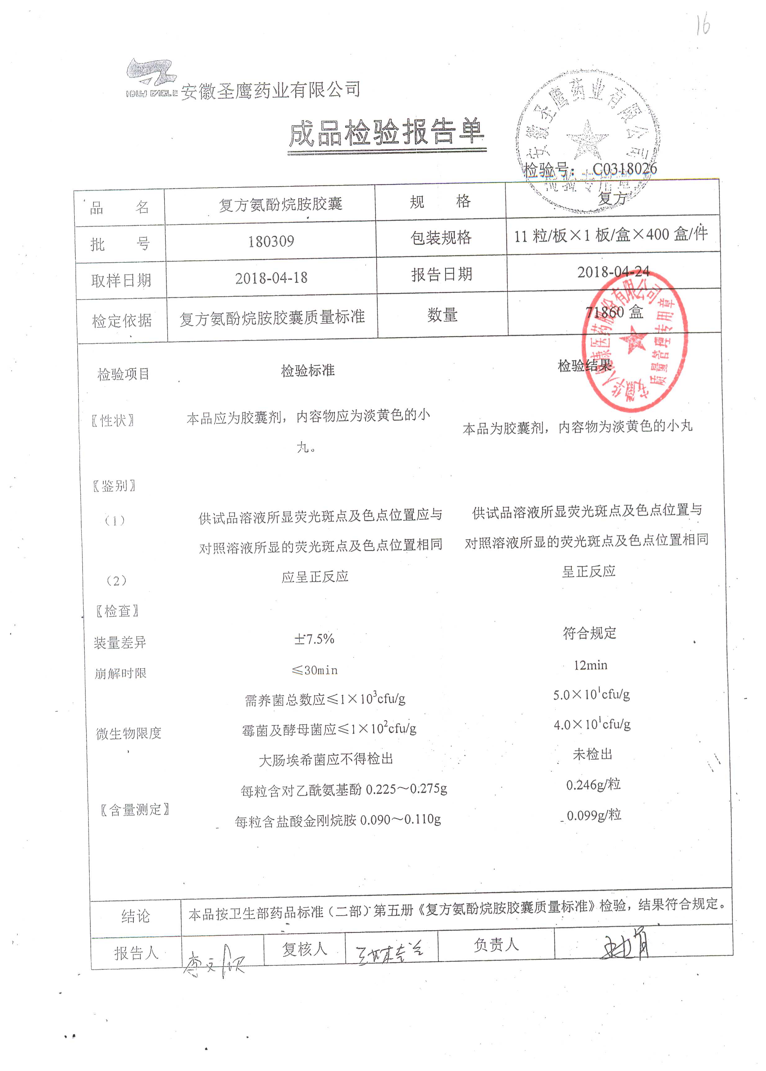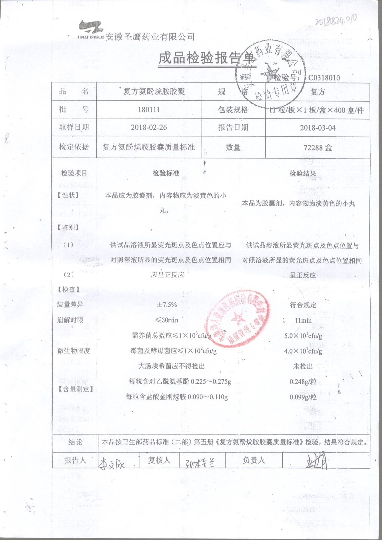 | 復(fù)方氨酚烷胺膠囊 | 11s*1 | 180405(1/2) | 查看詳情 |