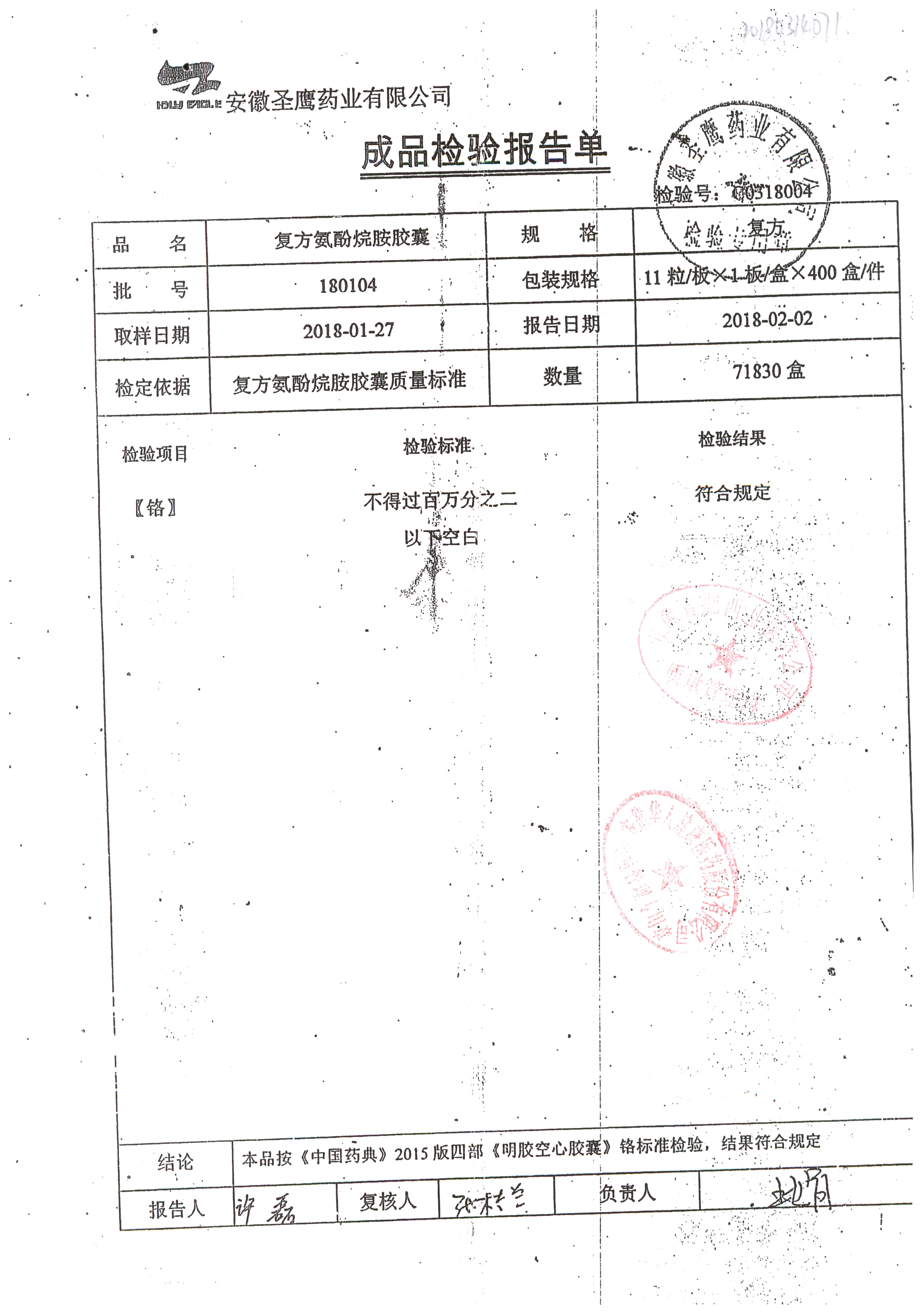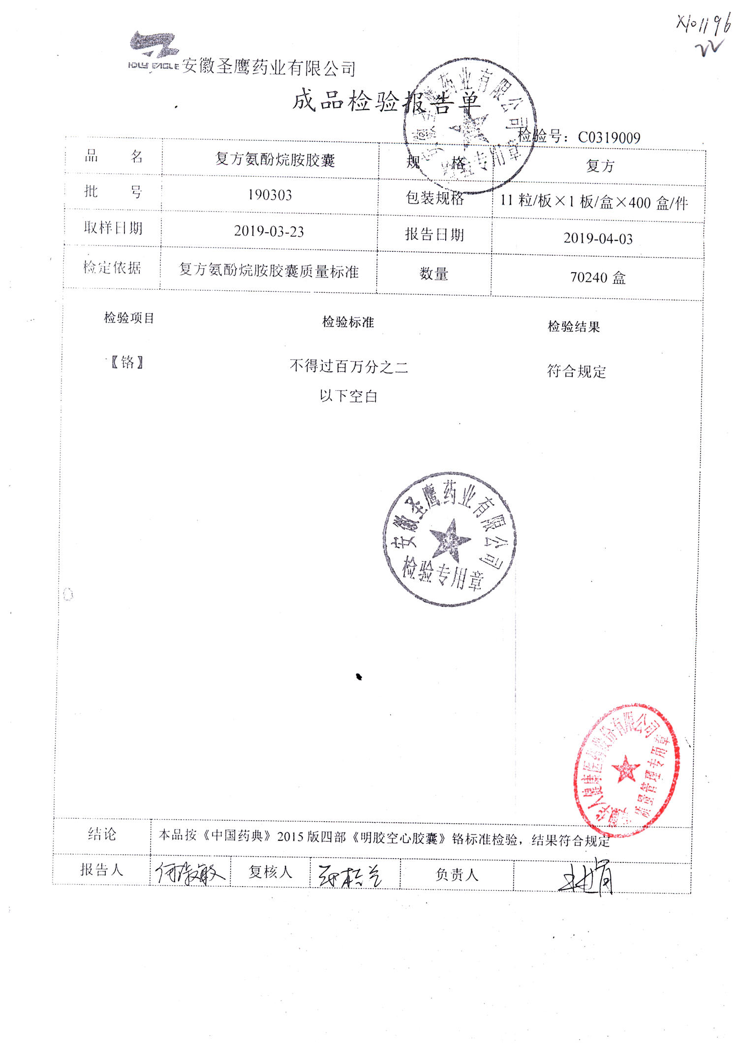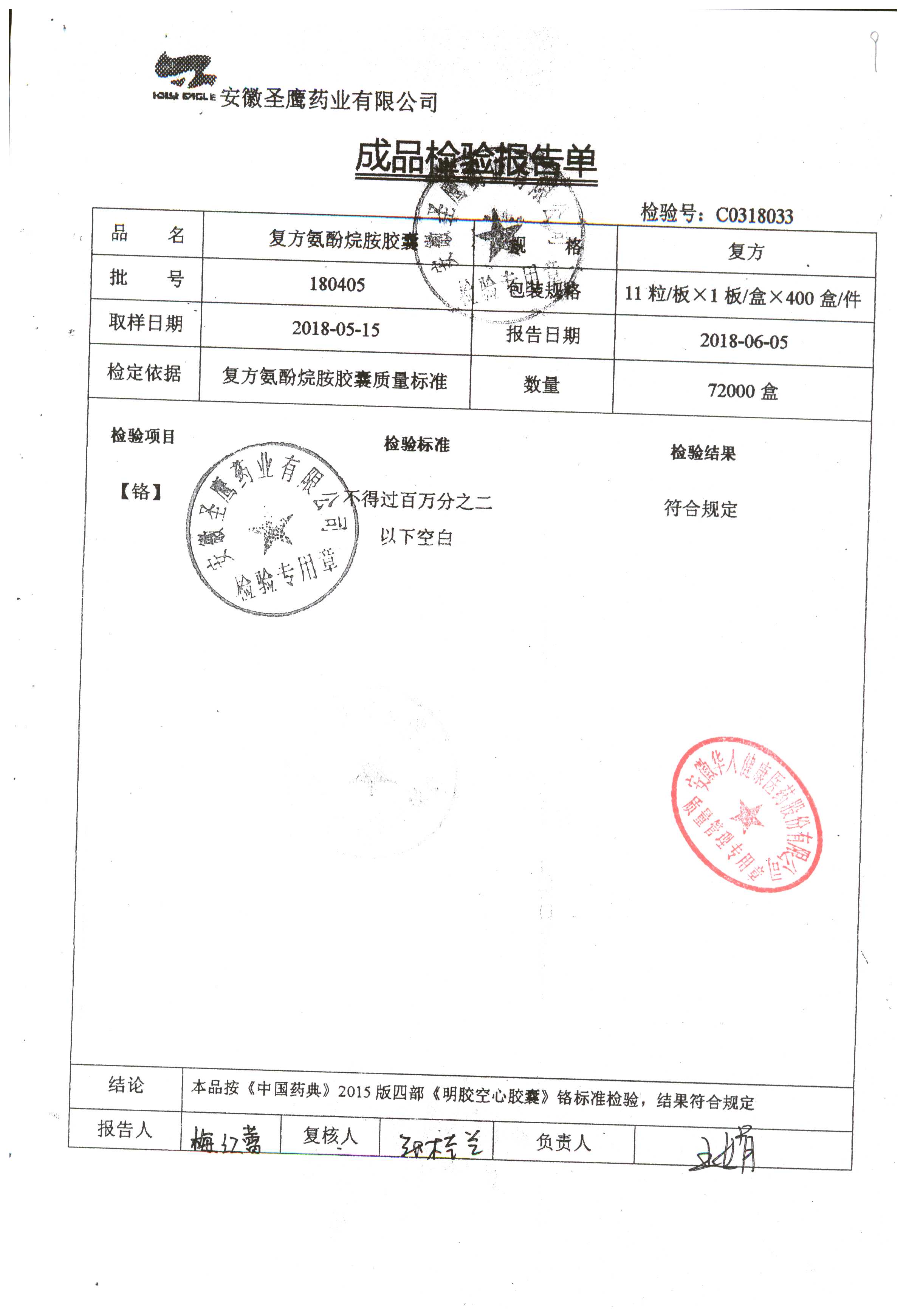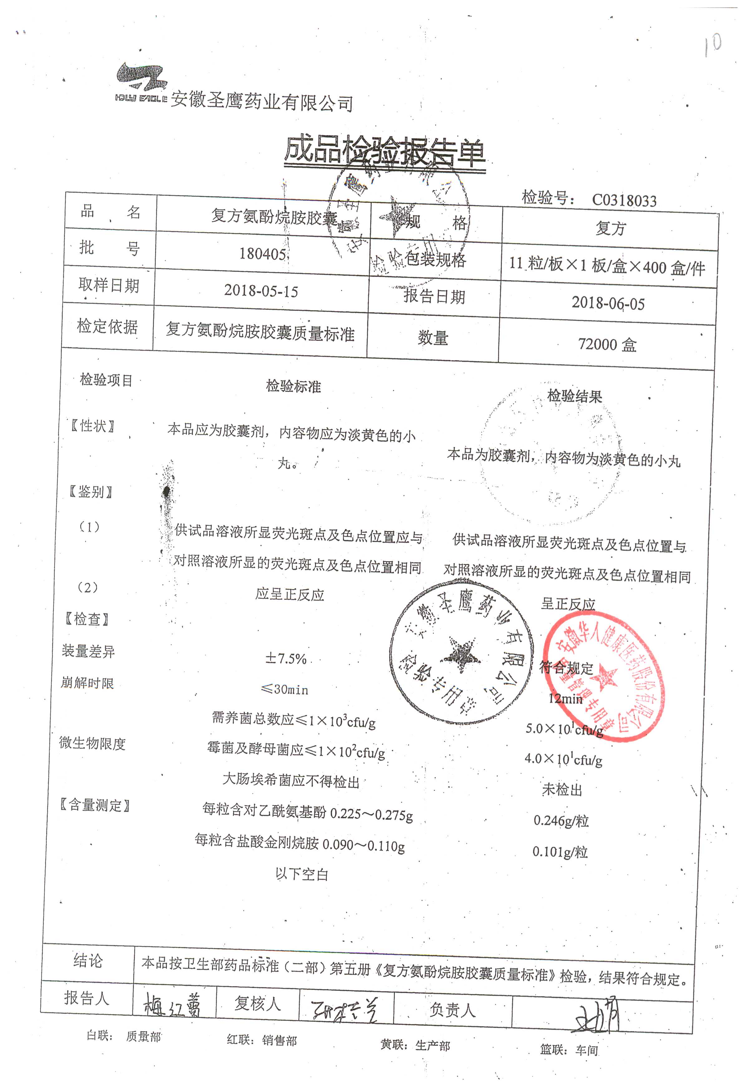 | 復(fù)方氨酚烷胺膠囊 | 11s*1 | 180405(1/2) | 查看詳情 |