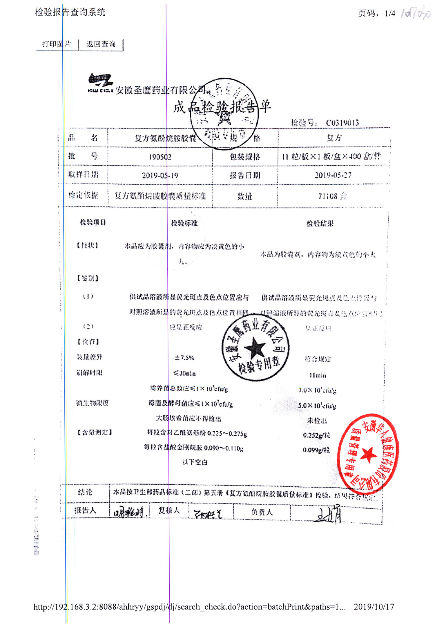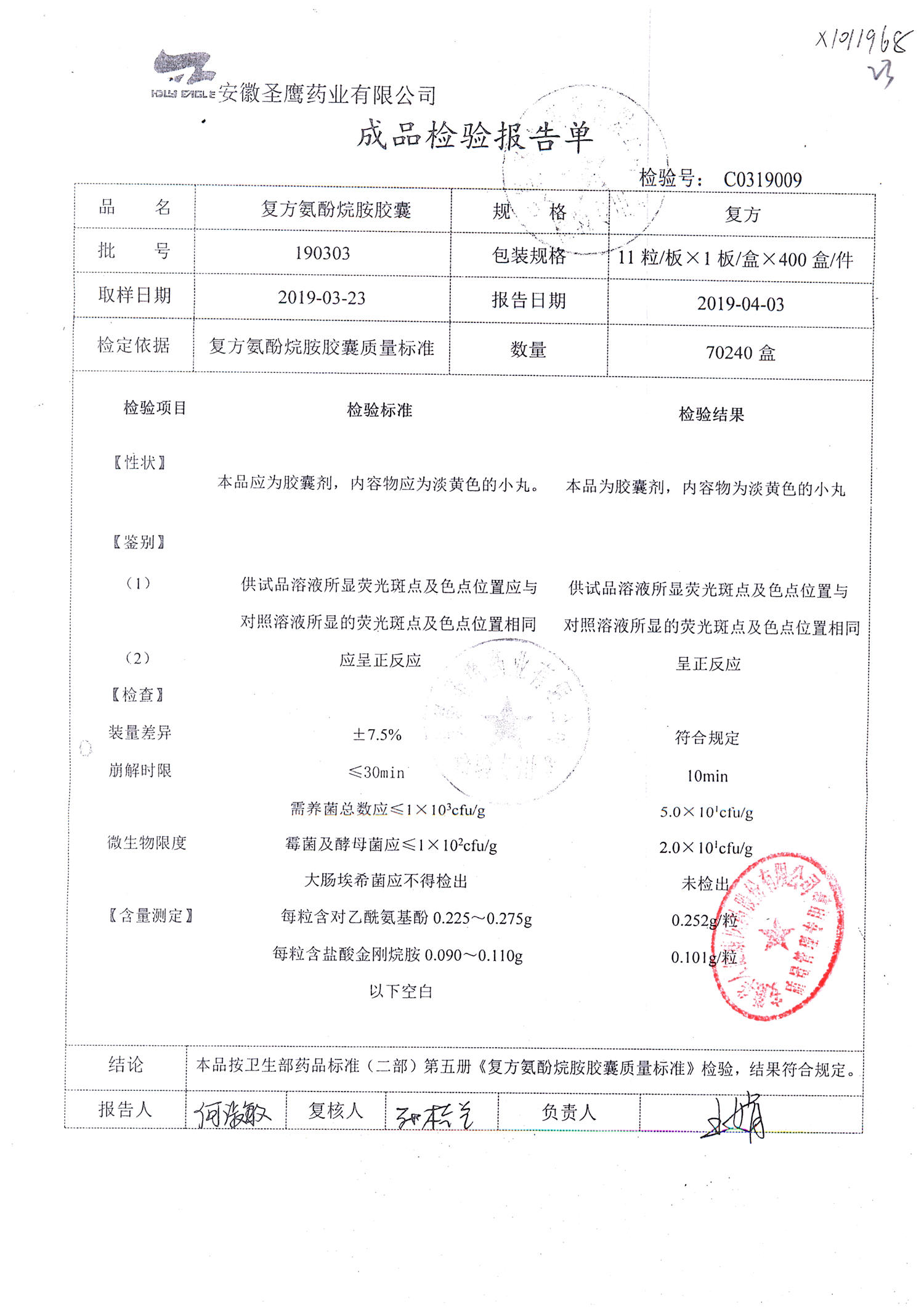 | 復(fù)方氨酚烷胺膠囊 | 11s*1 | 190501 | 查看詳情 |