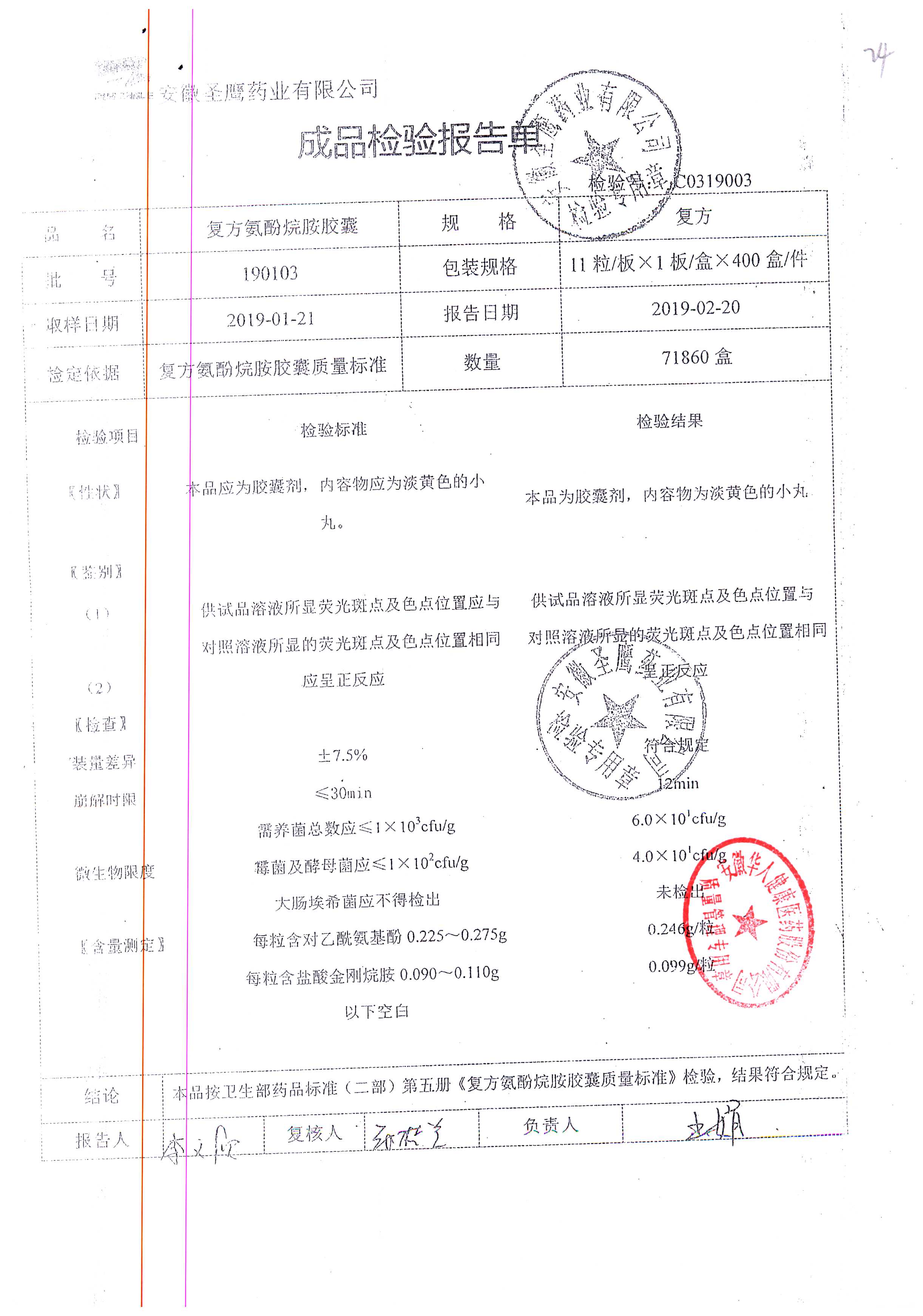 | 復(fù)方氨酚烷胺膠囊 | 11s*1 | 190201(1/2) | 查看詳情 |