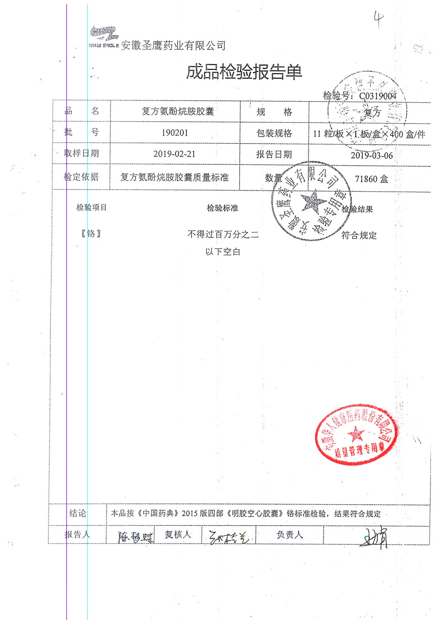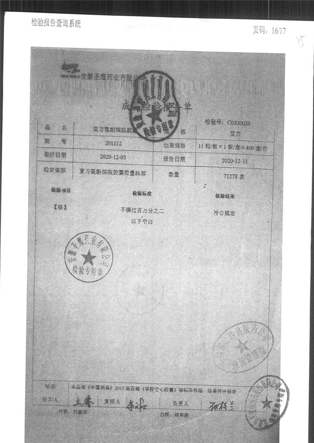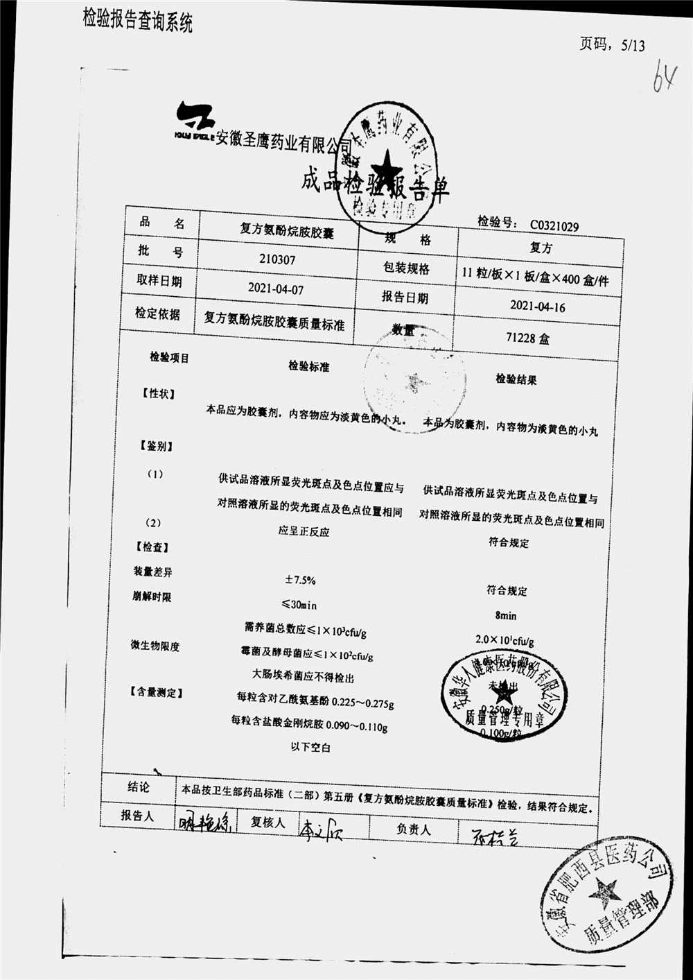 | 復(fù)方氨酚烷胺膠囊 | 11s*1 | 201201(2/2) | 查看詳情 |