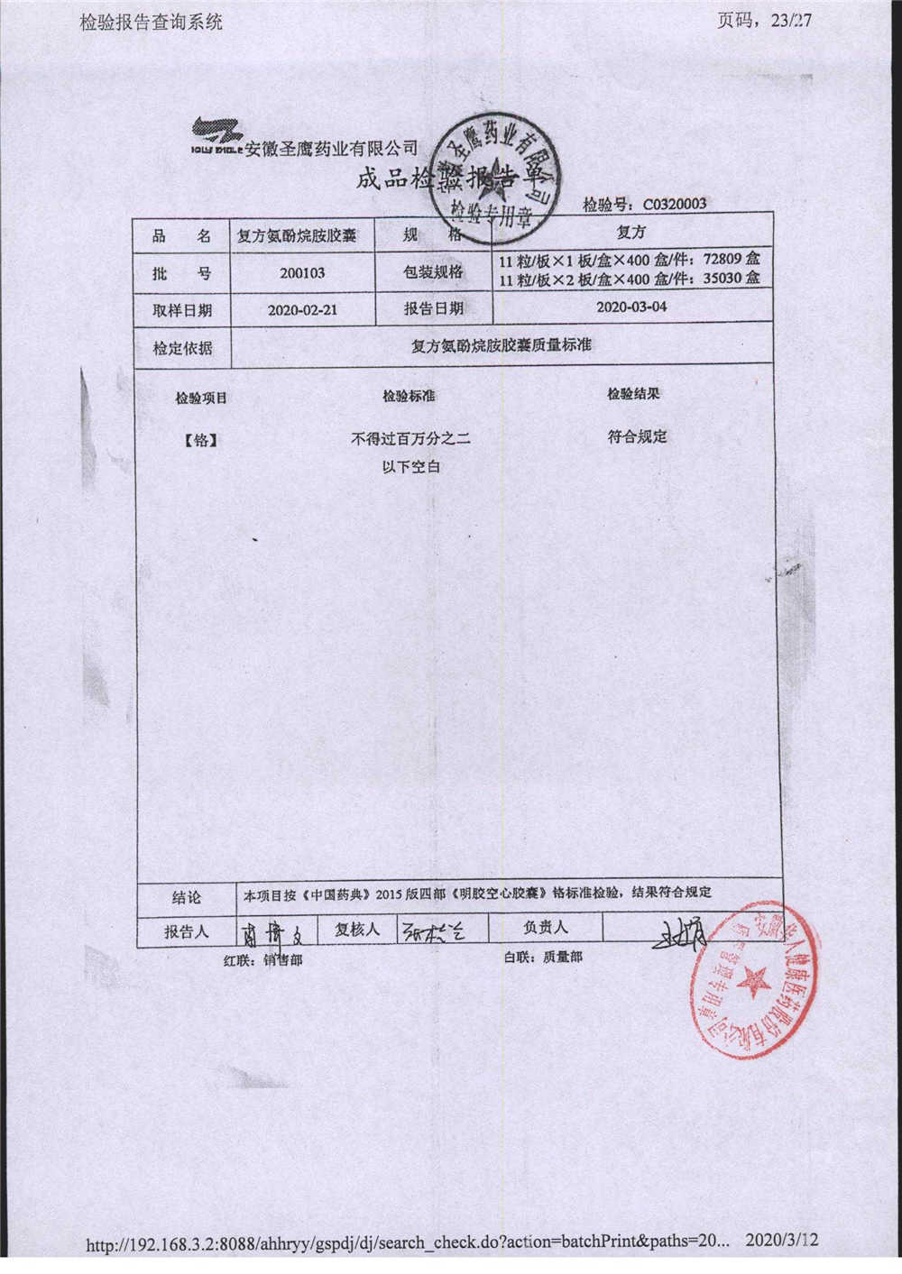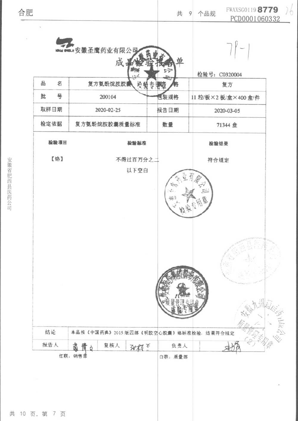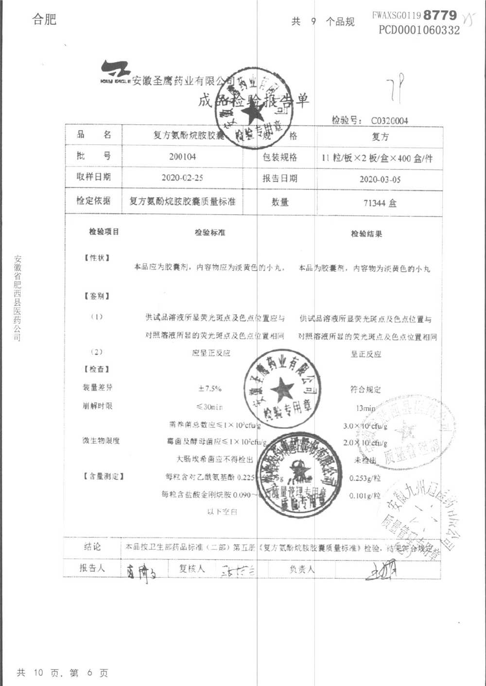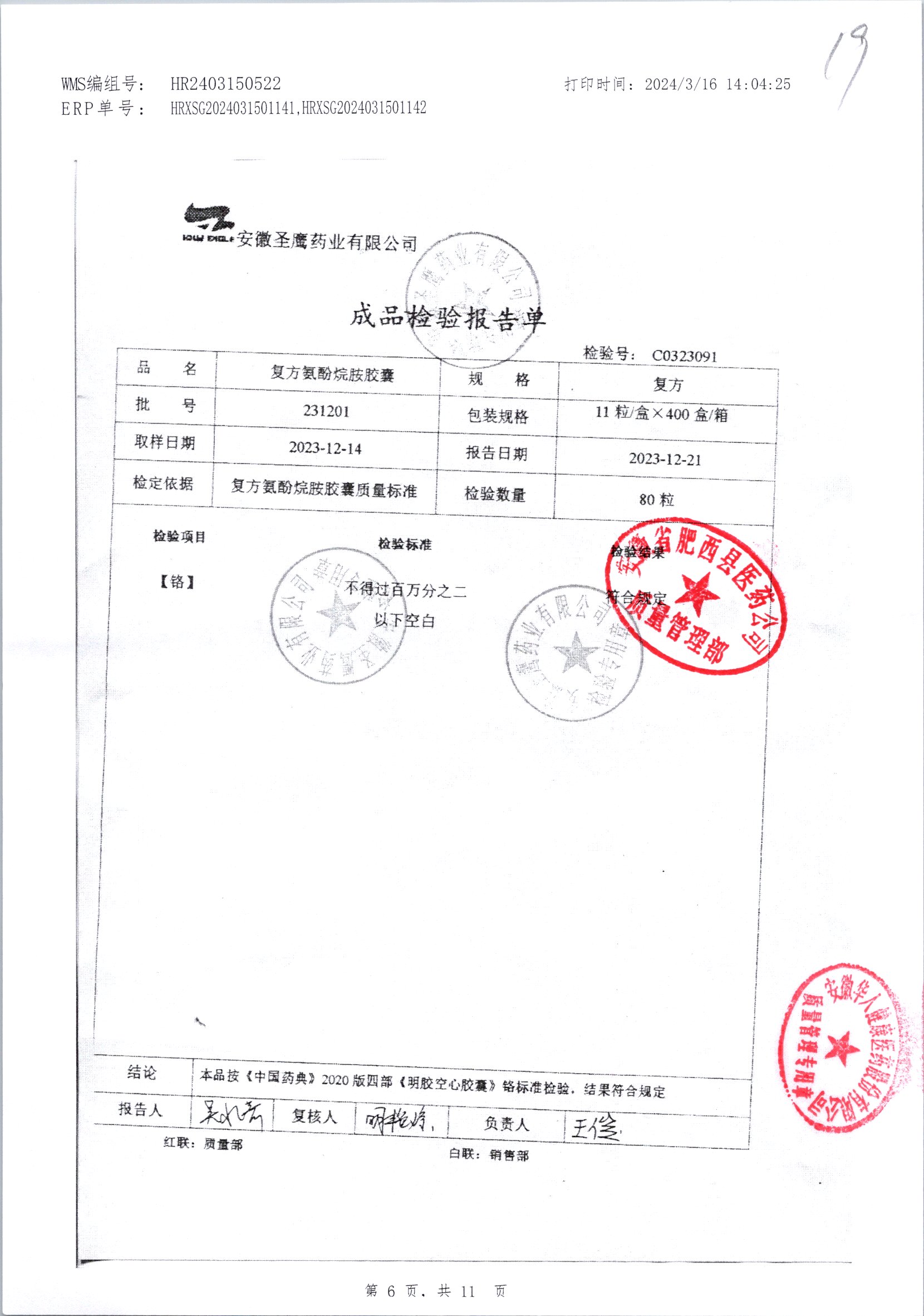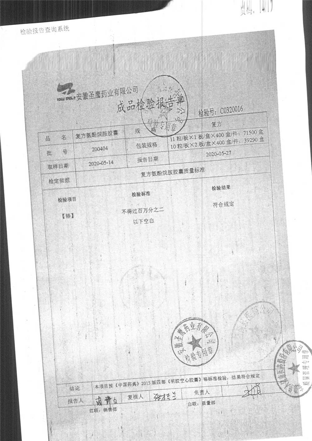 | 復(fù)方氨酚烷胺膠囊 | 11s*1 | 200404(1/2) | 查看詳情 |