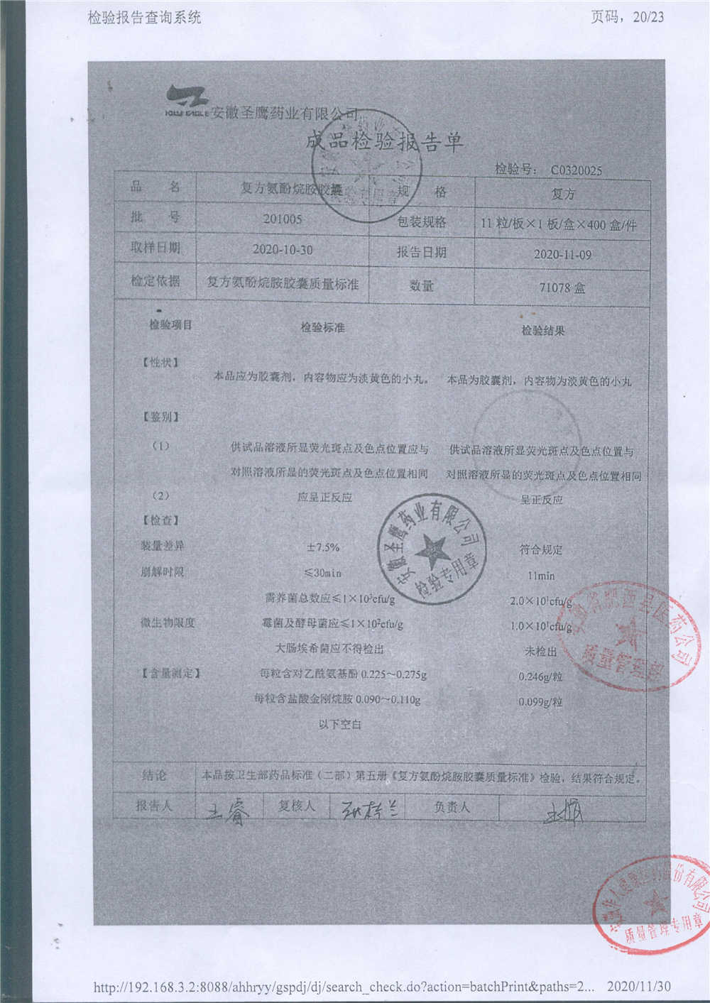 | 復(fù)方氨酚烷胺膠囊 | 11s*1 | 201005(2/2) | 查看詳情 |