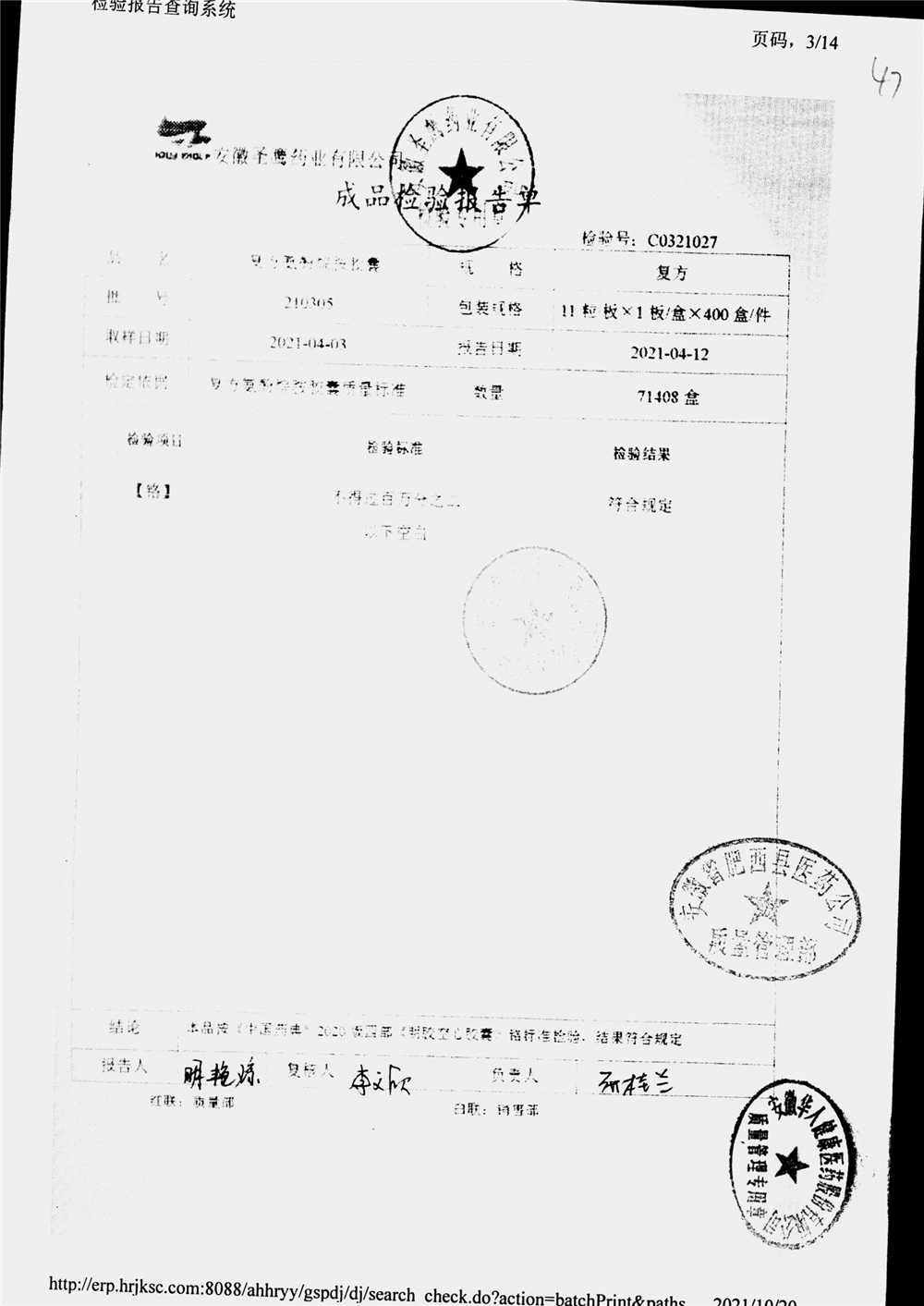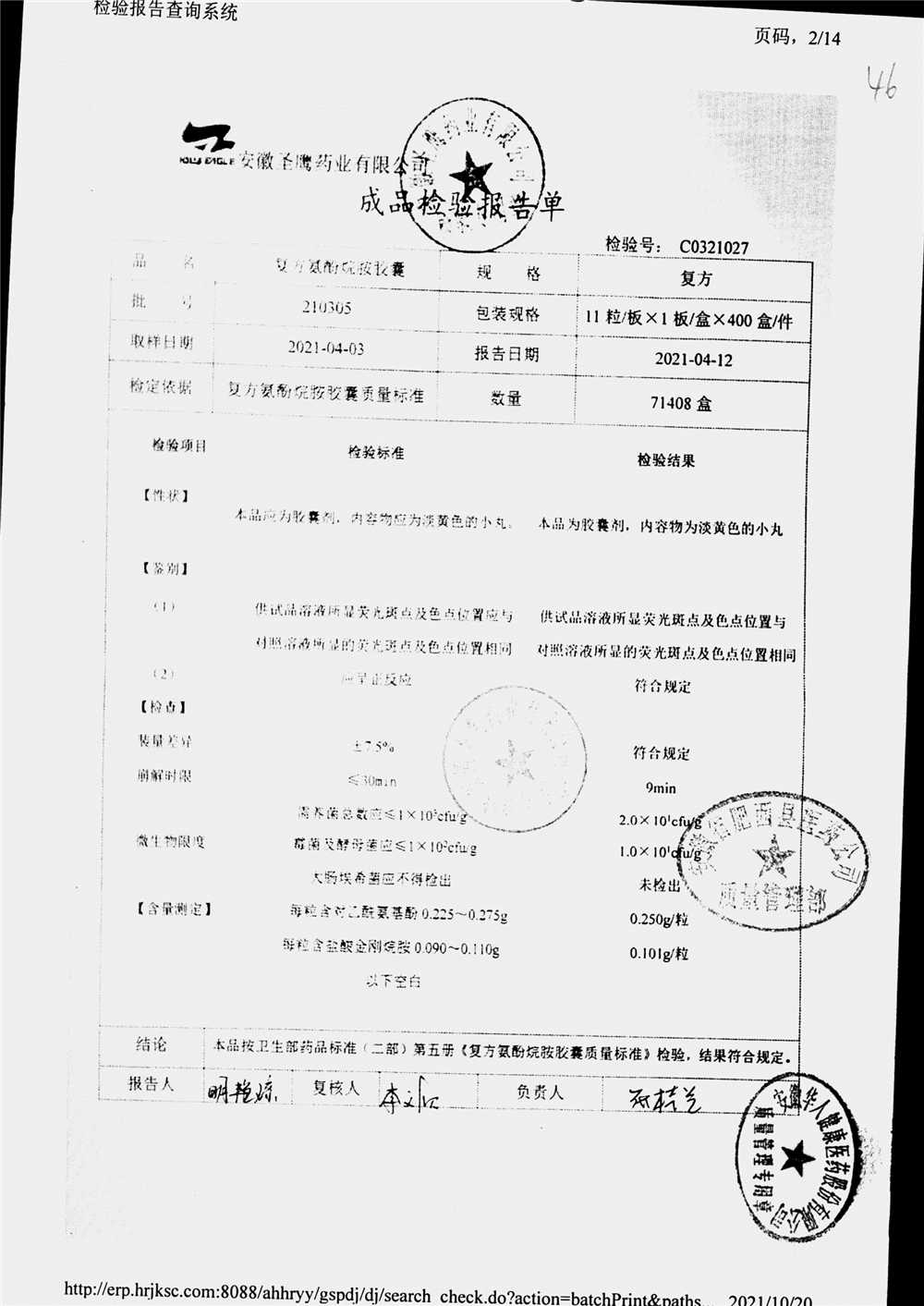 | 復(fù)方氨酚烷胺膠囊 | 11s*1 | 210307(1/2) | 查看詳情 |