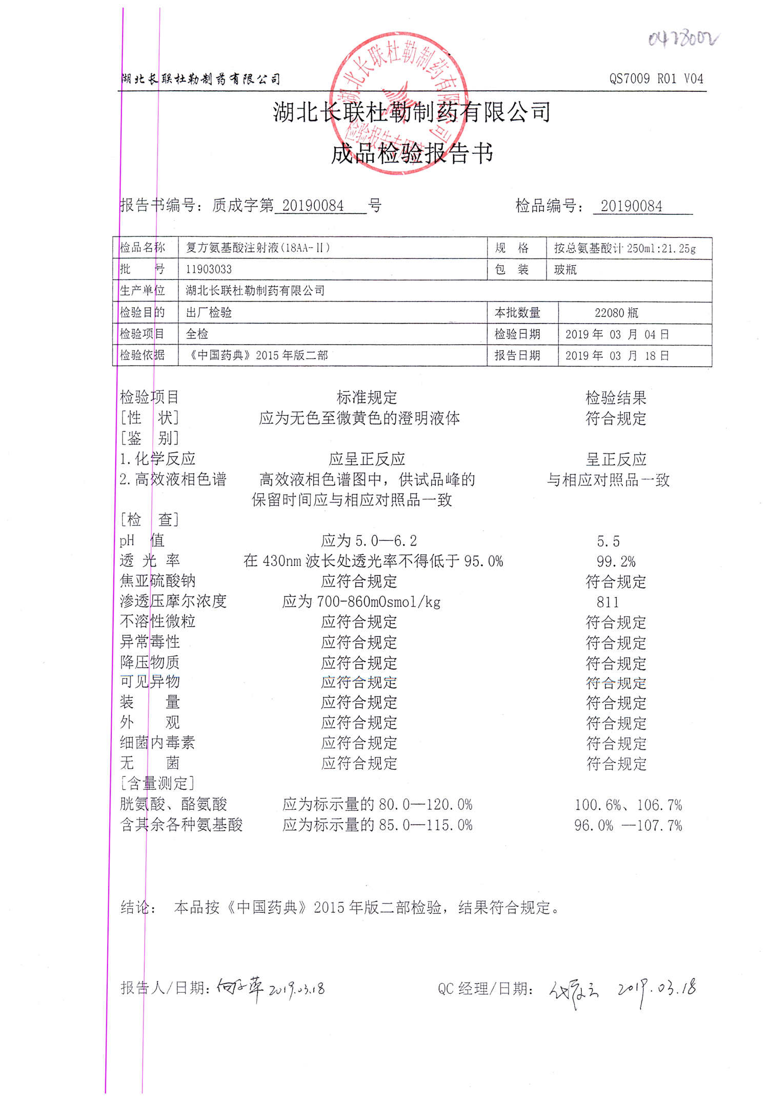 | 復方氨基酸注射液 | 250ml:21.25g | 11903033 | 查看詳情 |