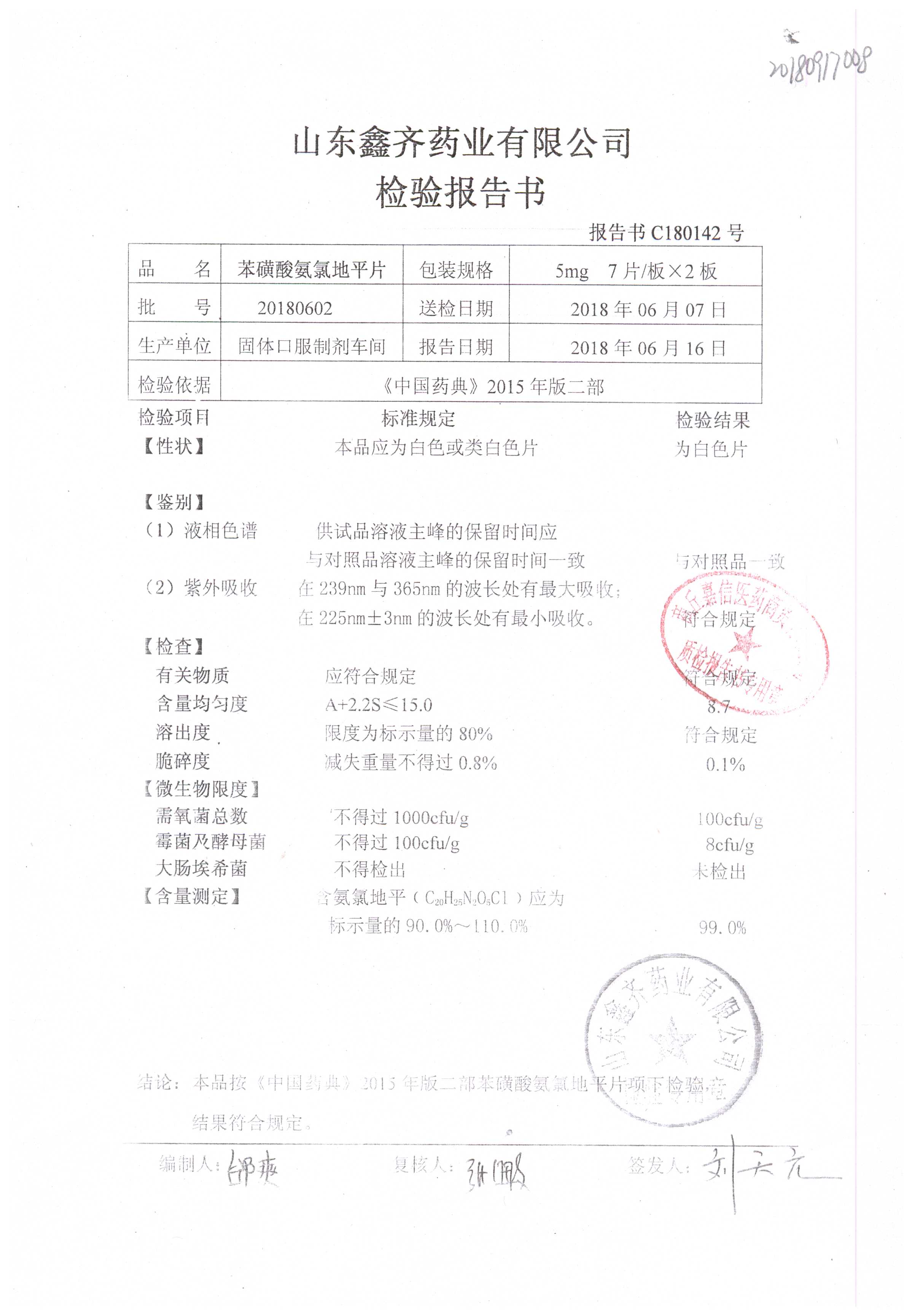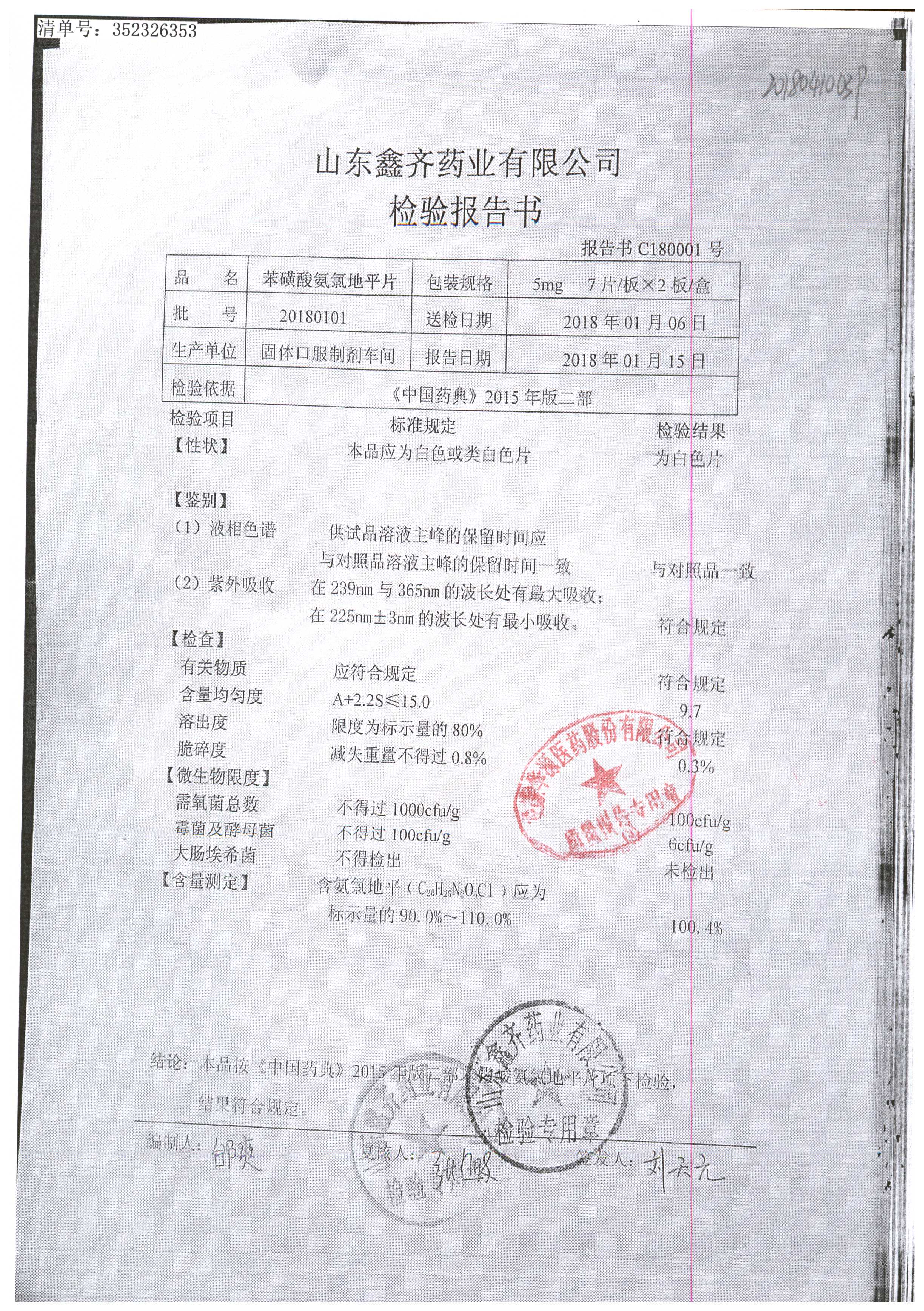 | 苯磺酸氨氯地平片 | 5mg*14s | 20180602 | 查看詳情 |