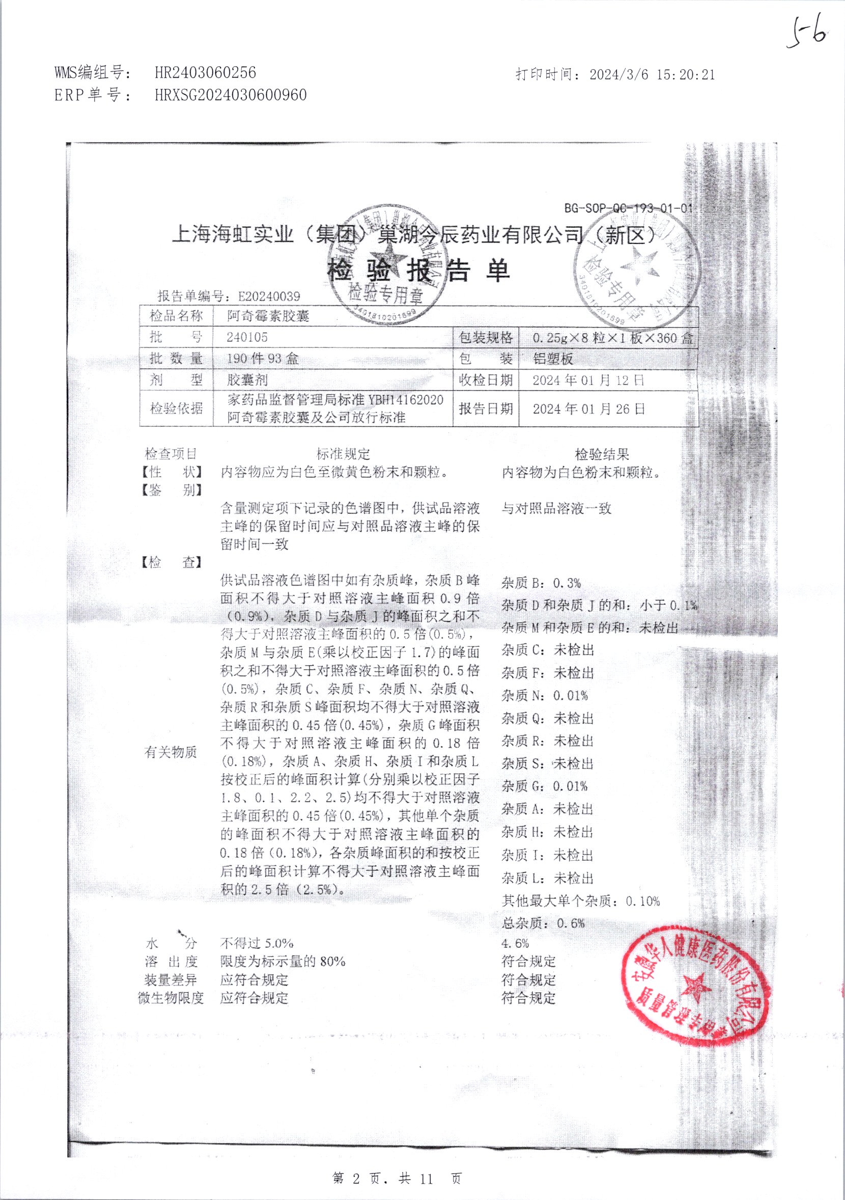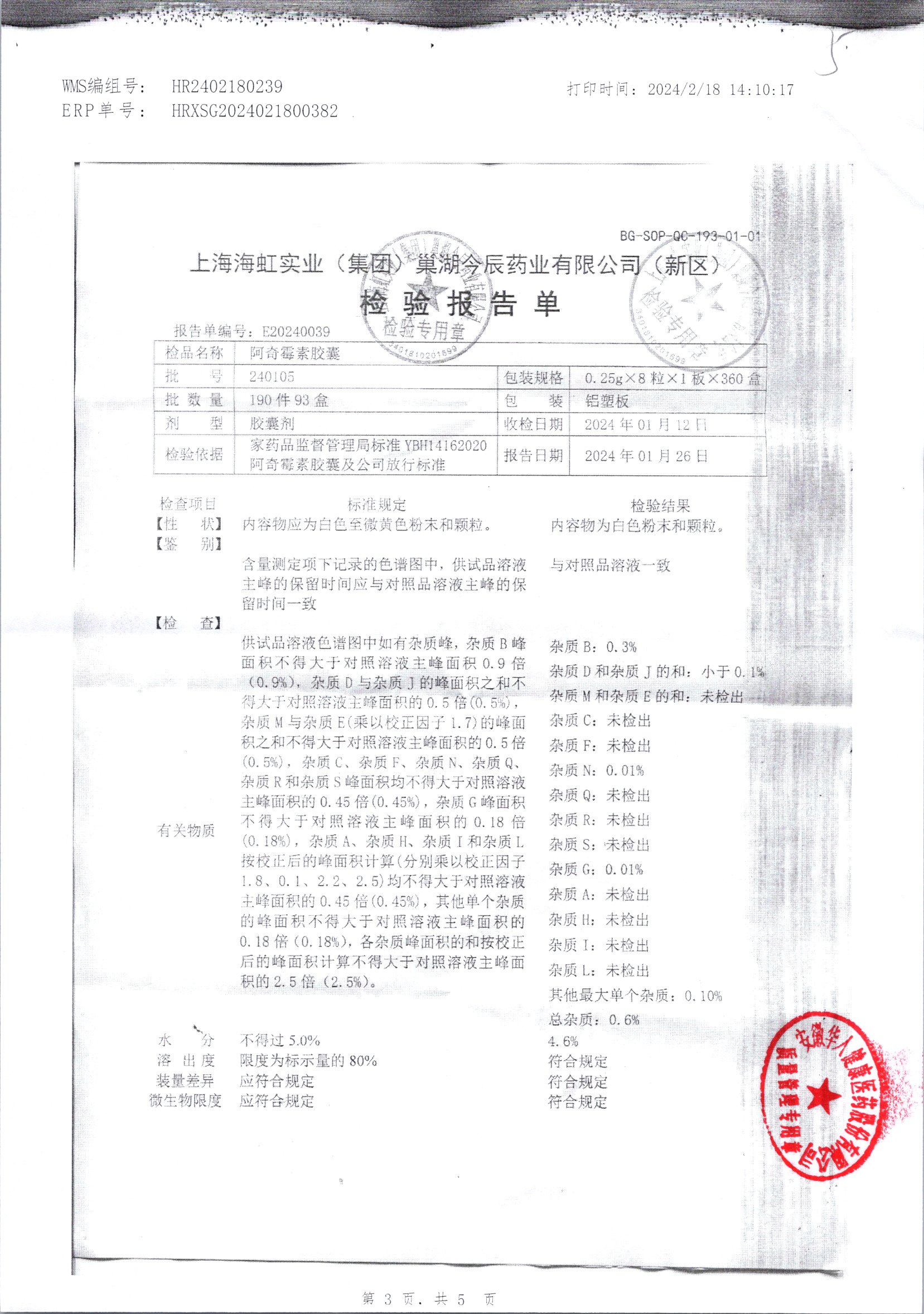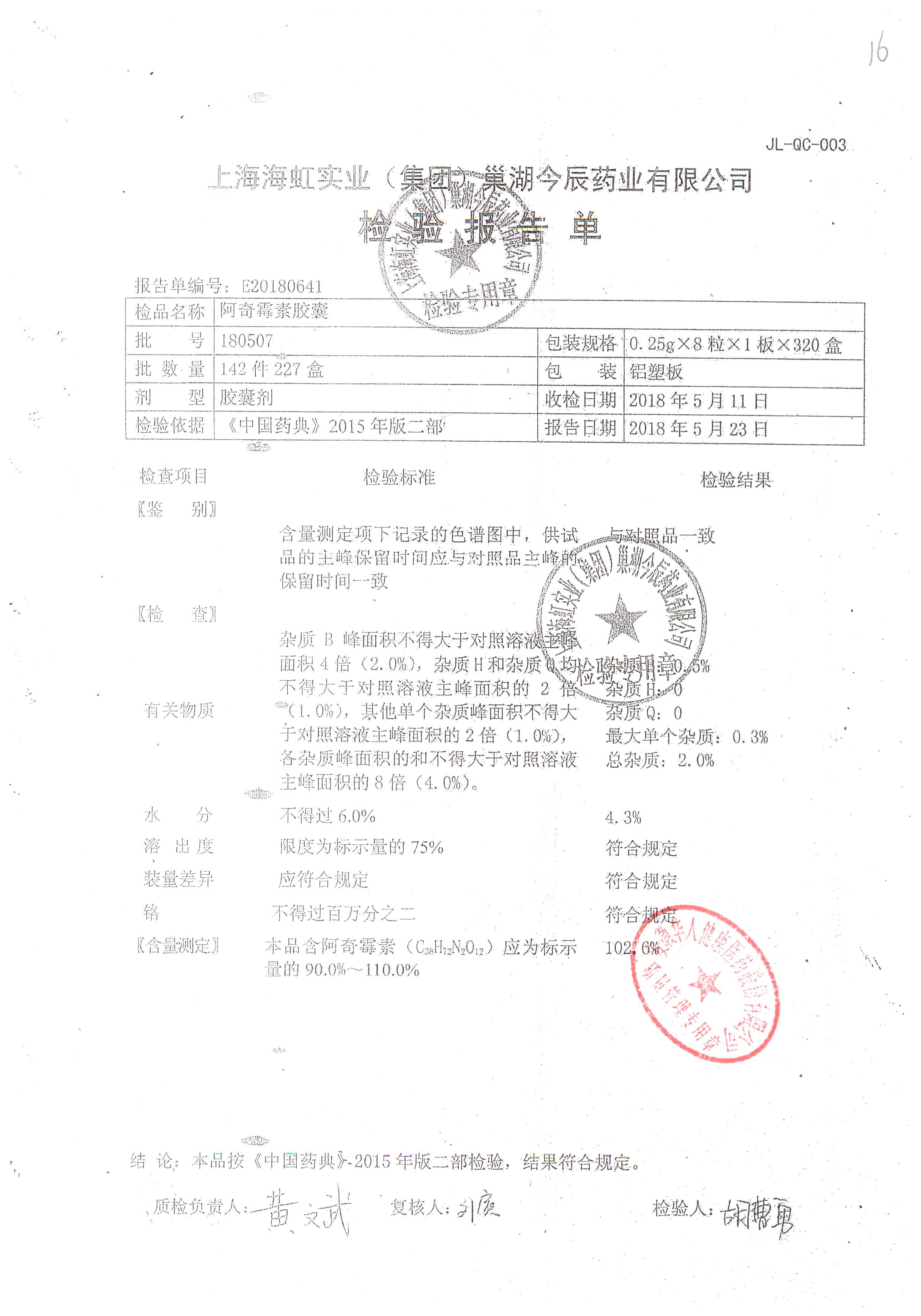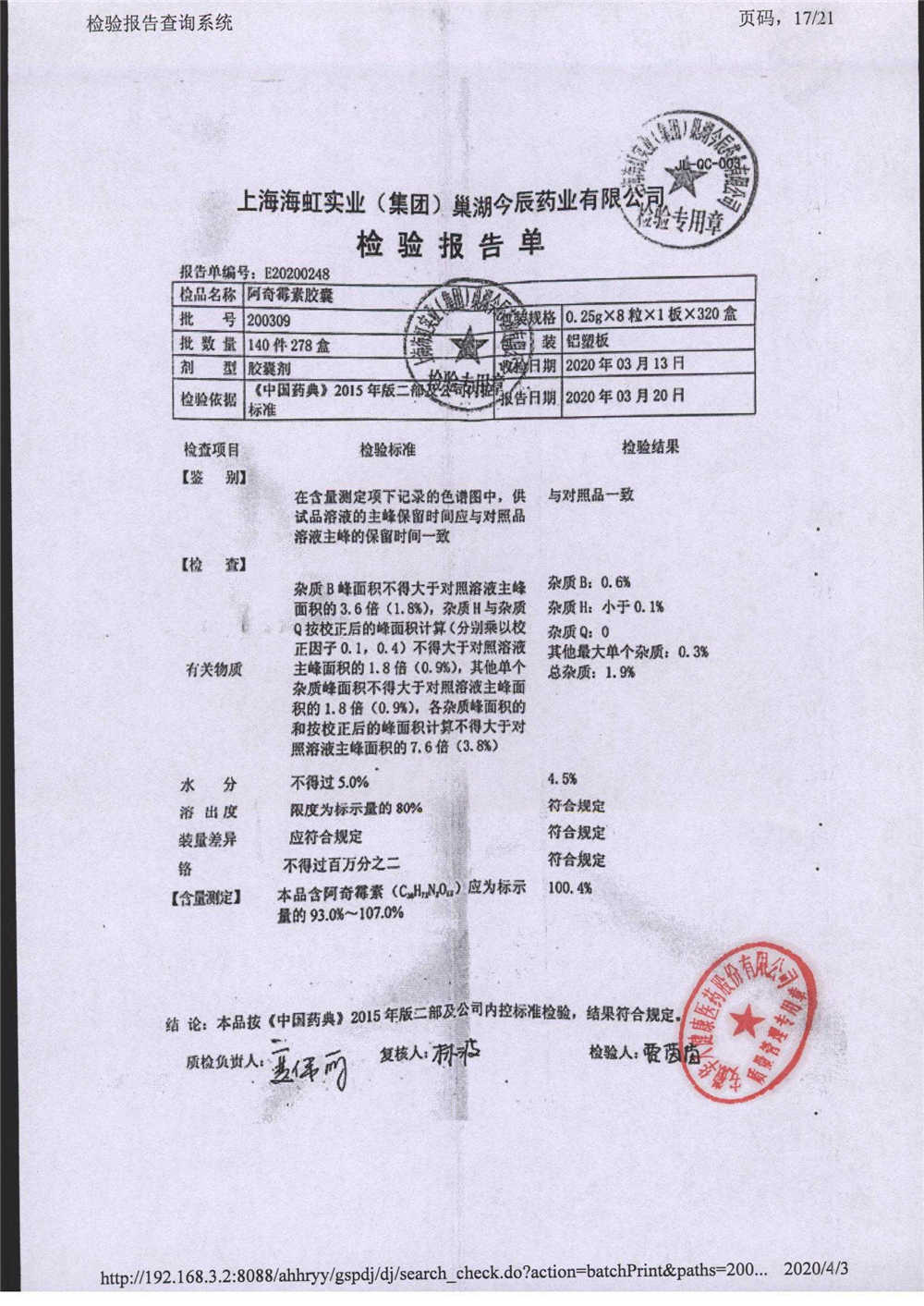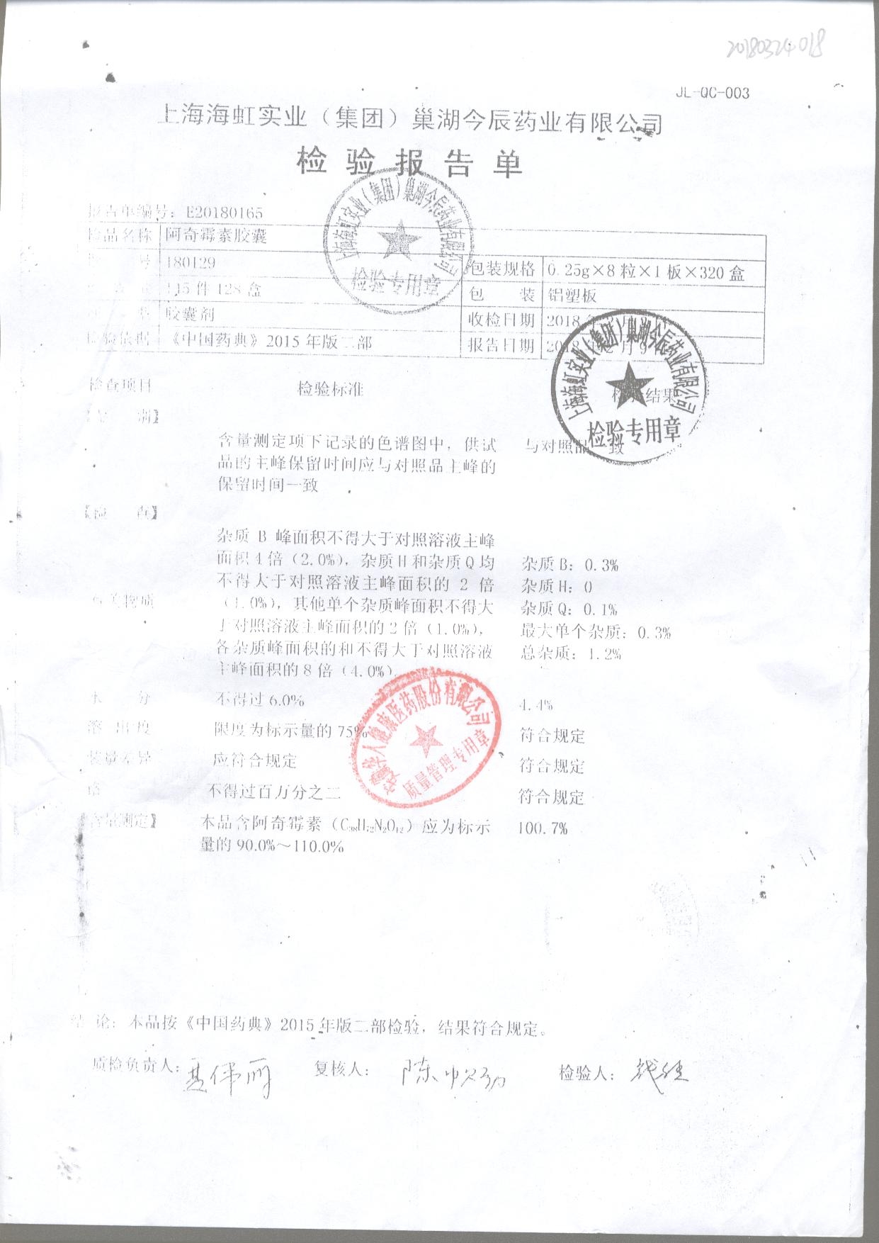 | 阿奇霉素膠囊 | 0.25g*8s | 210303(1/2) | 查看詳情 |