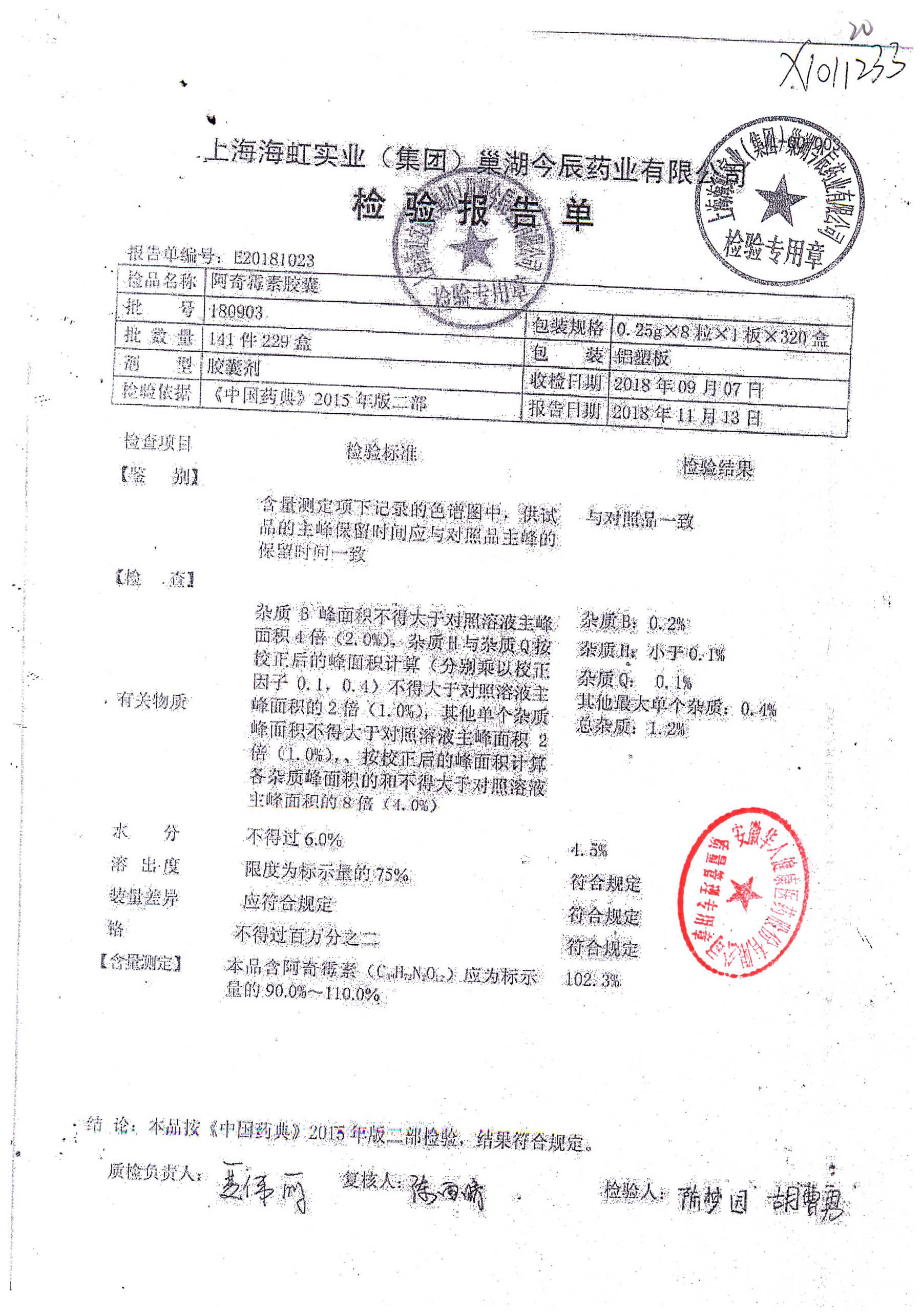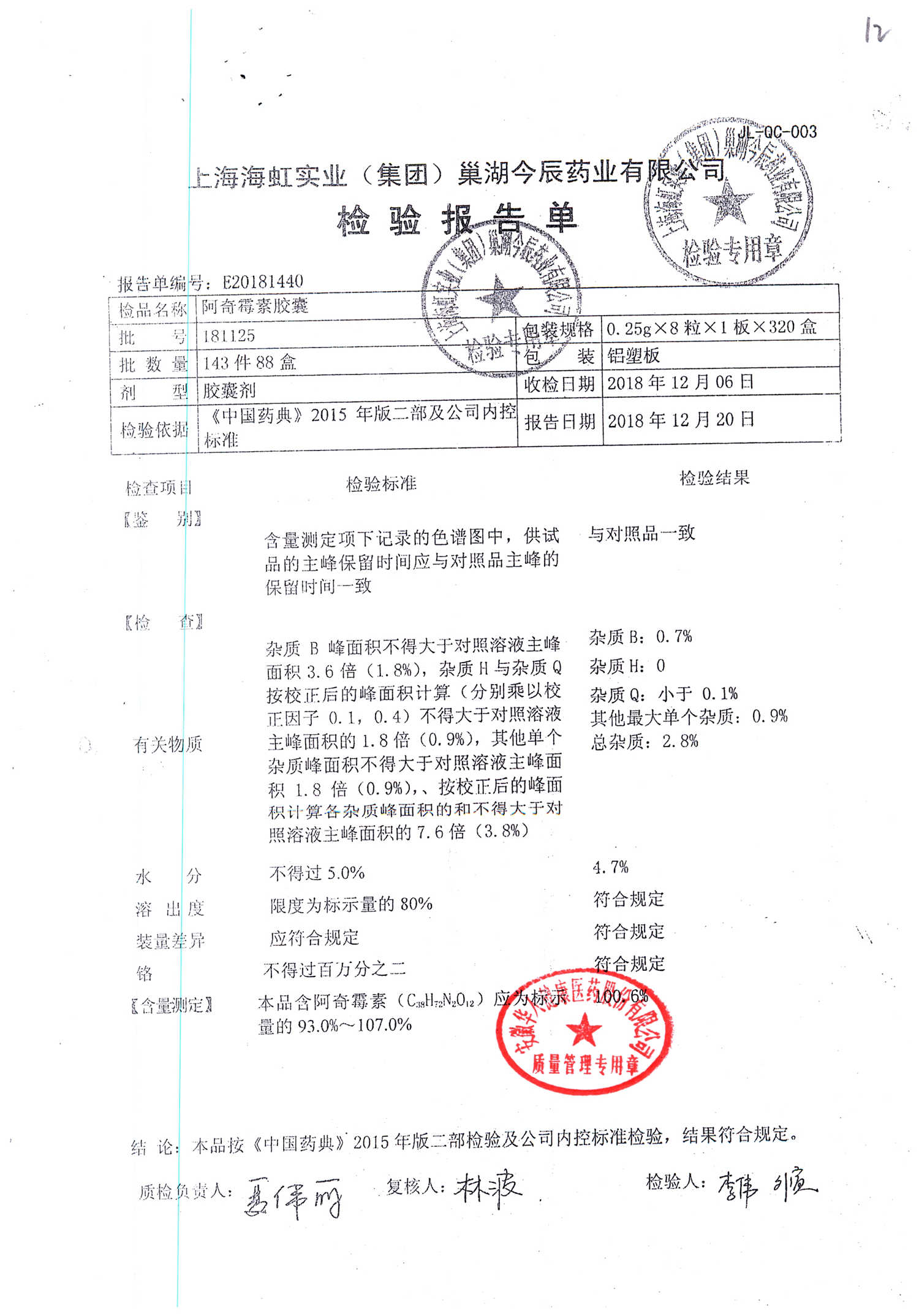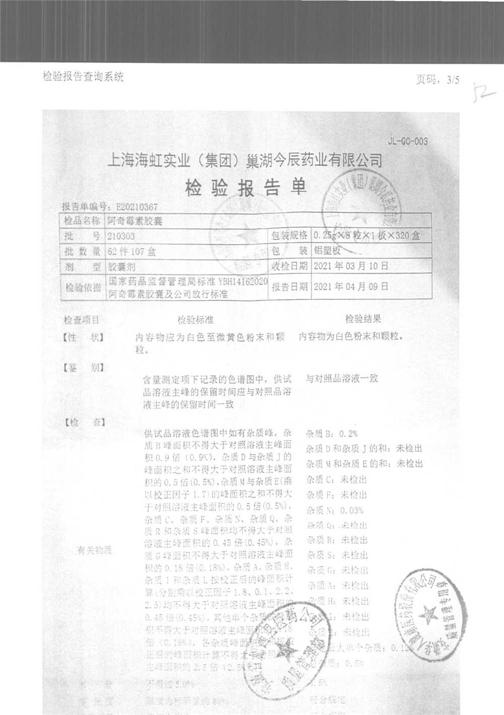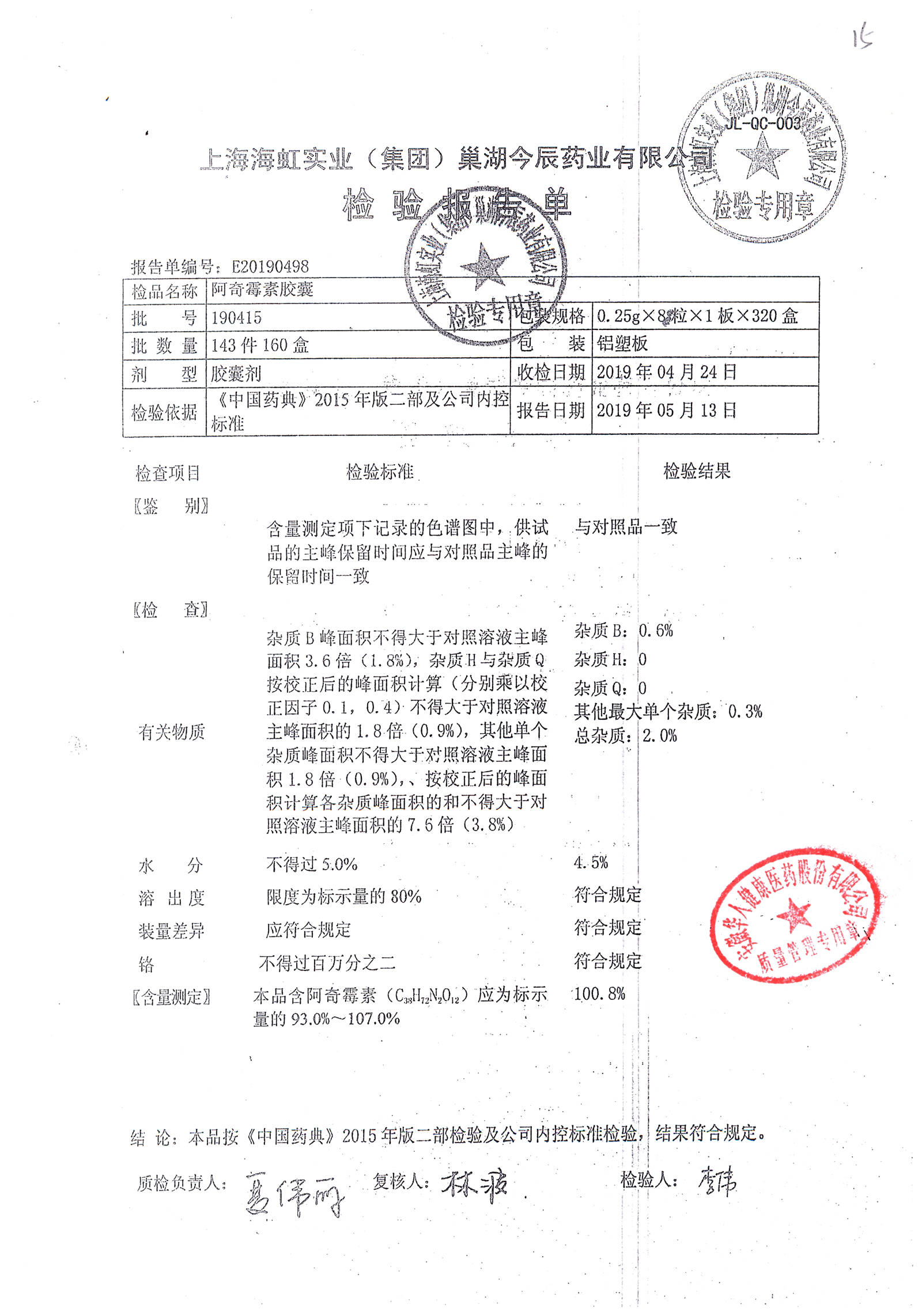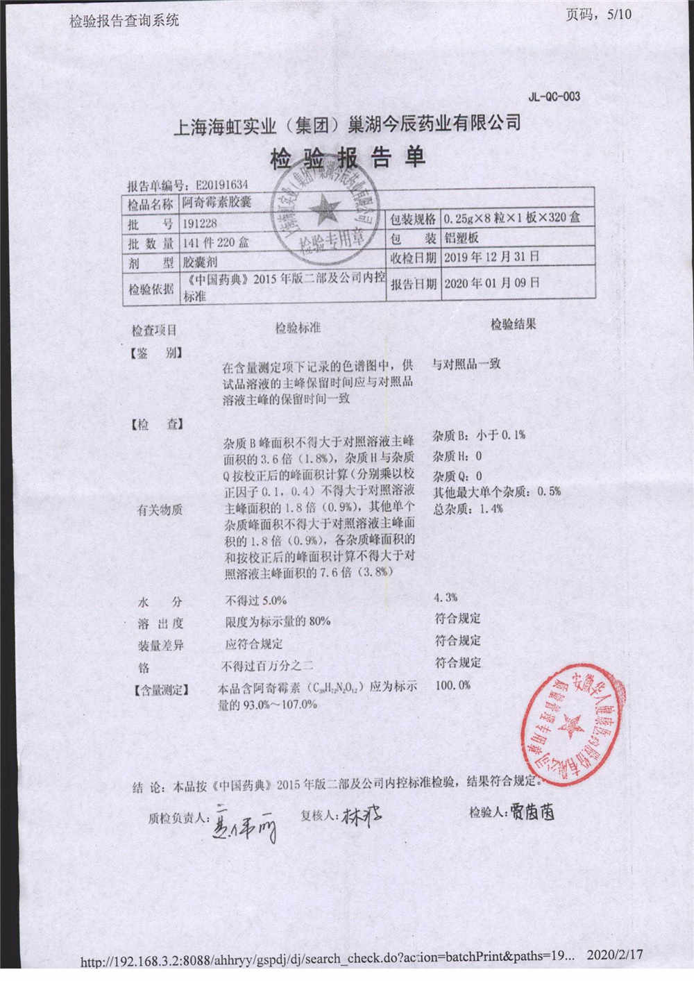 | 阿奇霉素膠囊 | 0.25g*8s | 210303(1/2) | 查看詳情 |
