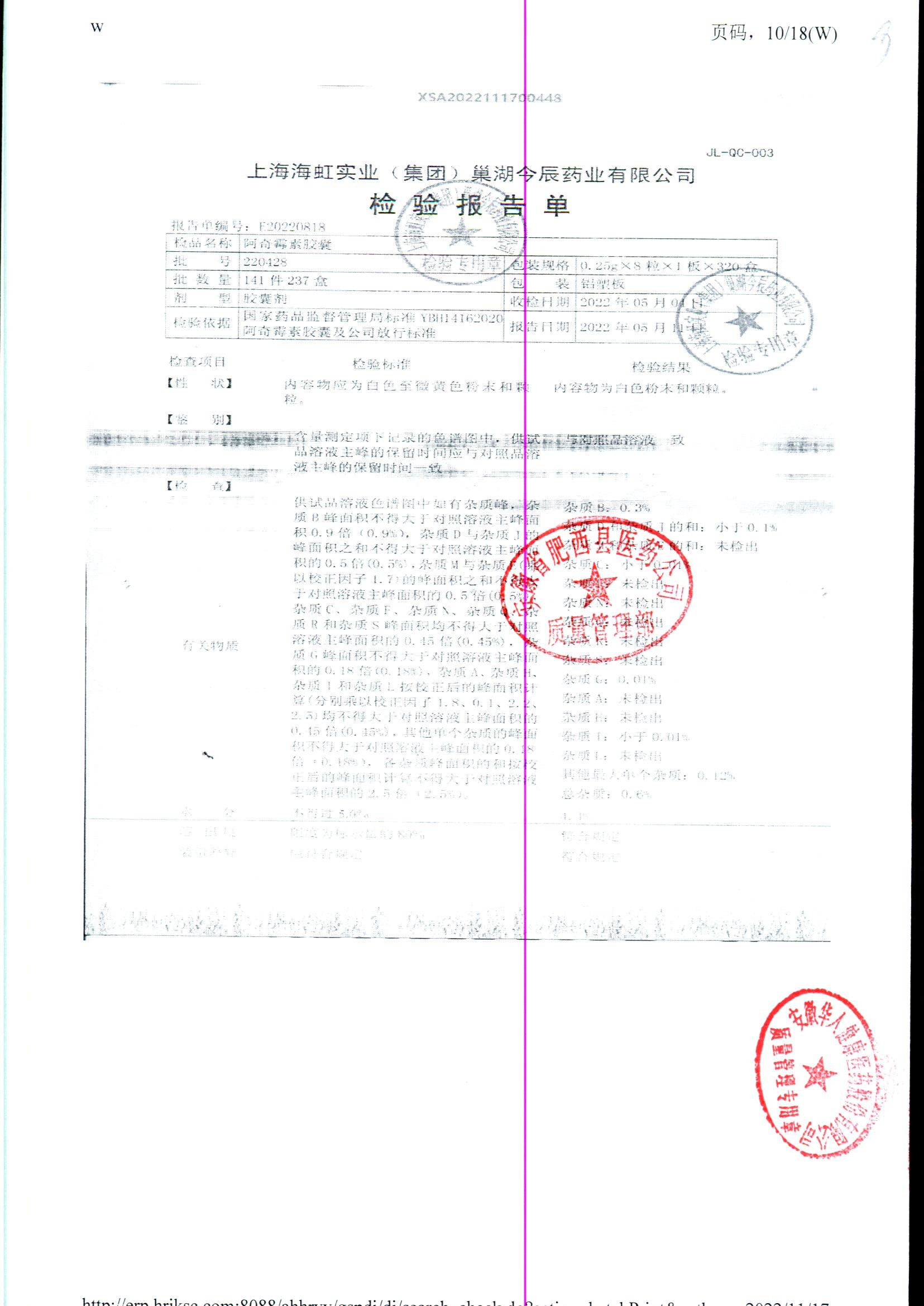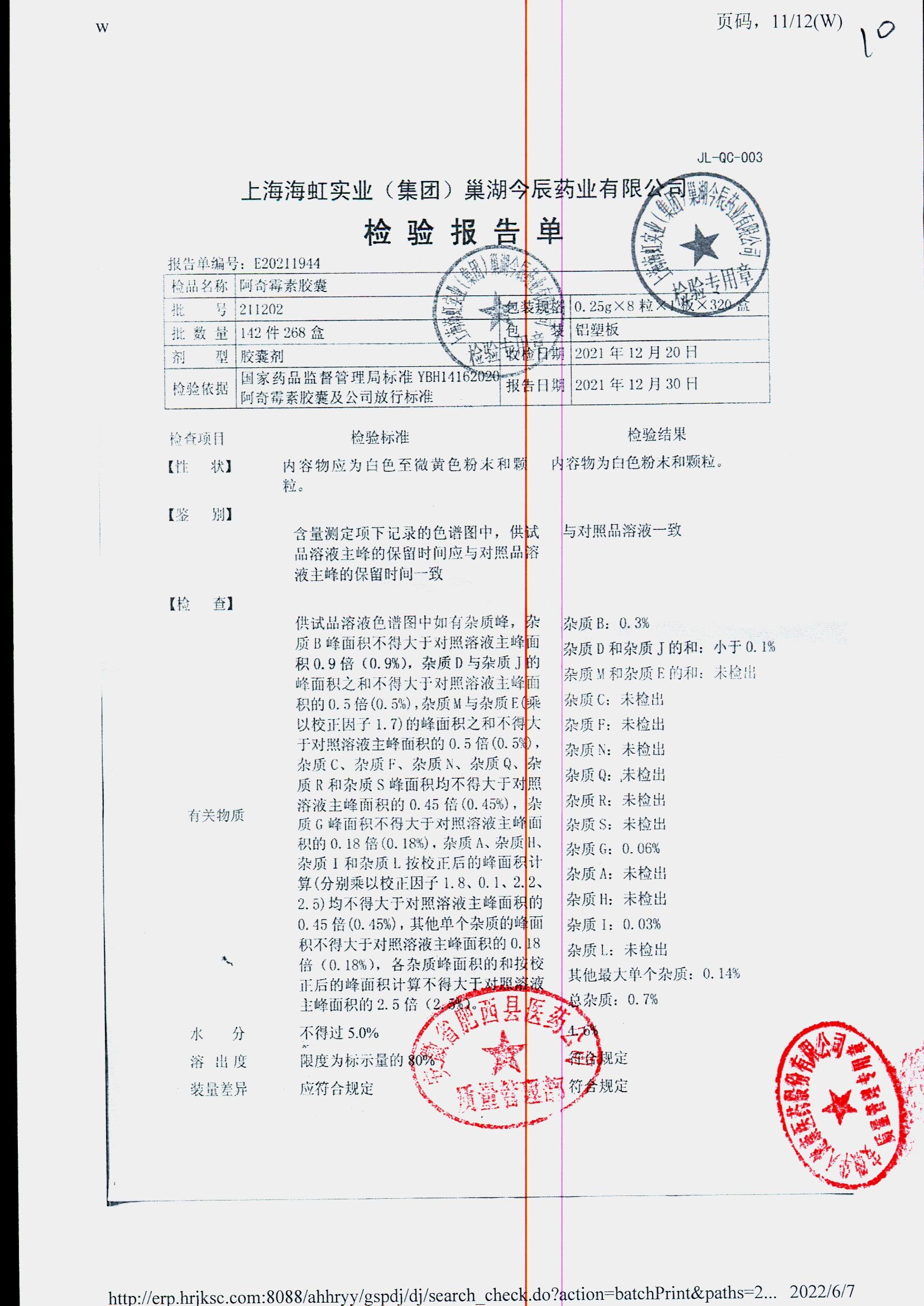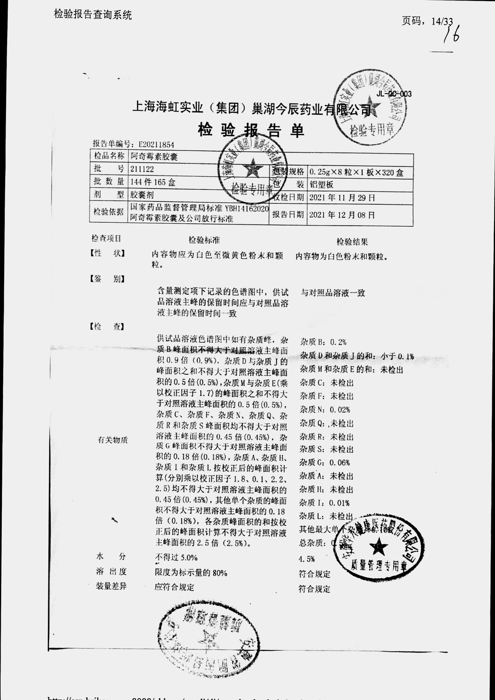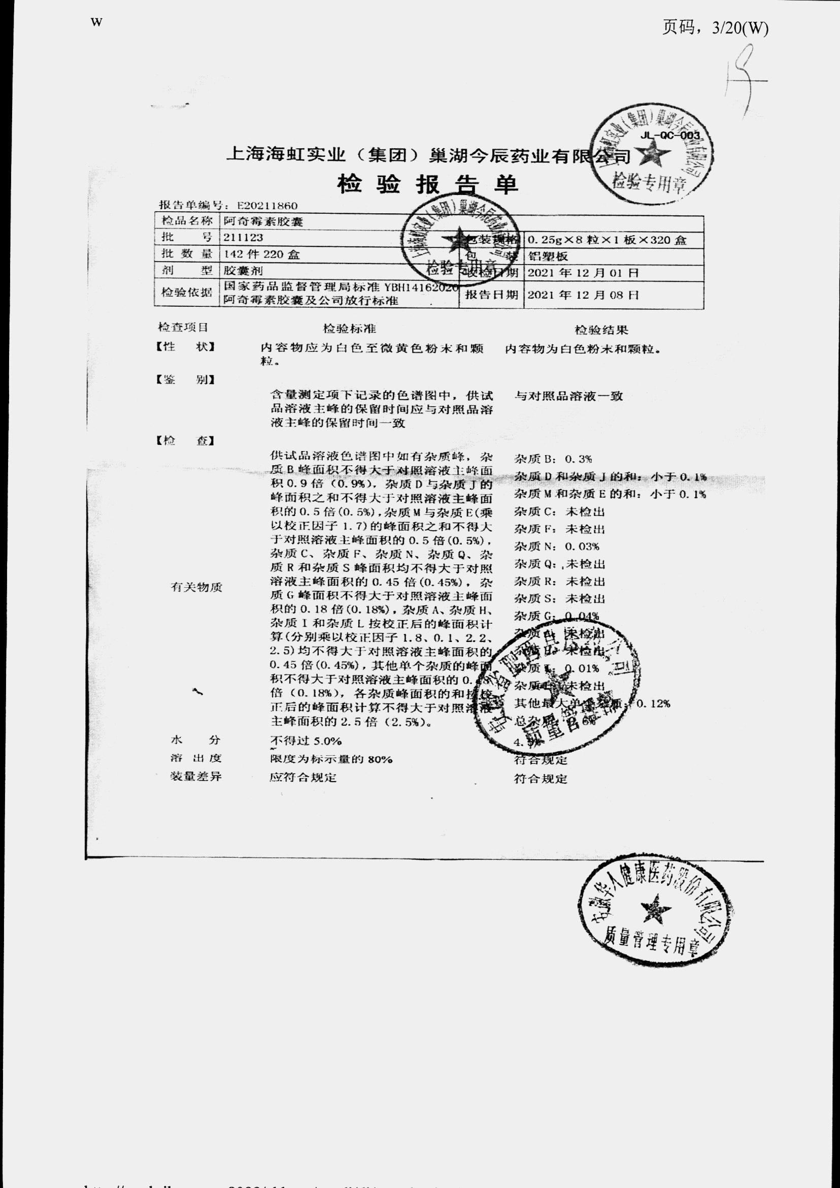 | 阿奇霉素膠囊 | 0.25g*8s | 211122-1 | 查看詳情 |